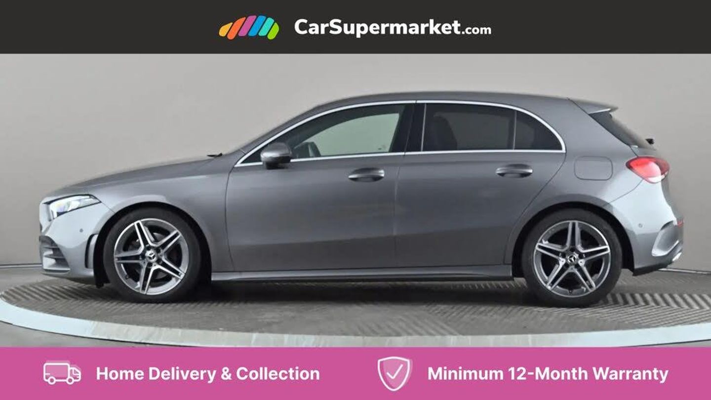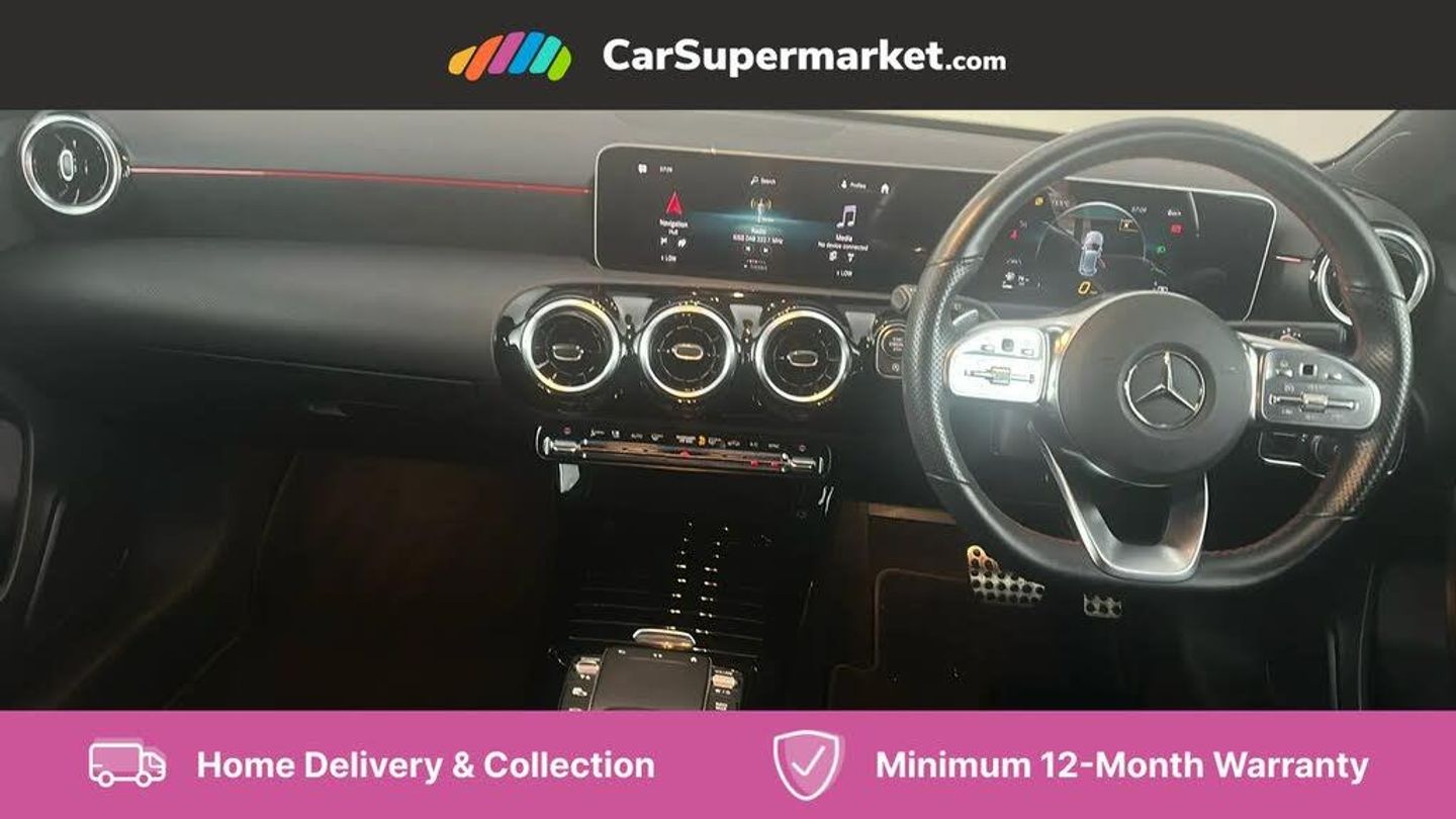 10.25" media display,180 degree rear view camera with parking guidelines,7" colour screen in instrument panel,Active parking assist with visual and audible warning of detected obstacles,Attention assist,Brake pad wear indicator warning light,Car wash mode,Cruise control + speed limiter,Direct steering,Dual bluetooth interfaces,DYNAMIC SELECT with a choice of driving modes (ECO, Comfort, Sport and Individual),ECO start/stop function,Fluid level warning indicator for fuel, oil, coolant and washer fluid,Hard-disk navigation,Hey Mercedes Voice activation,Lamp failure indicator,Mercedes me connect including emergency call system, accident recovery, breakdown and maintenance management,Mercedes me remote services,Outside temperature gauge,Owners manual in English,Pre-installation for private car sharing,Preinstallation for Mercedes Benz link,Service indicator (ASSYST),Speed sensitive power steering,Trip computer,Ultrasonic sensors positioned in the front and rear bumpers,Lowered comfort suspension,Rear axle torsion beam,2 USB ports (type C) in rear stowage compartment and one in front of center console,6 speakers,DAB Digital radio,MBUX multimedia system with DAB digital radio and touchpad including satellite navigation,Mercedes-Benz sound system - 100W,4 Electric Front and Rear windows,Adaptive brake lights,AMG bodystyling - Front apron with splitter in chrome, rear apron with chrome trim and chrome visible trim elements in tailpipe,Black weather strip,Body colour bumpers,Body colour door handles,Body colour side skirt,Body coloured door mirrors,Chrome beltline trim,Diamond radiator grille with chrome pins and silver louvre + chrome insert,Electric adjustable and heated door mirrors with integrated LED side indicators,Exhaust system - Twin visible tailpipes in polished stainless steel,Headlamp assist automatic headlamp activation,Heated glass rear windscreen + timer control,LED high performance headlamps with integrated LED daytime running lights,LED tail lamp,LED third brake light,Privacy glass,Radio aerial,Rain sensing windscreen wipers with two sensitivity settings,Rear fog lights,Rear wiper,Window line trim strip in chrome,3 Spoke flat bottom leather multi function steering wheel with perforated leather in grip area,40:20:40 split folding rear seats,Artico man-made leather/Microfibre Dinamica upholstery with red contrast stitching,Auto Mercedes-Benz child seat recognition sensor,Black air vents with surround in silver chrome,Black roof lining,Brushed stainless steel sports pedals with rubber studs,Controller on centre console with chrome surround,Front centre armrest with storage compartment,Front door sills with Mercedes Benz lettering,Front seat backs luggage nets,Front seat cushion length adjustment,Galvanished gear shift paddles on steering wheel,Height/reach adjustable steering column,Interior mirror with reading lamps in black and frameless,Manual height adjustable front seats,Rear head restraints,Seat occupancy sensor for front passenger seat,Sports seats with integrated headrests,Stowage compartment in centre console with retractable cover,Sunvisors with illuminated vanity mirrors,Touchpad on center console,Twin front cupholders,Two zone thermotronic luxury automatic climate control,Light and sight pack - A Class,Mirror package - A Class,Seat comfort pack - A Class,3 rear 3 point seatbelts,ABS with Brake Assist,Active bonnet,Active brake assist includes forward collision warning system with autonomous braking,Adaptive brake assist with hold function and hill start assist,Black seatbelts,Childproof locks manually operated for rear doors and electrically operated for rear power windows,Crash responsive emergency lighting,Driver and passenger head and side airbags,Drivers knee airbag,Dual stage driver/passenger airbags,Electronic parking brake,ESP curve dynamic assist,ESP with ASR,Front and rear seatbelt reminder,Front brake callipers with Mercedes Benz lettering,ISOFIX and top tether child seat fixing points in two outer rear seats,Tyre pressure monitoring system,Warning triangle and first aid kit,Window airbags,Alarm system/interior protection/immobiliser,Keyless Go,Remote central locking and crash sensor with emergency opening function,Urban guard vehicle protection system with immobiliser and interior protection,Dinamica microfibre trim in black,18" AMG 5 twin spoke light alloy wheels in titanium grey with highsheen finish,Summer tyres,Tirefit sealant kit