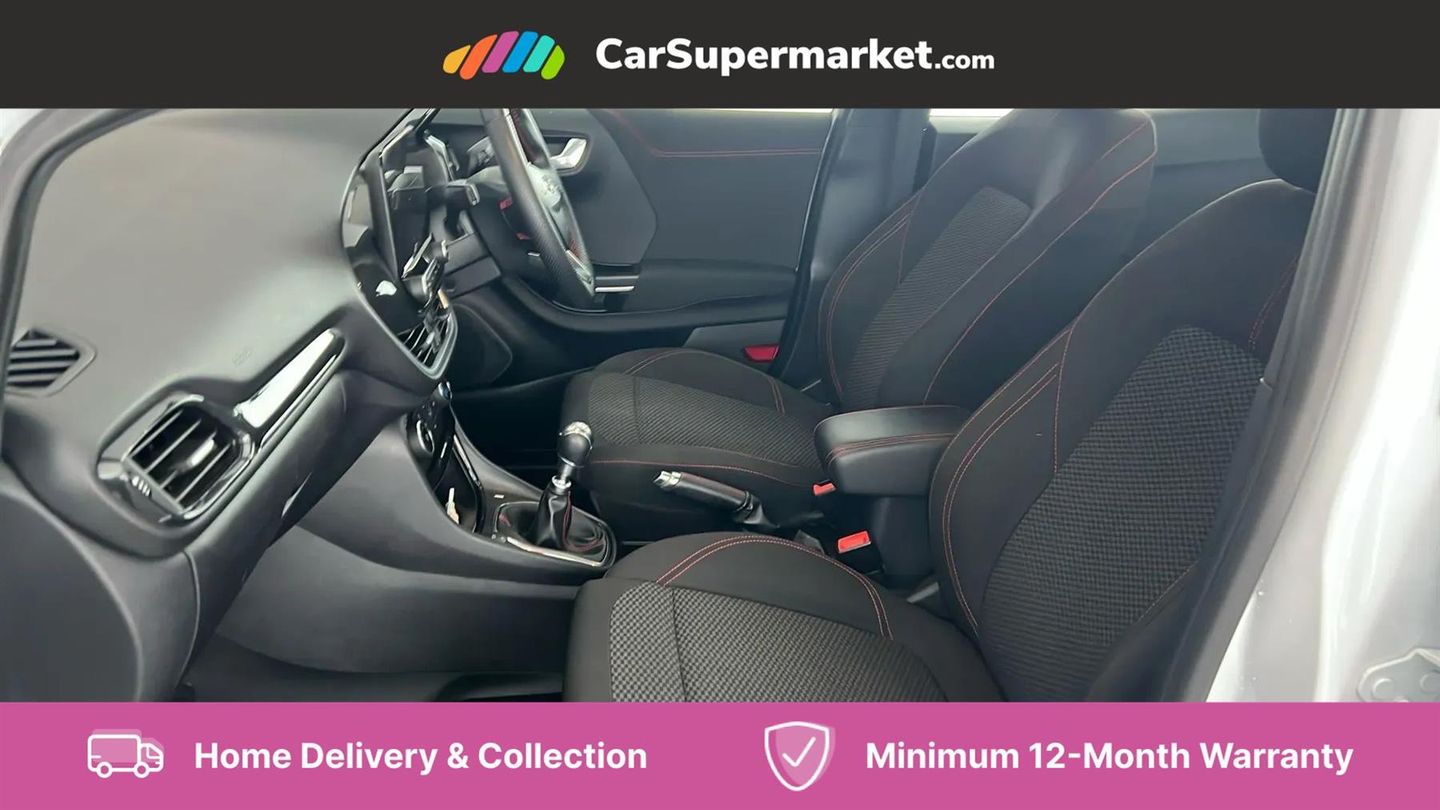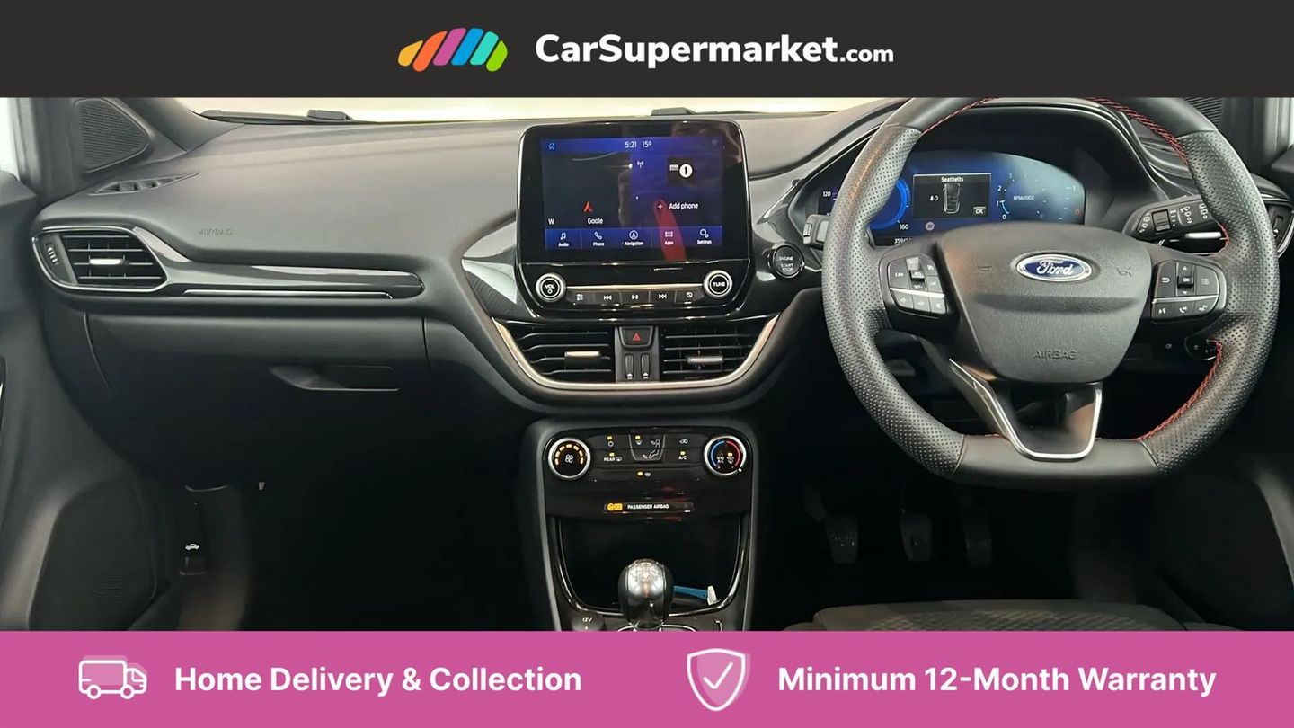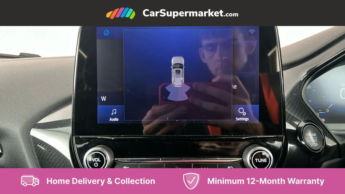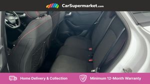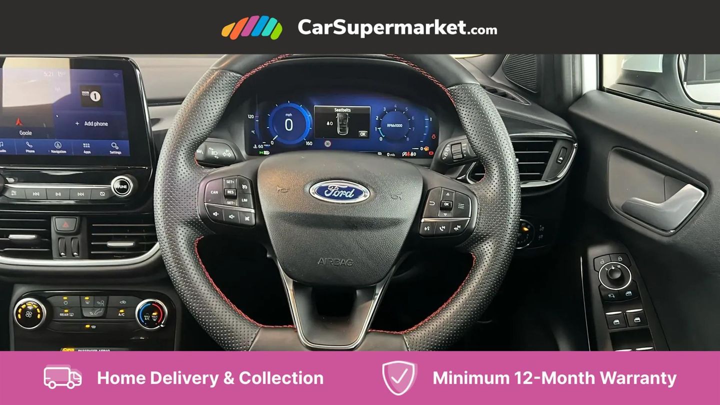 Driver impairment monitor,Emergency call service,Ford easy fuel,Full digital 12.3" instrument cluster,Lane keeping aid with lane departure warning,Power assist steering,Power start button,Rear parking sensor,Selectable drive modes(Normal, sport, Eco, trail, slippery),Speed sign recognition,Sport suspension,Automatic headlights with auto high beam,Automatic rain sensing wipers,LED rear lamps,Power foldable heated door mirrors with puddle lamps,Projector headlamps with LED day time running lights and front fog lamps,Quickclear heated windscreen,Rear side wing doors,Rear wiper,ST-Line body styling kit with unique grille and large body colour rear spoiler,Third brake light,3 seat bench in 2nd row,Centre console with armrest and stowage,Ford megabox extended bootspace,Front and rear head restraints,Manual 2 way passenger seat adjustment,Manual 4 way driver seat adjust with lumbar adjustment,Single front passenger seat,ST- Line cloth trim with red stitching,ST-Line flat bottomed sensico leather steering wheel with leather handbrake and aluminium gear knob,Ford SYNC 3 navigation pack - Puma,3 rear seatbelts,Child safety lock,Electronic stability control (ESC) and hill start assist,Pedestrian/cyclist detection & post-collision braking,Pre collision assist with autonomous emergency braking,Tyre pressure monitoring system (TPMS),Thatcham alarm,Frozen White