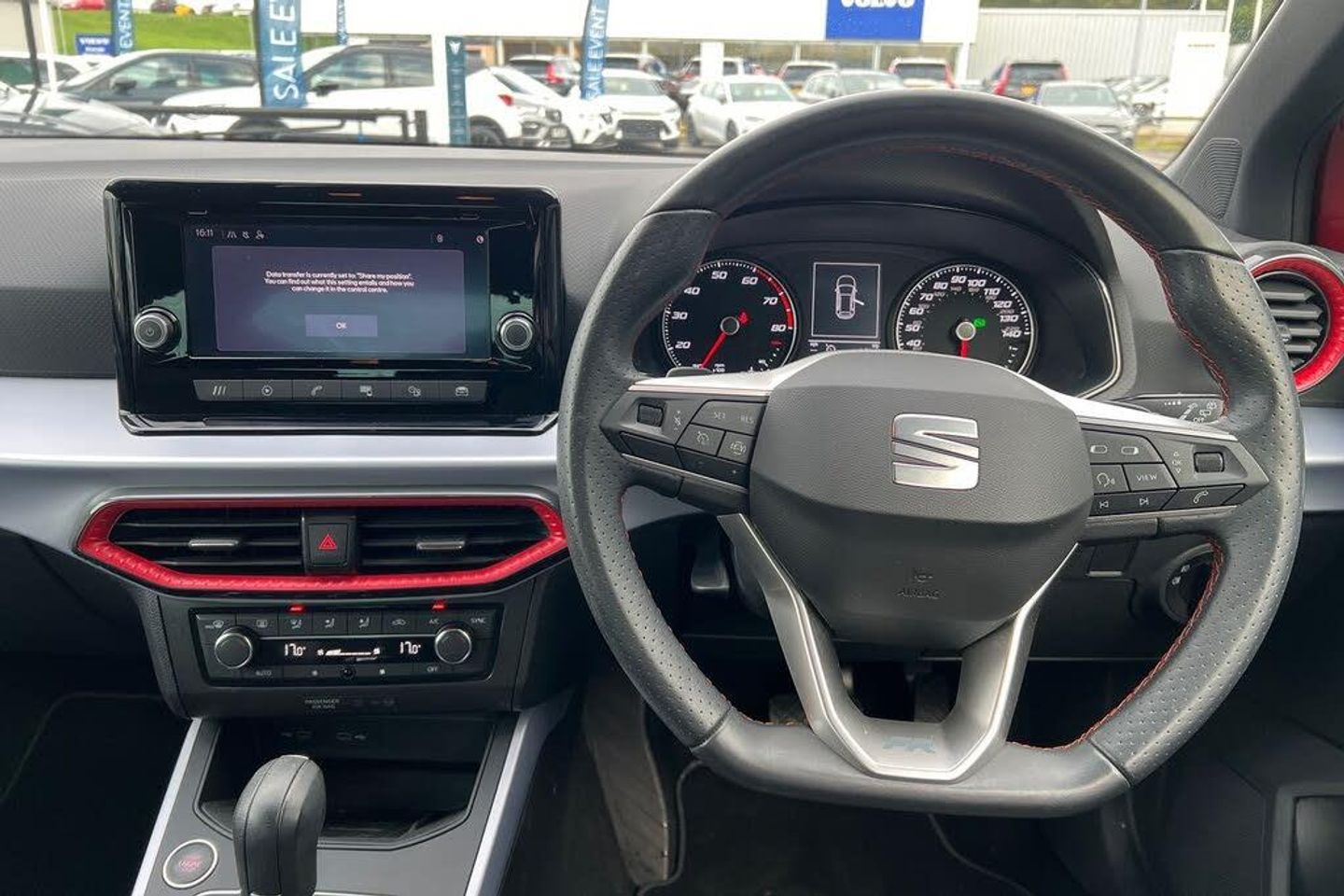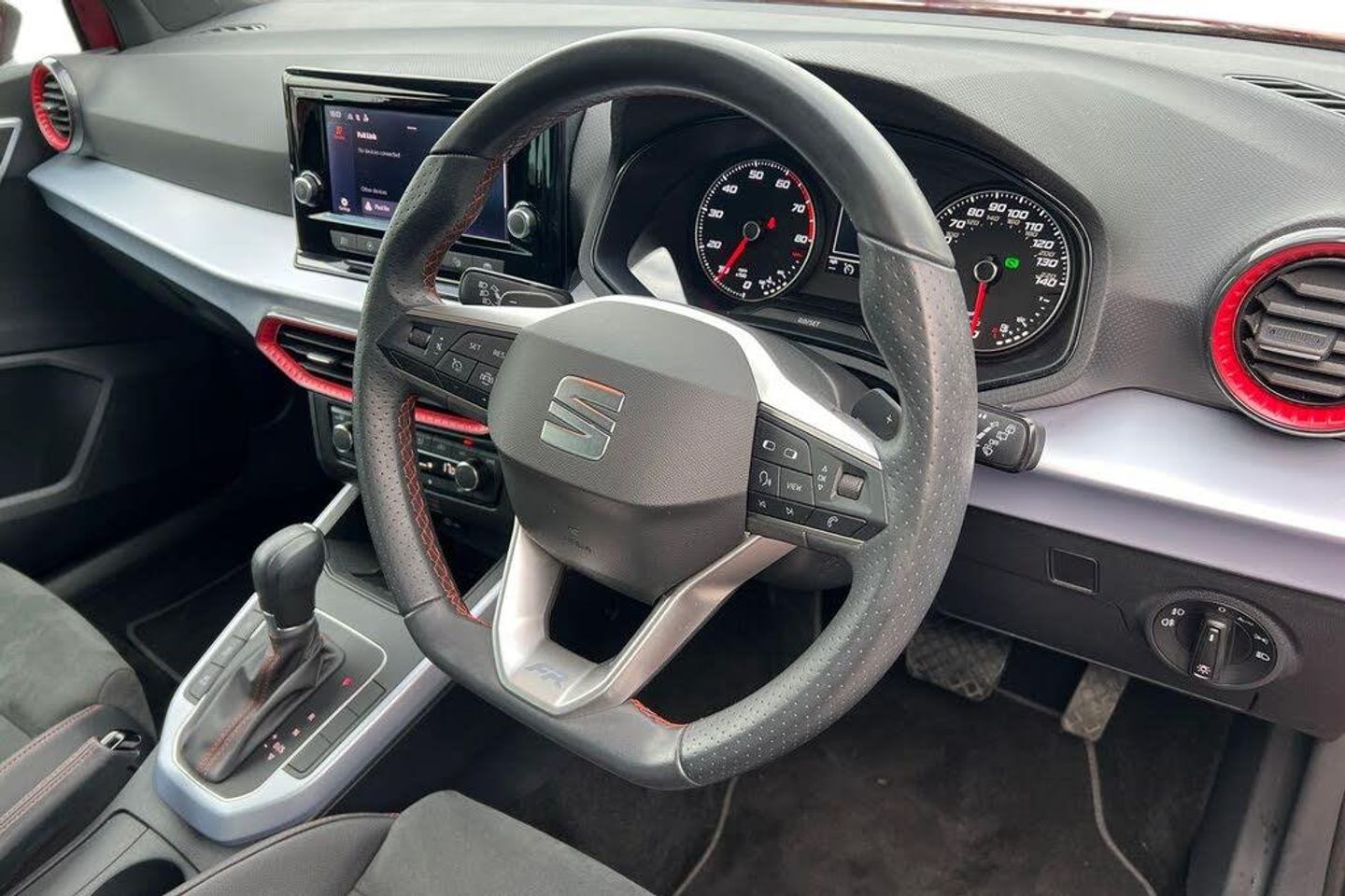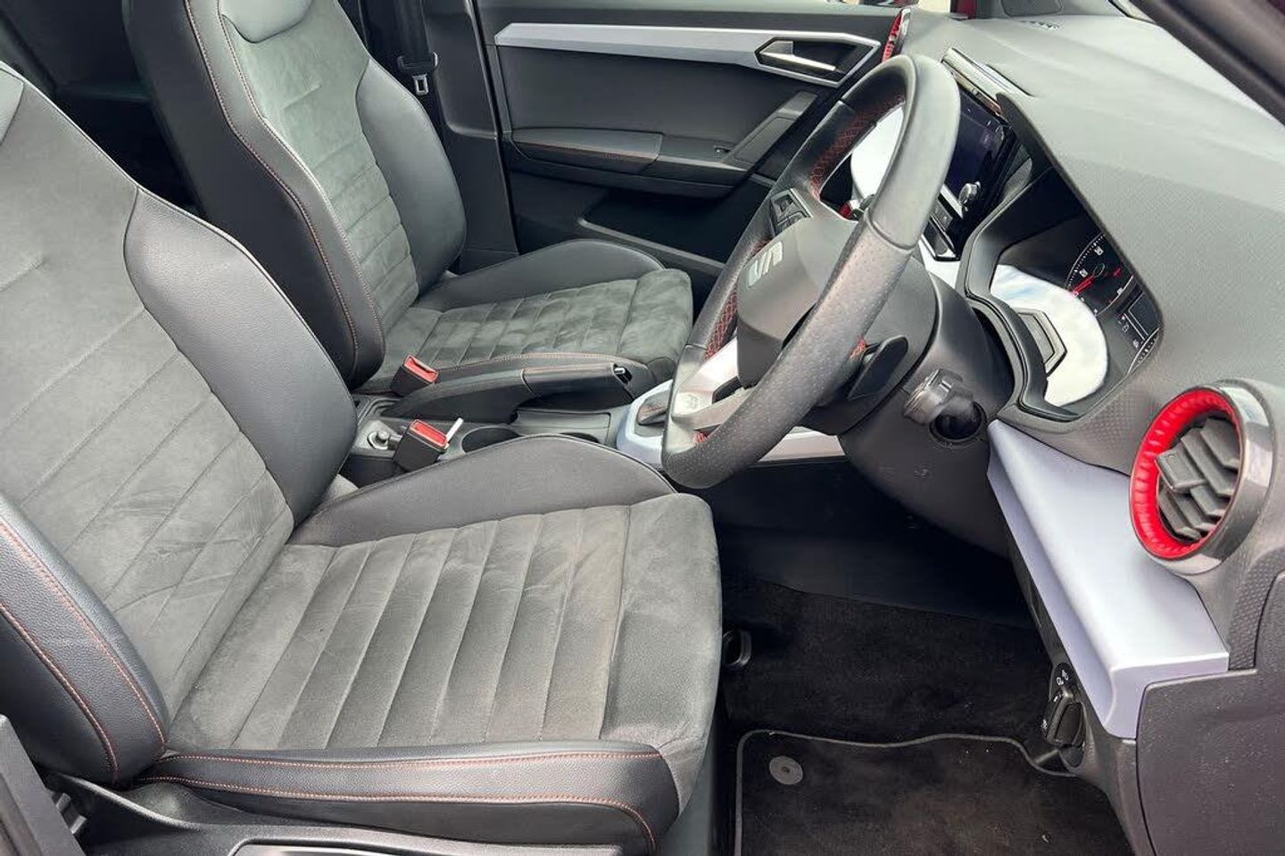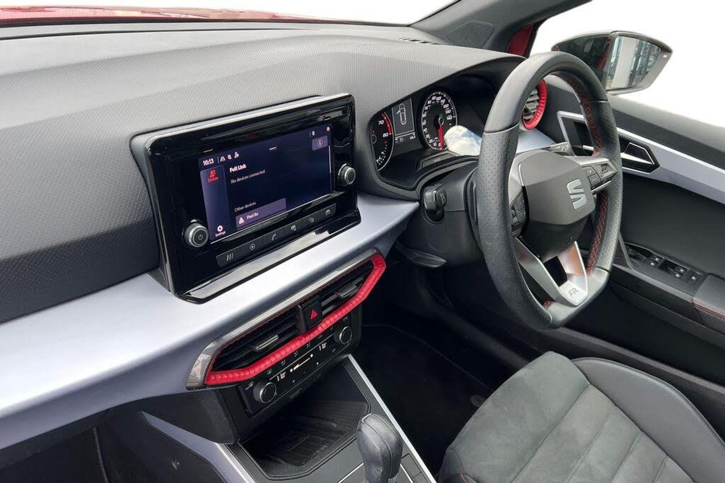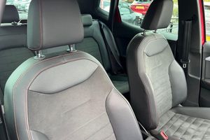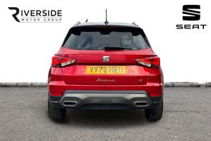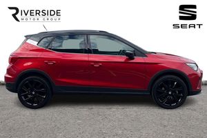 Microsuede - Black with Lava Red Stitching, Seat Approved Programme, 12 Month Seat Approved Warranty, No Administration Fees Applicable, Complimentary 5 Day Drive Away Insurance, up to 24 Months Seat Approved Warranty, Metallic paint with contrast roof, Metallic - Desire Red with black roof, Microsuede cloth - Black with Contrast lava red stitching, Dark tinted rear windows, Electric front/rear windows, Rear window wash/wipe, Windshield wiper with intermittent control and potentiometer, Anti theft roof antenna, Body coloured bumpers, Body coloured door handle inserts, Chrome roof rails and window surrounds, Protective side mouldings, Rear side wing doors, Rear spoiler, Twin exhaust pipe styling hidden exhaust pipe, Visible VIN plate, Automatic activation of hazard warning lights, Front fog lights with cornering function and rear fog light, FULL LED automatic headlights with dynamic headlight range control, coming and leaving home, LED daytime running lights, LED rear tail lights and licence plate lights, Third brake light, ABS, Electronic stability control, Emergency Brake Assist (EBA) and front assist, Hill hold control, Multi-Collision braking, Traction control, Electric speed sensitive power steering, Lane keeping system, Rear parking sensor, SEAT Drive profile - Four different models normal-sport-eco-individual, steering response, throttle response and gear shifts mode, Dimming rear view mirror, Electrically adjustable and heated door mirrors, Roof colour door mirrors, 3 point seatbelts on all rear seats, Active front headrests, Child locks on rear doors, Driver and front passenger airbags with front passenger airbag de activation, front side and curtain airbags, Front and rear seatbelt reminder, Tiredness recognition system, Tyre pressure monitoring system, E-call, Bluetooth interface for hands free and audio streaming, DAB digital radio and AM/FM radio, Media system with 8.25" colour touchscreen with USB port (type c), Steering wheel mounted audio controls, Wireless phone charger, 'Lights On' Reminder warning buzzer, Analogue cockpit with physical dials, Digital clock, Full Link Smartphone Integration with Mirror Link, Apple Car Play, Google Android Auto with USB Type C cable for Apple and Android compatibility, Low fuel warning light, Outside temperature display, RPM counter, Seat connect with safety, service and remote, Trip computer, Titan black dashboard, 3 seat bench in 2nd row, 60/40 split folding rear seat, Front comfort seats, Height adjustable front seats, ISOFIX points in outer rear seats with top tether anchorage points, Single front passenger seat, Two front and three rear height adjustable headrests, Aircare filter, Dual zone climate control, 2 cupholders, Black interior roof, Double boot floor, Gear shift indicator, Height/reach adjustable steering column, Microsuede cloth upholstery, Perforated flat bottomed leather steering wheel/gear knob/handbrake with red stitching and FR logo, Steering wheel mounted gearshift paddles, Front courtesy light with 2x front and 2x rear reading lights, Illuminated boot, Instrument lighting with brightness control, Interior ambient lighting, Interior light in footwell, central console and door panel, Driver sunvisor with covered mirror + card holder, Passenger sunvisor with vanity mirror, Interior chrome pack - Arona, Alarm with back-up horn, Electronic engine immobiliser, KESSY Keyless entry and go, Locking wheel bolts, Remote central locking + deadlocks, Tow away protection