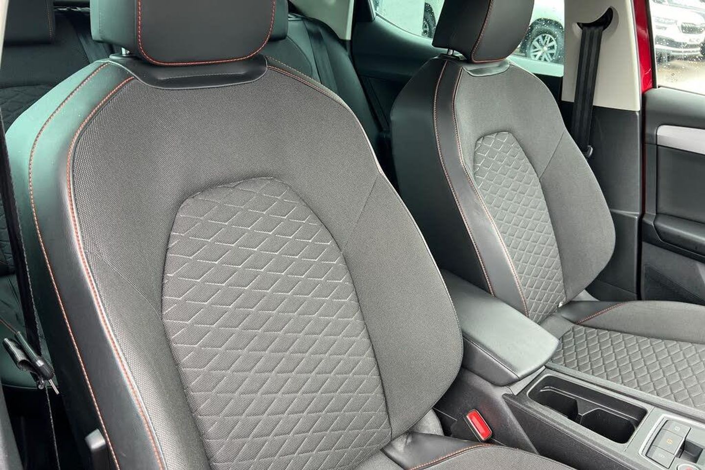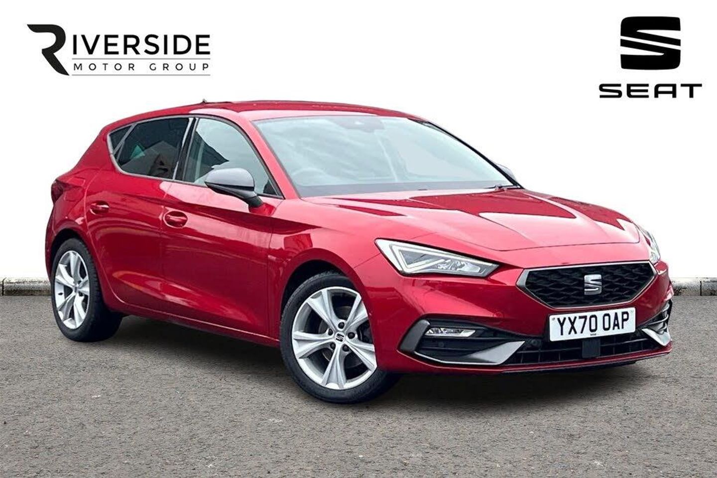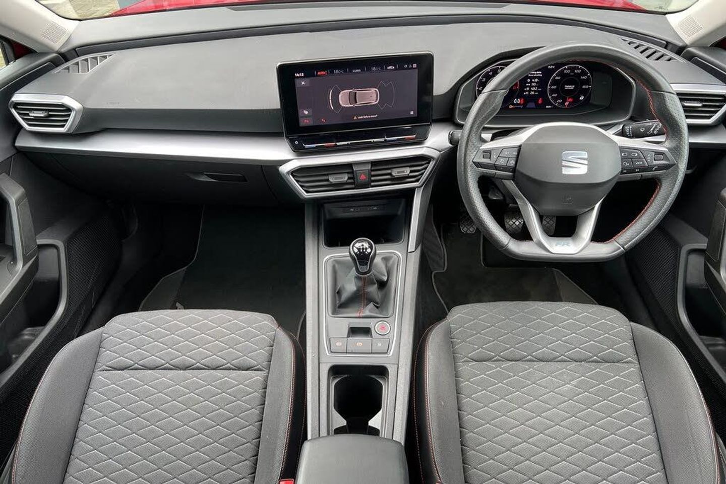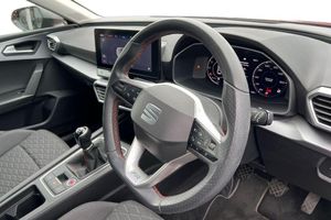 Seat Approved Sale, 12 Months Seat Approved Warranty, No Administration Fees Applicable, Complimentary 5 Day Drive Away Insurance, Up to 24 Months Seat Approved Warranty, Metallic paint, Metallic - Desire red, Cloth - Grey with lava red stitching and black door panels, Dark tinted rear windows, Electric front/rear windows, Rain sensing wipers, Rear wash/wipe, Sports suspension, Body colour door handles, Body coloured bumpers, FR sports bumper, Illuminated front door sill, LED front fog lamps with cornering function, LED headlights and tail lights with dynamic turn signals, welcome light silhouette from exterior mirrors and dynamic headlight range control, LED rear fog lamp, Separate daytime running light with automatic headlight control and coming home feature, ABS, Brake control system - ESC and brake booster, Electronic parking brake, Hill hold control, Rear disc brakes, Front assist with forward collision warning braking reaction to vehicles, pedestrians and cyclists, Lane keeping system, Park assist (inc front/rear parking sensors), Power assisted speed sensitive electro-mechanical steering, SEAT drive profile with 4 modes (Eco/Normal/Sport/Individual), throttle response, Auto dimming rear view mirror, Cosmo grey exterior mirrors with integrated LED indicators, Electrically adjustable, heated and folding door mirrors, 3 point seatbelts on all rear seats, Child proof door locks, Driver and front passenger airbags with front passenger airbag de-activation, front side and curtain airbags, Extended safety system - seat belt tensioner, window closure and hazard lights, Seat belt reminder for front and rear seats, Tiredness recognition system, driver alert system, Tyre pressure monitoring system, Full link smartphone integration with Mirror Link, wireless Apple CarPlay and wired Google Android Auto, Auxiliary input socket, Lockable tailgate, Start/stop system with regenerative braking, Digital cockpit, RPM, trip computer, outside temp gauge, instrument light brightness, low fuel warning light, lights on reminder, gearshift indicator, Service interval indicator, Chrome interior detailing, 60/40 split rear bench seat with armrest, Driver/passenger manual seat height adjustment, Front and rear height adjustable headrests, ISOFIX points in outer rear seats with top tether anchorage points, Lumbar adjustment for front seats, Dust/pollen filter, Three zone climate control, 12v power point in centre console, Cloth upholstery, Flat bottomed perforated leather steering wheel with red stitching and FR logo and leather gear stick, Folding boot cover, Front centre armrest, Front seatback storage pockets, Height/reach adjust steering wheel, Luggage tie-down hooks, Ambient lighting in door trim, Front and rear reading lights X 4, Interior lighting with LED lighting in sunvisor, glovebox and rear headlining, XDS electronic differential lock and dynamic traction support, Sunvisors with covered illuminated mirror, Media system plus with navigation - Leon, Anti theft alarm system with interior monitoring in cab, backup horn and towing protection, KESSY Go (Keyless start), Locking wheel bolts, Wireless phone charging, 17" Dynamic Bi-spoke alloy wheels with 91W tyres, Tool kit