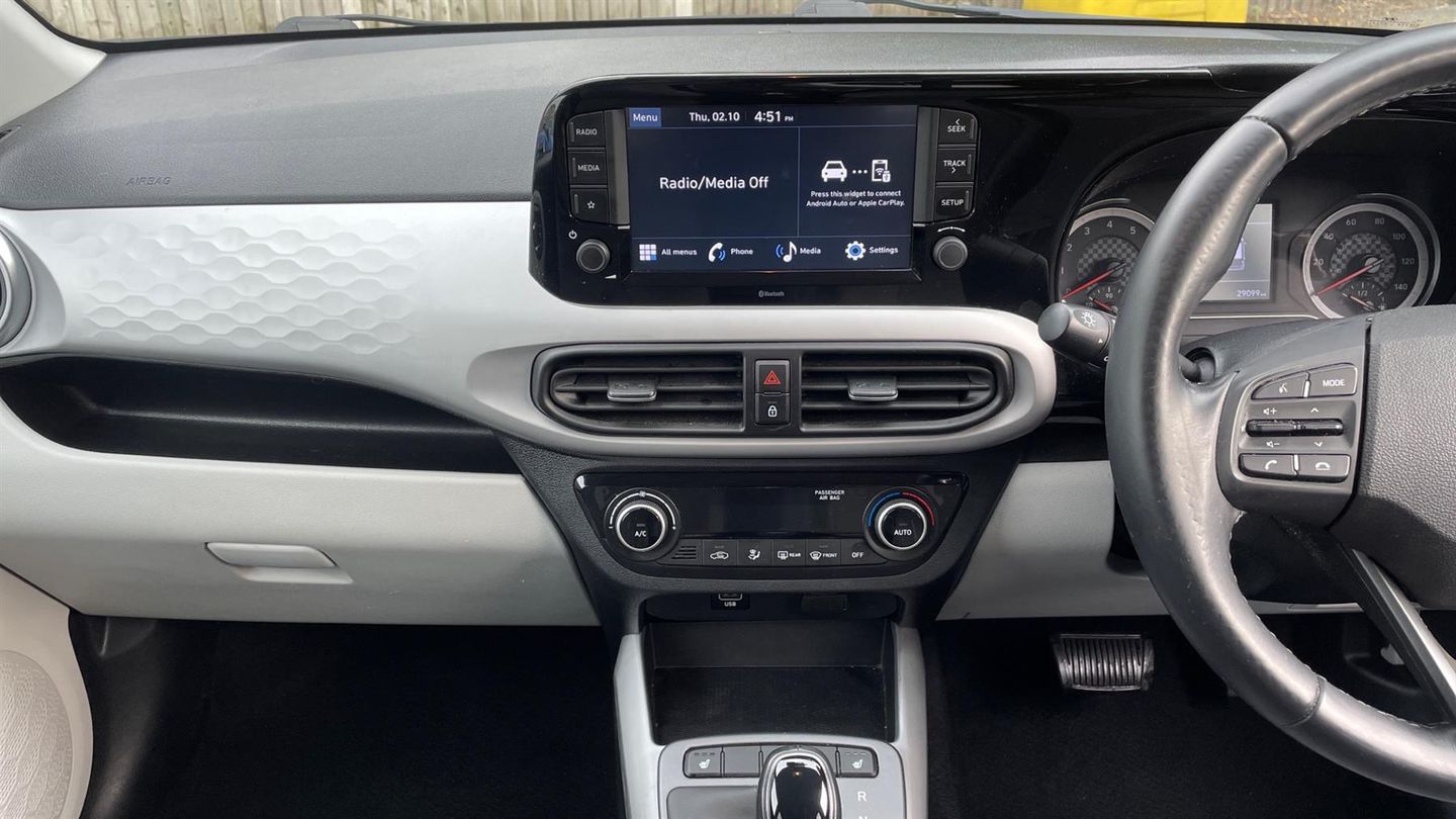 Our stunning Hyundai i10 comes fitted with Rear View Camera, Cruise Control with Speed Limiter, Lane Departure Assist and even Apple CarPlay/Android Auto. Seamlessly integrate your journey with Wireless Android Auto and Wireless Apple CarPlay, all controlled through an 8-inch touchscreen. Safeguard your drives with Forward Collision Avoidance Assist and a Lane Departure Warning System, while a Rear-View Parking Camera makes every parking task a breeze. Stay connected with Bluetooth voice recognition, and enjoy the comfort of cruise control with a speed limiter. The Hyundai i10 is more than just a driveit's a smart, connected journey crafted for your comfort and safety. Step in and elevate your ride..