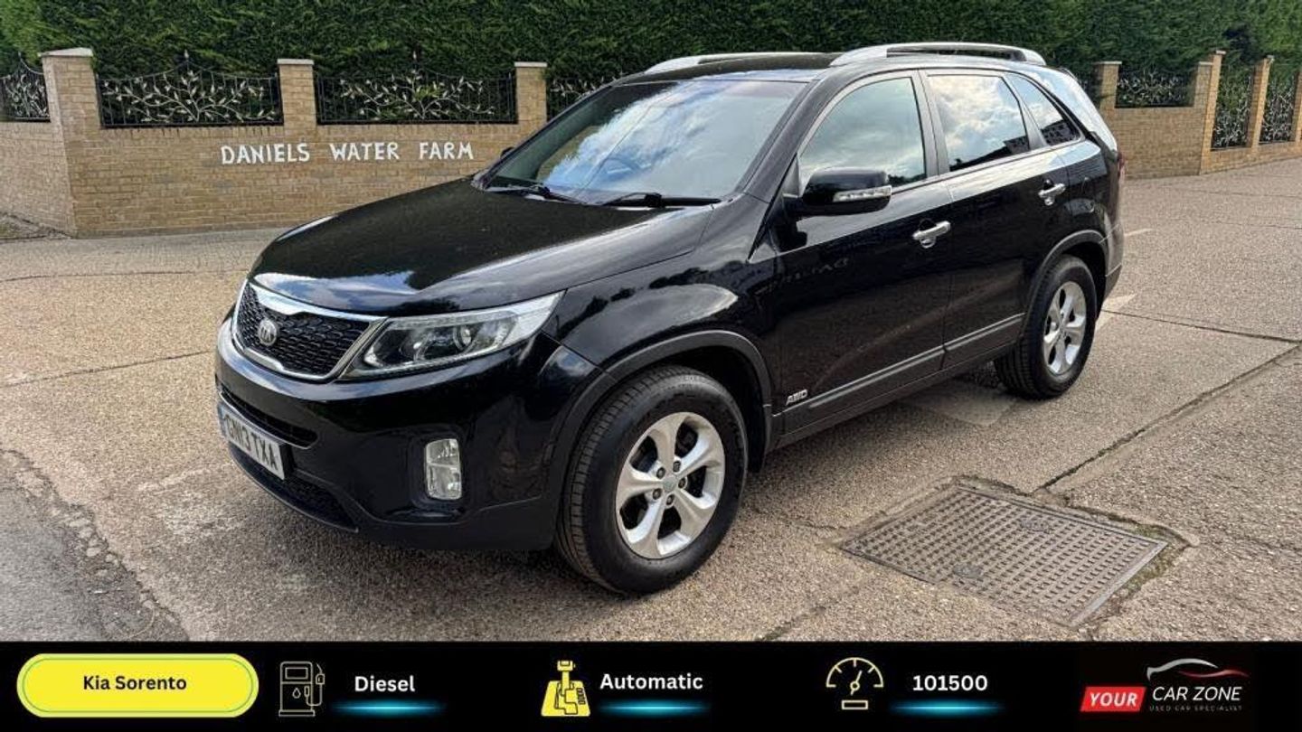 Your Car Zone Ashford Presents: 2013 Kia Sorento 2.2 Crdi Kx-2 Suv Automatic 7 seater Finished in Black Metallic Paint and Leather Interior This car is in very good general condition Key Highlights: 101500 Miles Automatic Gearbox Full Service History New Full Service Just Done - including oil and filters 4 very good tyres 2 Keys MOT valid till 3rd October 2026 3 Months Premium Warranty HPI Checked and Clear Packed with Premium Features: Tow bar Rear Parking Sensors, Reversing camera CD Player, Bluetooth, USB, and AUX, Electric Windows and Mirrors, Cruise Control Hill Assist Rain Sensor Automatic Headlights ISOFIX Finance Available Card Payments Accepted Part Exchange Welcome Delivery Service Available Call us at 01233349106 or 07595 401413 to schedule a viewing or for more information! Our stock: www.yourcarzone.co.uk