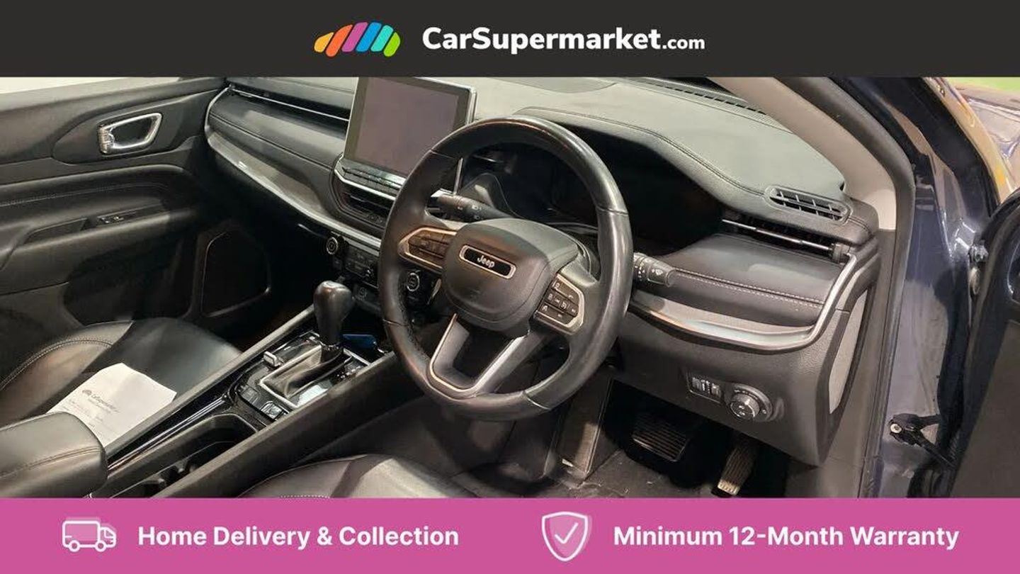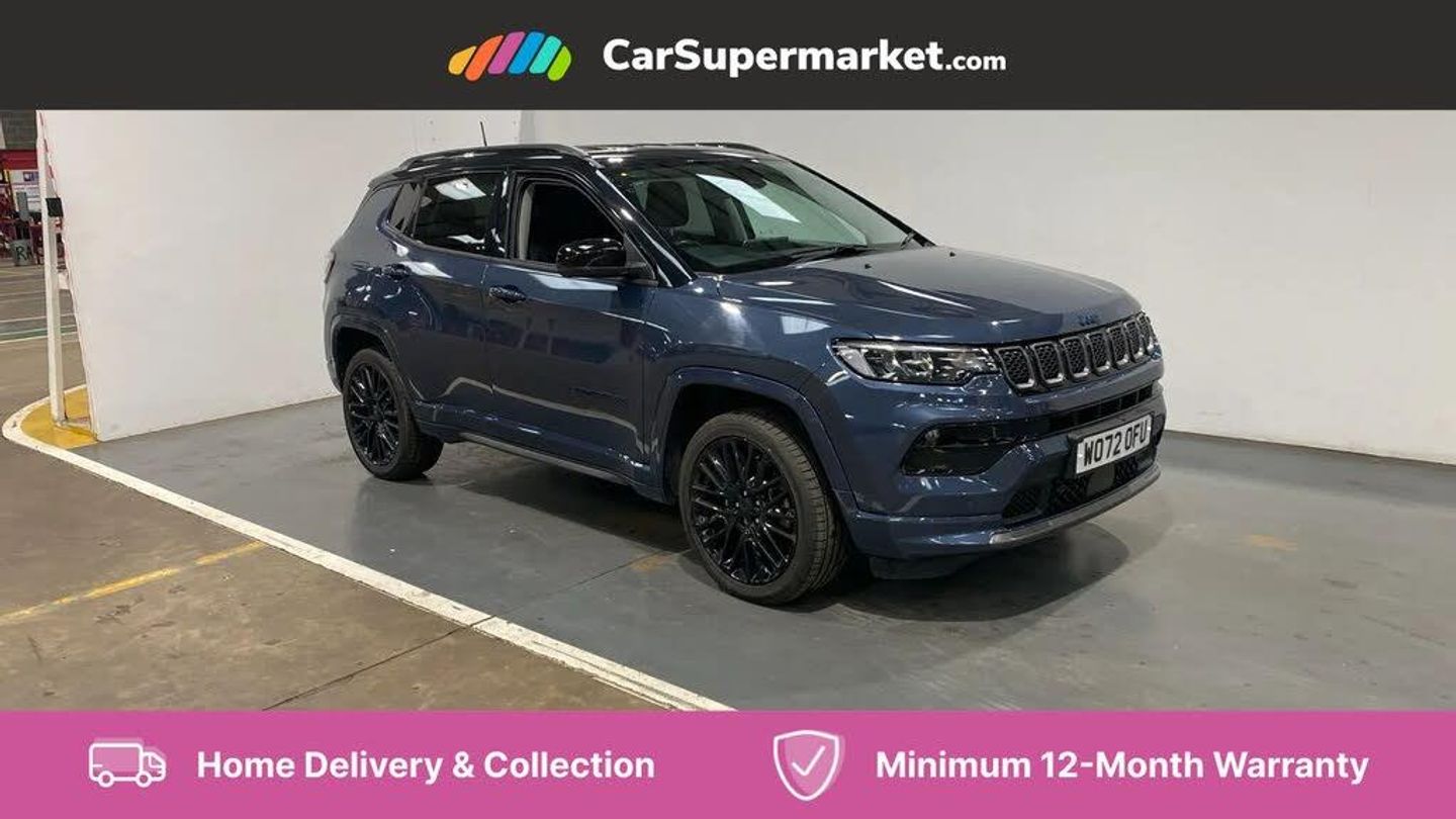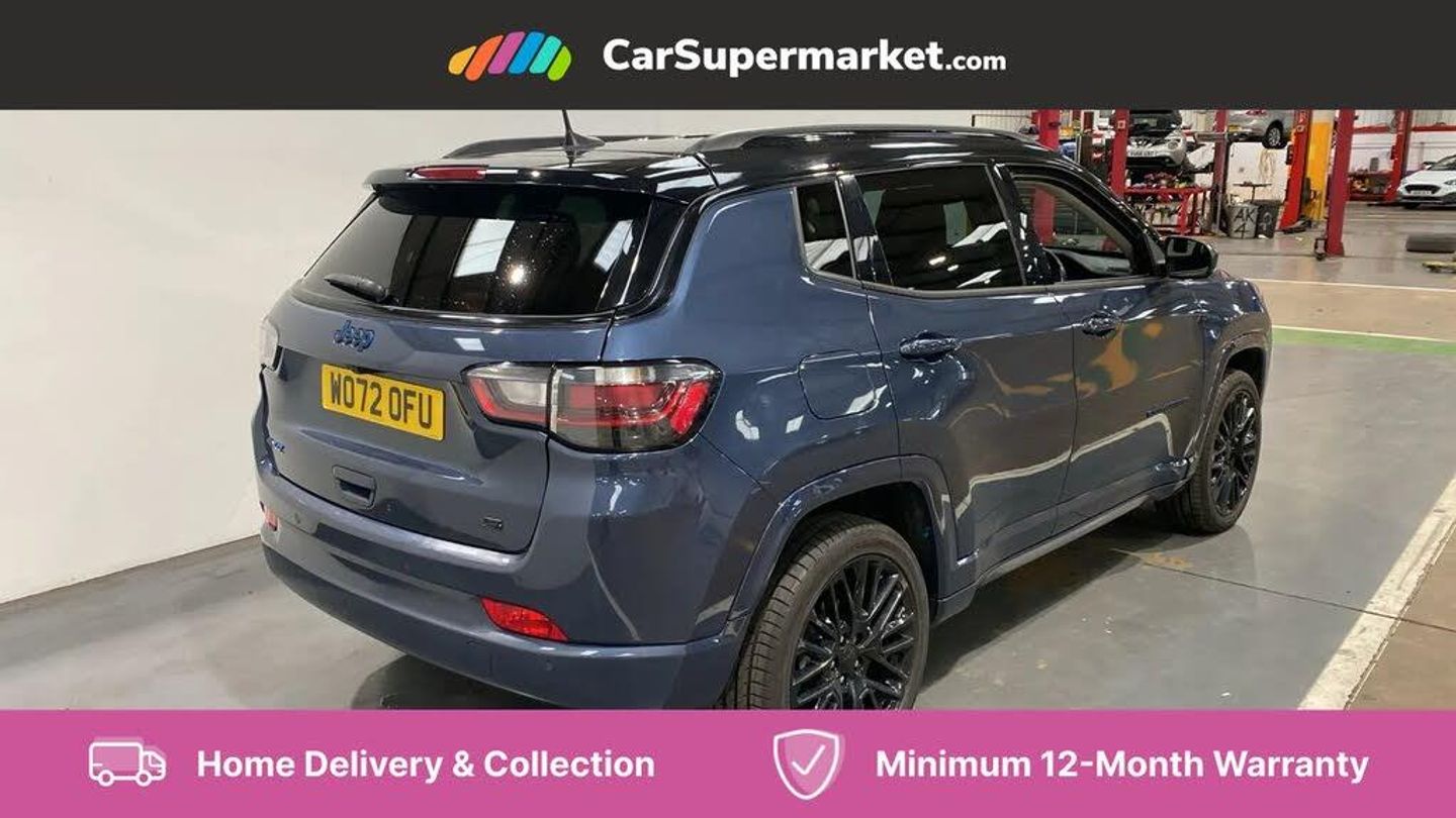 160 MPH primary speedometer,Active lane management,Active speed limiting device,Adaptive cruise control with Stop and Go,Drowsy driver detection,E-call,Electric power steering,English owners handbook,Full speed forward collision warning plus mitigation,Instrument cluster- 10.25" TFT Colour display,Instrument panel,Intelligent speed assist,Media centre electronic storage,Outside temperature display,Selec terrain system with sport mode,Tachometer,TBM - Connected services (e-call),Traffic sign recognition (TSR),Vehicle information centre,Wireless charging pad,7.4 kW onboard charger,Battery run - down protection,Battery skid plate,Boost and load point shift,CO2 improvement,E- launch,E-creeping,E-Parking,E-Queueing,Electric drive,Electronic roll mitigation,EV/PHEV mode 2 charging cable,Bluetooth audio streaming,DAB Digital radio,Global telematics box module (TBM),Media hub (USB A-C TYPE),Steering wheel mounted audio controls,Uconnect 5 R1 Radio - 10.1" display without navigation,USB A and C type - second row,USB host flip,4XE badge/e-Hybrid badge,Aspherical driver's exterior mirror,Auto dimming rear view mirror,Auto high beam,Automatic headlights,Belly pan - underbody protection,Black side roof rails,Black window surrounds,Body colour door handles,Carry back MHEV,Coastdown and run-in optimization,Compass badge,Deep tint privacy glass,Door mirrors: power adjustable and folding, heated with auto folding function and indicators,Exterior door mirrors with heating element,Front fascia/belly pan skid plate,Front/rear grey insert,Gloss black badges,Gloss black door claddings,Gloss black ext sill moldings,Gloss black exterior door mirrors,Gloss black fascias,Gloss black grille/neutral gray rings,Gloss black wheel flares,Headlamp leveling system,Headlamp off time delay,Heated rear window,Jeep badge,LED front fog lamps,LED rear lights,LED reflector headlamps high with segmented DRL,LED tail lights,Lower bodyside cladding in black,Neutral grey exterior accents,Partial body cover protection,Power windows - driver and passenger express up/down,Rain sensitive windscreen wipers,Rear fascia,Rear fog lamps,Rear side wing doors,Rear windshield washer/wiper,Removable short mast antenna,S badge,Smartbeam headlights,Third brake light,Trailer sway damping,UK front number plate bracket,Windshield wiper de-icer,12V auxiliary power outlet - 2nd row,3 rear seat head restraints,3 seat bench in 2nd row,40/20/40 Split bench seat,6 way manual adjust front passenger seat,60/40 split folding rear seat,Cargo area lights,Cargo compartment carpet,Cargo compartment cover,Cargo compartment organiser,Cargo load floor,Cargo tie down loops,Centre console with sliding armrest,Centre rear 3 point seat belt,Child seat anchorage points,Coat hooks,Dash insulation,Driver assist handle,Driver seat 6 way manual adjust,Driver seat height adjust,Dual zone temperature control with preconditioning capability and heater,Fold flat front passenger seat,Front head restraints,Front height-adjust seatbelts,Front map pocket LED lamps,Front map reading lights,Front seats back map pockets,Full length centre console,Glovebox light,Glovebox with damped soft close door,Heated front seats,Heated steering wheel,Illuminated door entry system,Interior door handle LED lamps,Internal rear grab handles,Leather upholstery,Leather wrapped gear knob,No Alternator,Overhead console,Overhead dome LED lamps,Passenger assist handles,Power 2-way driver lumbar adjustment,Rear air conditioning and heater vents,Rear seat armrest with cupholder,Single front passenger seat,Spare wheel storage insulation,Sunvisors with illuminated vanity mirrors,Tilt/telescopic steering column,Vinyl wrap steering wheel,Infotainment Plus pack - Jeep,Power pack - Jeep,AEB with pedestrian and cyclist detection,All speed traction control,Automatic electronic hold brake,Driver's front airbag,Dual note electric horns,Dual tyre pressure - turn changes,Electrical steering column shaft lock,Electronic parking brake,Electronic stability control,Energy recovery system,Front and rear side curtain airbags,Front passenger airbag,Front passenger airbag detector,Front side airbags,Hill descent control,Hill start assist,Jeep call assistance label,Passenger airbag deactivation switch,Rain brake support,Rear door child protection locks,Rear seat belt reminder,Tyre pressure monitoring display,Capless fuel filler,Occupant detection system,Passive entry and keyless go (Key fob without panic button),Power locking fuel filler door,Premium security alarm,Dashboard insert - Satin chrome silver,Front and rear air vents,Speakers in satin chrome silver,19" Gloss black alloy wheels,Blue Shade with Black Roof