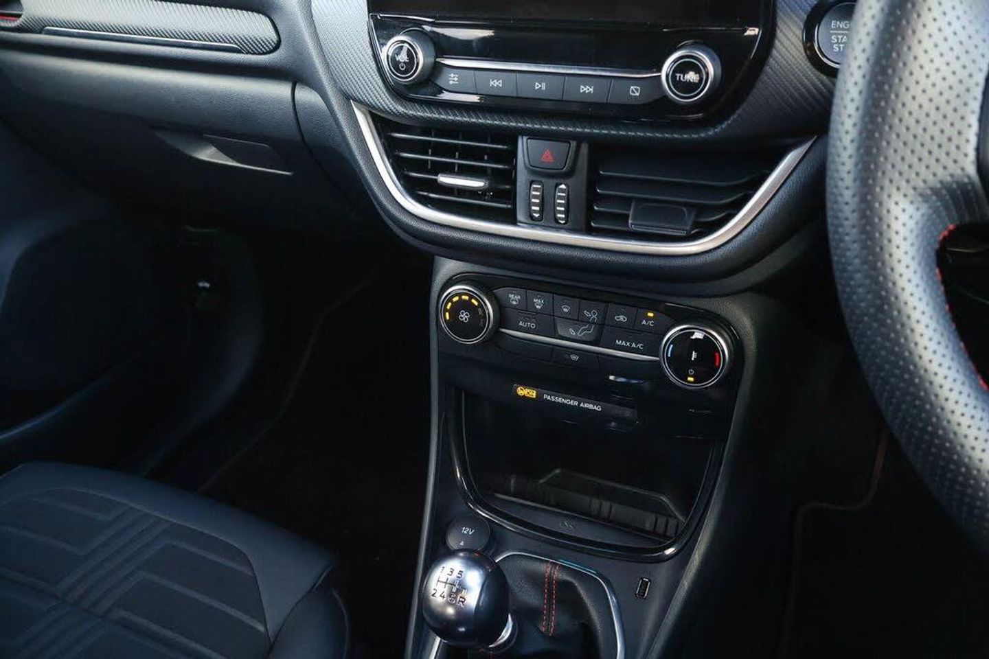 Driver impairment monitor, Emergency call service, Ford easy fuel, Full digital 12.3" instrument cluster, Lane keeping aid with lane departure warning, Power assist steering, Power start button, Rear parking sensor, Selectable drive modes(Normal, sport, Eco, trail, slippery), Speed sign recognition, Automatic headlights with auto high beam, Automatic rain sensing wipers, Front fog lamps, LED daytime running lights, LED rear lamps, Power foldable heated door mirrors with puddle lamps, Privacy glass to side rear windows and tailgate glass, Quickclear heated windscreen, Rear side wing doors, Rear wiper, ST-Line body styling kit with unique grille, Third brake light, 3 seat bench in 2nd row, Centre console with armrest and stowage, Ford megabox extended bootspace, Front and rear head restraints, Front floor mats, Manual 4 way driver seat adjust with lumbar adjustment, Manual 4 way passenger seat with lumbar seat adjustment, Sensico partial premium upholstery, Single front passenger seat, ST-Line flat bottomed sensico leather steering wheel with leather handbrake and aluminium gear knob, Wireless charging pad with electronic air temperature control (EATC), Thatcham alarm