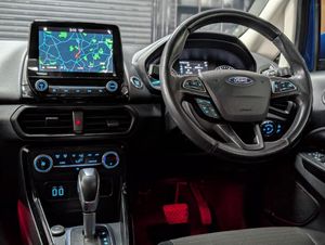 17in Alloy Wheels - 10 Spoke Flash Grey Machined, Adjustable Boot Load Floor, Airbags - Curtain, Airbags - Driver and Front Passenger, Airbags - Drivers Knee, Airbags - Front Passenger De-Activation Switch, Alarm - Thatcham Category 1 with Volume Sensing and Perimeter, Ambient Lighting - Instrument Panel and Footwell, Analogue Instrument Cluster, Anti-Lock Braking System - ABS with Electronic Stability Control - ESC, Automatic Dimming Rear View Mirror, Automatic Headlights, Centre Console Cup Holder with Chrome Accent, Centre Console with Sliding Armrest, Child Locks, Chrome Headlight Bezel, Courtesy Light - Front with Two Map Lights, Courtesy Light - Rear, Cruise Control, Door Frame Beltline - Chrome, Door Handles - Body Colour, Door Mirrors - Power-Foldable Heated with Integrated Side Indicator and Puddle Lights, Driver Seat Manual Height- Fore/Aft and Seatback Angle Adjustment and Recliner, Driver Seat Manual Rotary Knob Lumbar Support Adjustment, Driver and Passengers Sun Visor with Covered Vanity Mirror and Ticket Strip on Drivers Side, Drivers Stowage Glovebox, EPAS - Electric Power Assisted Steering, Electronic Automatic Temperature Control - EATC, Emergency Assistance, Engine Immobiliser, Ford DAB Navigation System with Ford SYNC3, Ford Easy Fuel - Capless Refuelling System, Front 2-Way Head Restraints, Front Fog Lights, Front Grille - Chrome, Front Seat - Passenger Manual - Fore-Aft and Recline Adjustment, Front Seats - 3 Point Seat Belts with Load Limiter and Seatbelt Height Adjust, Front Seats - Seat-Back Map Pockets, Front Suspension - Independent with MacPherson Struts and Anti-Roll Bar, Front and Rear Bumper - Body Colour with Dark Insert, Front and Rear Floor Mats, Front and Rear Folding Grab Handles, Front and Rear Power Points - 12V, Full Length Overhead Console with Sunglasses Holder, Gear Shift Indicator, Glovebox with Cool Bin - Lid and Illumination, Halogen Headlamps with LED Day Running Lights, Halogen Rear Lights, Handbrake Grip - Leather-Trimmed, Headlights - Courtesy Delay, Headlights - Levelling Control, High Mounted Brake Light, IPS - Intelligent Protection System, Keyless Start with Ford Power Start Button, Load Compartment - Lights, Load Compartment Carpet, Load Compartment Side Trim Incorporating Shopping Hooks, Lower Body Side - Door Claddings - Black with Chrome Insert, Manual Parking Brake, MyKey, Power Front and Rear Windows with Global Opening-Closing, Quickclear Heated Front Windscreen with Heated Washer Jets, Rain Sensing Wipers, Rear Seat - Fold and Tumble 60-40 Split - Split Back, Rear Seats - Centre Head Restraint - Up-Down, Rear Seats - Retractable Rear Seat Belt - 3-Point All Positions, Rear Suspension - Semi-Independent Twist Beam with Twin Gas and Oil-Filled Shock Absorbers, Rear View Camera with Rear Parking Sensors, Remote Central Locking, Rocker Panel and Side Cladding - Black, Seat Belt Reminder System - Drivers and Front Passengers, Seats - ISOFIX Mounting Provision for Child Seats - Outer Seats Only, Select Shift Sports Mode Technology, Side Impact Door Beams, Silver Roof Rails, Soft Instrument Panel Cover, Steering Column - Rake and Reach Adjustment, Steering Wheel - Leather-Trimmed with Chrome Inserts, Steering Wheel - Paddle Shift, Storage - Front Passenger Underseat Area, Suspension - Front Stabiliser Bar, Tailgate Handle - Chrome, Threshold Plates - Front - Stainless Steel with EcoSport Logo, Tie-Down Hooks, Trip Computer, Tyre Pressure Monitoring System, Tyre Repair Kit, Wiper - Intermittent Rear Wash-Wipe