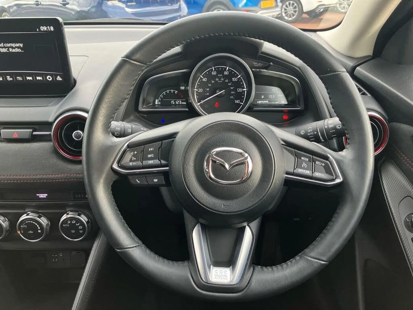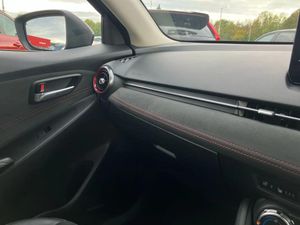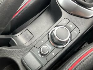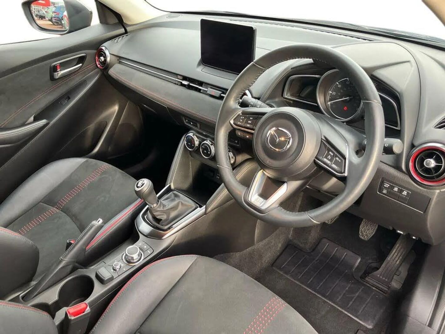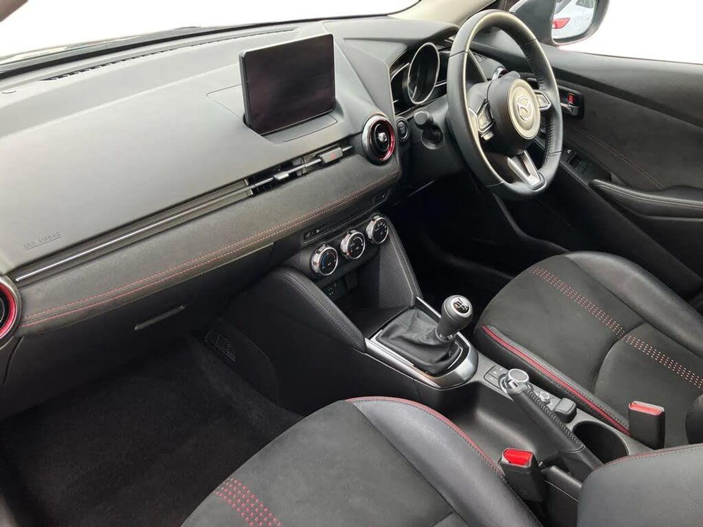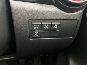 Adjustable speed limiter,Analogue rev counter,Cruise control,Digital instrument cluster,Digital speed display meter,E-call,Emergency stop signalling system,Engine start/stop button,Integrated bluetooth,Lane departure warning system,Lane keep assist,Mazda connect with 8" colour touch screen,Navigation system,PAS,Rear parking sensor with audible and visual warning,Reversing camera,Service indicator,Tailgate,Trip computer,Wireless Apple CarPlay and wired Android Auto,i-stop,Mazda M hybrid,AM/FM/DAB radio with 6 speakers with USB and AUX inputs,Multimedia Commander including separate volume dial,Steering wheel mounted audio/bluetooth controls,Auto dimming rear view mirror,Auto headlight levelling,Black carbon effect roof,Black door mirrors,Black Shark-fin antenna,Body coloured front bumper with black lower bezel,Body coloured rear bumper with black lower mouldings and red accent,Chrome exhaust tailpipes,Coming/leaving home lighting function,Dusk sensing headlights,Electric adjustable/heated/folding door mirrors,Electric front/rear windows with one touch auto up/down for driver's window,Front honeycomb grill with red accent,Gloss black finish signature wing,Heated rear window,LED Headlights,LED indicator lights,LED third brake light,Privacy glass,Rain sensing front wipers with adjustable sensitivity and speed,Rear side wing doors,Rear wiper,Signature LED daytime running lights,3 seat bench in 2nd row,60/40 split rear seats,Black/red air vent accents,Climate control air conditioning,Driver, Front passenger and two rear grab handles with coathooks,Drivers seat manual slide recline and height adjustment,Drivers/front passengers covered vanity mirrors and drivers ticket holder,Front centre storage with two cupholders,Front head restraints,Front passenger and driver door pockets,Front passenger seat manual slide, recline and height adjust,Front passenger seatback pockets,Gear shift indicator,Glovebox,Heated front seats with 3 stage setting,Heated leather steering wheel,Interior courtesy light with integrated spotlight,ISOFIX child seat anchorage points attached on outer rear seats,Leather gear knob,Leather handbrake,Leather/Cloth upholstery,Luggage compartment light,Single front passenger seat,Three height adjustable rear head restraints,Tilt/telescopic adjustable steering wheel,2x3 point front seatbelts with pre-tensioners,3 point seatbelts on all rear seats,Anti-lock braking system (ABS),Collision mitigation braking system,Dynamic stability control + Traction control,ESP,Front and rear curtain airbags,Front driver, passenger and rear seat seatbelt warning,Front dual stage driver and single stage front passenger airbags,Front side airbags,Front smart city brake support,G-Vectoring control plus,Hill launch assist,Manual child lock in rear doors,Passenger airbag cut-off switch,Tyre pressure monitoring system,Deadlocking system,Power door locks,Remote central locking,Smart keyless entry,Thatcham accredited alarm and immobiliser,Black soft touch dashboard panel with red stitching colour coordination,16" Black metallic machined alloy wheels,Emergency tyre repair kit