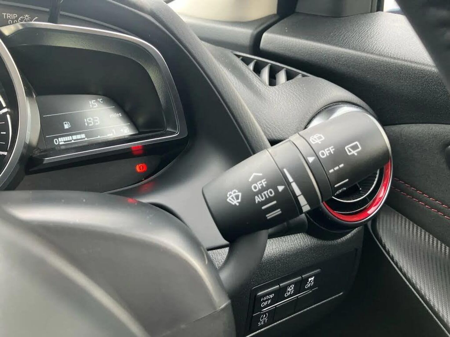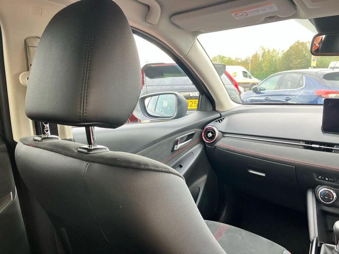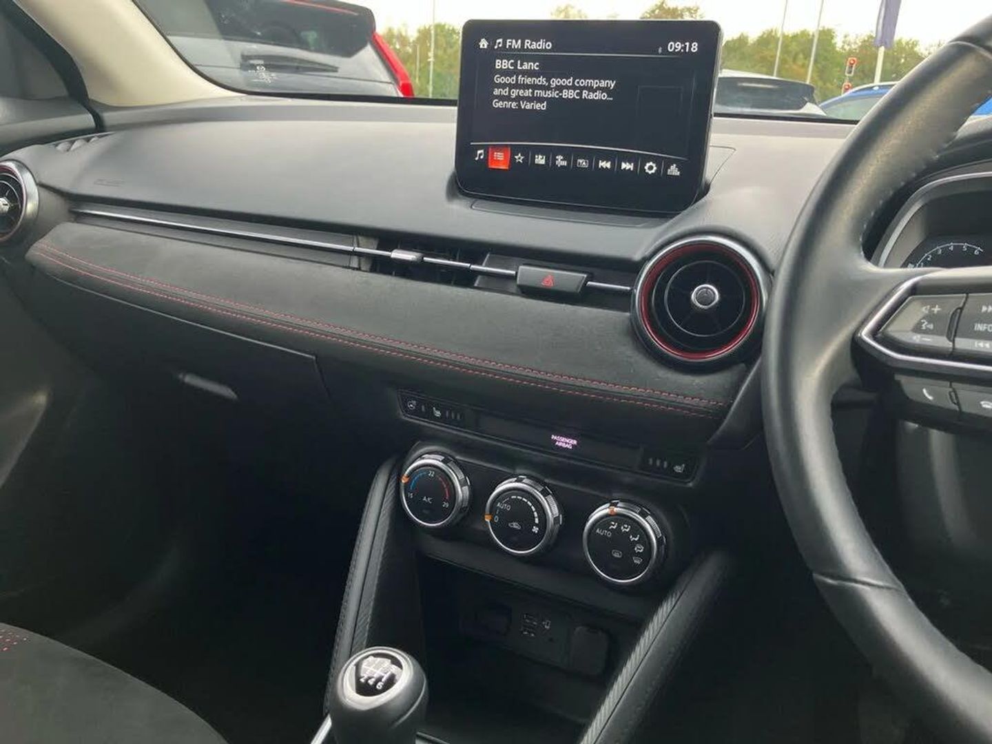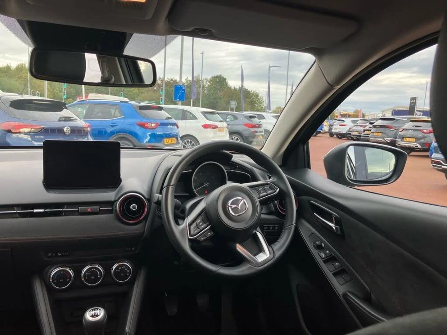 Adjustable speed limiter,Analogue rev counter,Cruise control,Digital instrument cluster,Digital speed display meter,E-call,Emergency stop signalling system,Engine start/stop button,Integrated bluetooth,Lane departure warning system,Lane keep assist,Mazda connect with 8" colour touch screen,Navigation system,PAS,Rear parking sensor with audible and visual warning,Reversing camera,Service indicator,Tailgate,Trip computer,Wireless Apple CarPlay and wired Android Auto,i-stop,Mazda M hybrid,AM/FM/DAB radio with 6 speakers with USB and AUX inputs,Multimedia Commander including separate volume dial,Steering wheel mounted audio/bluetooth controls,Auto dimming rear view mirror,Auto headlight levelling,Black carbon effect roof,Black door mirrors,Black Shark-fin antenna,Body coloured front bumper with black lower bezel,Body coloured rear bumper with black lower mouldings and red accent,Chrome exhaust tailpipes,Coming/leaving home lighting function,Dusk sensing headlights,Electric adjustable/heated/folding door mirrors,Electric front/rear windows with one touch auto up/down for driver's window,Front honeycomb grill with red accent,Gloss black finish signature wing,Heated rear window,LED Headlights,LED indicator lights,LED third brake light,Privacy glass,Rain sensing front wipers with adjustable sensitivity and speed,Rear side wing doors,Rear wiper,Signature LED daytime running lights,3 seat bench in 2nd row,60/40 split rear seats,Black/red air vent accents,Climate control air conditioning,Driver, Front passenger and two rear grab handles with coathooks,Drivers seat manual slide recline and height adjustment,Drivers/front passengers covered vanity mirrors and drivers ticket holder,Front centre storage with two cupholders,Front head restraints,Front passenger and driver door pockets,Front passenger seat manual slide, recline and height adjust,Front passenger seatback pockets,Gear shift indicator,Glovebox,Heated front seats with 3 stage setting,Heated leather steering wheel,Interior courtesy light with integrated spotlight,ISOFIX child seat anchorage points attached on outer rear seats,Leather gear knob,Leather handbrake,Leather/Cloth upholstery,Luggage compartment light,Single front passenger seat,Three height adjustable rear head restraints,Tilt/telescopic adjustable steering wheel,2x3 point front seatbelts with pre-tensioners,3 point seatbelts on all rear seats,Anti-lock braking system (ABS),Collision mitigation braking system,Dynamic stability control + Traction control,ESP,Front and rear curtain airbags,Front driver, passenger and rear seat seatbelt warning,Front dual stage driver and single stage front passenger airbags,Front side airbags,Front smart city brake support,G-Vectoring control plus,Hill launch assist,Manual child lock in rear doors,Passenger airbag cut-off switch,Tyre pressure monitoring system,Deadlocking system,Power door locks,Remote central locking,Smart keyless entry,Thatcham accredited alarm and immobiliser,Black soft touch dashboard panel with red stitching colour coordination,16" Black metallic machined alloy wheels,Emergency tyre repair kit