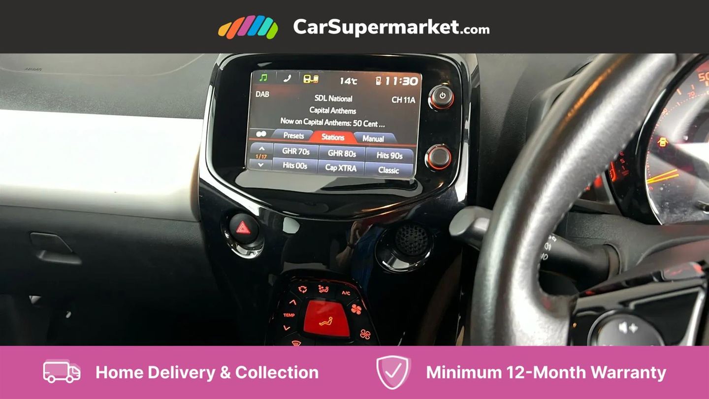 7" touch screen,Bluetooth system,Digital clock,Electric power steering,Fuel indicator with low level warning,Lights on warning,MirrorLink,Rear view camera,Speed limiter,Tachometer,Vehicle Stability Control (VSC),4 speakers,Auxiliary input socket,DAB Digital radio,Multimedia System,Stereo radio,USB connection,2 speed wipers/variable intermittent/mist function,Automatic headlights,Body colour bumpers,Body colour door handles,Body colour door mirrors,Electric adjustable door mirrors,Electric front windows,Front fog lights,Green tinted glass,Headlamp levelling,Heated door mirrors,Heated rear windscreen,LED daytime running lights,Privacy glass,Rear spoiler,Rear window demister,Rear wiper,Red front bumper accent,Red roof decal,Red side sills,Roof mounted aerial,12V Accessory socket,3 spoke leather steering wheel,50/50 split folding rear seat,Air recirculation system,Auto air conditioning,Body colour instrument panel,Centre console storage,Chrome insert to gearknob,Chrome interior door handles,Driver and passenger sunvisors,Driver's seat height adjuster,Driver/passenger seat recline/slide adjust,Driver/passenger vanity mirrors with covers,Front and rear door pockets,Front cupholder,Front map reading lights,Front sports seats,Gleam cloth upholstery,Glossy black gear shift surround,Glovebox,Height adjustable front head restraints,Isofix system on outer rear seats,Leather gear knob,Pollen filter,Rear cupholders,Rear headrests,Steering wheel mounted radio/phone controls,Stepless tilt adjustable steering column,Storage bins on all doors,Tonneau cover,Outburst pack red pop - Aygo,ABS,Driver and passenger airbags,ESP,Fasten seatbelt reminder,Front side airbags,Height adjustable front seatbelts with pre-tensioners and load limiters,Hill start assist,Passenger airbag deactivate switch,Rear child proof door locks,Side curtain airbags,Tyre pressure warning,Engine immobiliser,Lockable fuel cap,Remote central locking,Body colour dashboard,Gloss black air vent surround,Gloss black centre console,Tyre repair kit