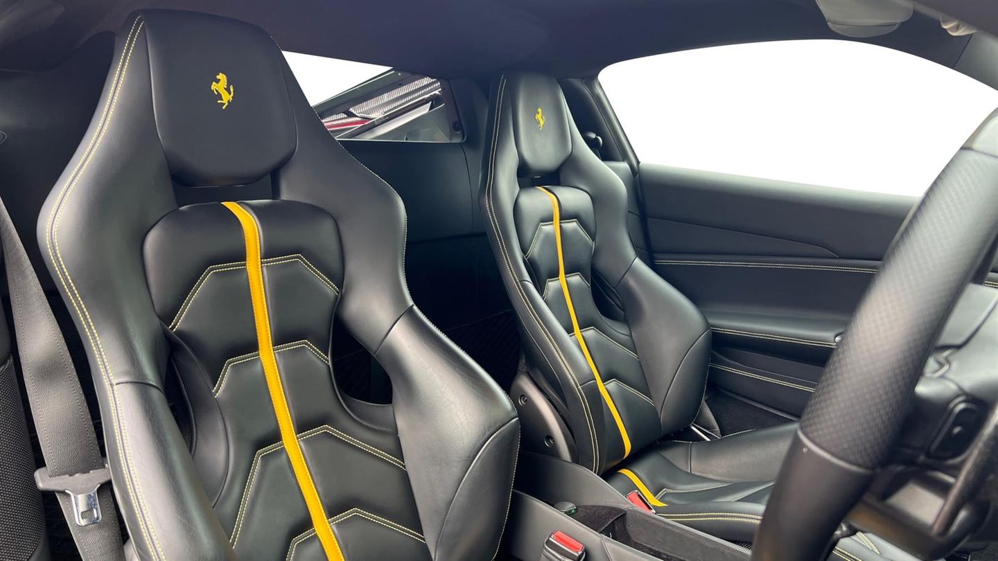 Scuderia Wing Badges,Carbon Fibre Steering Wheel+LEDS,Carbon Fibre Racing Seats,Carbon Fibre Drivers Zone,Carbon Fibre Rear Air Ducts,Carbon Fibre Side Air Splitters,Carbon Fibre Underdoor Covers,Factory Painted Black Roof,20" Forged Diamond Cut Wheels,Yellow Brake Calipers,Cavallino Stitched Into Headrests,Titanium Exhaust Tips,Front And Rear Parking Sensors,Yellow Rev Counter,High Power Hifi,Contrast Stitching In Giallo,Two Years Ferrari Warranty