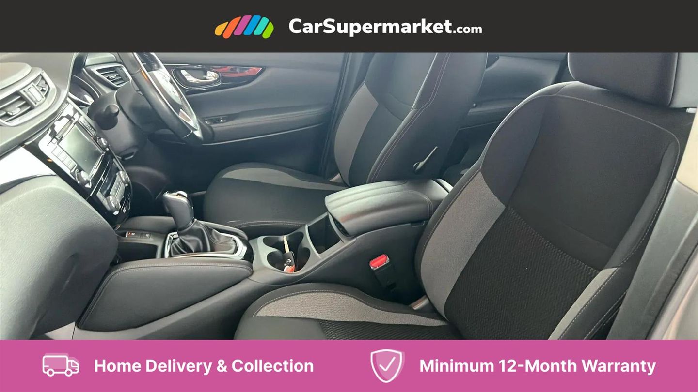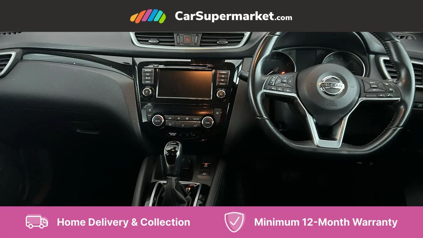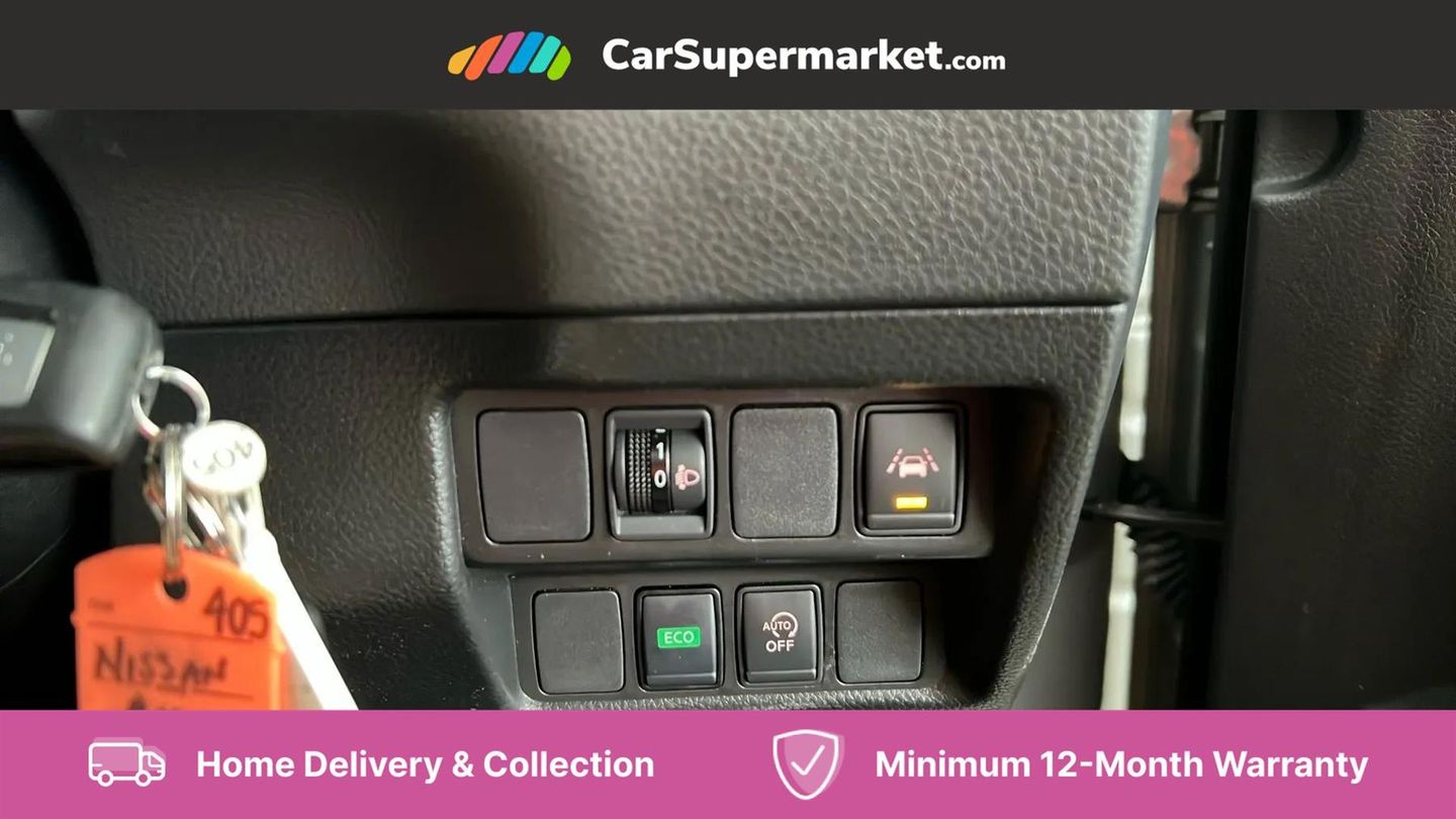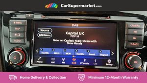 Advanced drive assist display 5'' TFT coloured screen,Android Auto,Apple CarPlay preparation,Bluetooth connectivity,Cruise control + speed limiter,Electric speed sensitive power steering,Front parking sensors,Lane departure warning system,Nissan connect evo 7" touchscreen navigation and entertainment system,Normal or sport selectable steering,Outside temperature sensor,Rear parking sensors,Rear view camera,Service interval indicator,Smartphone integration,Stop/start system,Tomtom connected services,Traffic sign recognition,Trip computer,Voice control system,Nissan chassis control (intelligent ride control, intelligent trace control, intelligent engine brake),6 speakers,AM/FM radio, CD audio system,Aux-in socket,DAB Digital radio,Steering wheel mounted audio controls,USB port,Anti dazzle rear view mirror,Auto wipers,Body colour bumpers,Body coloured door handles,Body coloured door mirrors,Chrome window surround,Daytime running lights dip function when turn signal applied,Electric folding door mirrors,Electric front and rear windows with one touch illuminated window controls,Electric front/rear windows,Electrically adjustable door mirrors,Front fog lights,Halogen headlights,Heated door mirrors,High beam assist,Intelligent auto headlights,LED indicators in door mirrors,Rear roof spoiler,Rear wiper with reverse link,Shark fin antenna,Signature LED daytime running lights,Underbody vortex generators,2 X front 12v power sockets,3 height adjustable rear headrests,60/40 split folding rear seat,Ambient lighting in centre console,Boot lighting,Centre console storage box/armrest,Chrome interior door handles,Cloth upholstery,Driver's seat manual height adjust,Dual zone climate control,Front and rear door pockets with bottle holders,Front and rear seat belt pre-tensioners with load limiters,Height adjustable front headrests,ISOFIX on outer rear seats,Leather D shaped steering wheel,Leather gear lever,Leather knee pad,Manual height adjustable front passenger seat,Manual lumbar support on driver seat,Parcel shelf stow function under luggage board,Pollen filter,Rear armrest with 2 cupholders,Tilt/telescopic adjustable steering wheel,6 airbags - Driver, front passenger, curtain and side airbags,ABS, ESP, EBD and brake assist,Auto hold function,Child locks on rear doors,Electronic parking brake,Front and rear seat belt warning,Front passenger airbag deactivation,Height adjustable front seatbelts,Hill start assist,Intelligent emergency braking with pedestrian recognition,Three 3 point rear seatbelts,Tyre pressure monitoring system,Anti-theft immobiliser,Remote central locking,Thatcham Cat.1 alarm,Piano black dash trim,17" Alloy wheels,Tyre puncture repair kit