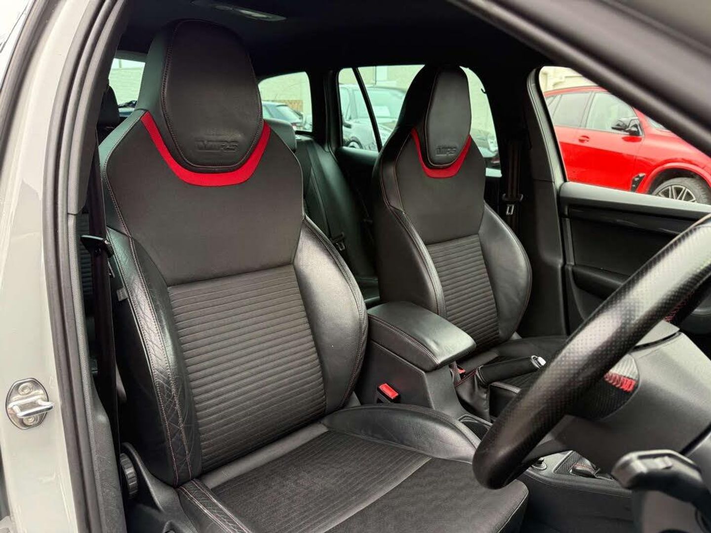 Finished in Meteor Grey with black half leather sports interior with red highlights.