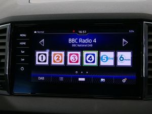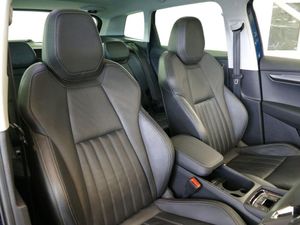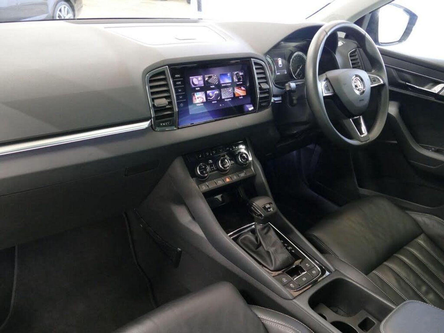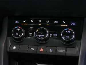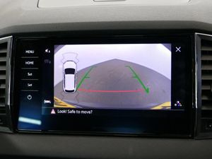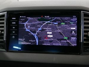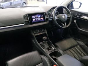 Columbus satellite navigation with 9.2" touchscreen display, integrated Wi-Fi, gesture control and WLAN, Driver alert system, Driver fatigue sensor, Driver profile selection, Electro-mechanical PAS, Front and rear parking sensors, Multifunction colour trip computer, Outside temperature gauge, Rear cross traffic alert, Rear view camera, Service interval indicator, Start/stop system with regenerative braking, Traffic sign recognition, Diesel particulate filter, DAB radio with Bluetooth, SD card slot, USB connection, Acoustic glass, Aero front windscreen wipers with intermittent function, Automatic headlight control system, Body colour door handles, Body coloured bumpers, Chrome outside aluminium bar around the window, Chrome roof rails, Full LED headlights + adaptive front light system + LED daytime running lights and front cornering fog lights, Headlight washers, Heated rear windscreen, LED rear lights with high functionality, Light assistant (coming/leaving home/tunnel light), Panoramic sliding sunroof, Privacy glass, Safety reflectors on front doors, Silver door mirrors, Third brake light, 1.5 litre bottle holders in driver and front passenger door panels, 12V socket in boot, 12v socket in front centre armrest with storage compartment and rear air vents, 2 Folding hooks and nets in boot, 2 Front readings lights for driver and passenger, 3 rear height adjustable headrests, 4 foldable roof handles with rear coat hooks, 4 lashing points on luggage floor, Backrest release, Cargo elements in boot, Chrome inner door handles, Dual zone climate control, Electrically adjustable driver's seat with memory function includes lumbar support + heated folding door mirrors with auto dimming and boarding spots, Folding tables on the front seat backrests, Front seat and rear pockets, Height adjustable front three point seats belts with tensioners, Height adjustable passenger seat, Height/reach adjust steering wheel, Ice scraper, Illuminated and cooled glovebox, Illuminated luggage compartment, Isofix child seat preparation outer rear, Leather upholstery, Manual lumbar support for front passenger seat, Net programme in boot, Pen holder, Pollen filter, Rear boot cover, Rear reading lights, Rear seats fixed folding and divided 60:40, Removable LED torch in the boot, Retractable parcel shelf attachable to tailgate, Safety vest holder, Storage box in upper central dashboard closed, Storage compartment below the passenger seat, Storage net on centre console passenger side, Sunvisors with illuminated vanity mirrors, Textile floor mats, Umbrella under passenger seat, VarioFlex seats with retractable parcel shelf, LED Interior lighting pack with Skoda welcome logo - Karoq, Airbags - Front side, head, knee and curtain, Automatic door unlocking in case of crash, Automatic fuel cut off in case of crash, Driver airbag, Electronic parking brake with auto hold function, Emergency rear braking signal, ESC including ABS, MSR, ASR, EDS, HBA, DSR, RBS, MKB and traction control, Front assist radar scanning of the space in front of the car with automatic braking, Hill hold control, Passenger airbag with switch-off function, Pedestrian monitor, Seatbelt reminder signalisation and pretensioner for all seats, Three point seatbelts rear, Two tone horn, Tyre pressure display, Tyre pressure monitor, Alarm with interior monitoring, back up horn and tilt sensor with safe function, Electronic engine immobiliser, Keyless entry and keyless start with safe system, Remote central locking with 2 remote folding keys, Chrome framed air vents, 19" Crater silver alloy wheels with anti theft wheel bolts, Storage on wheel cover