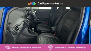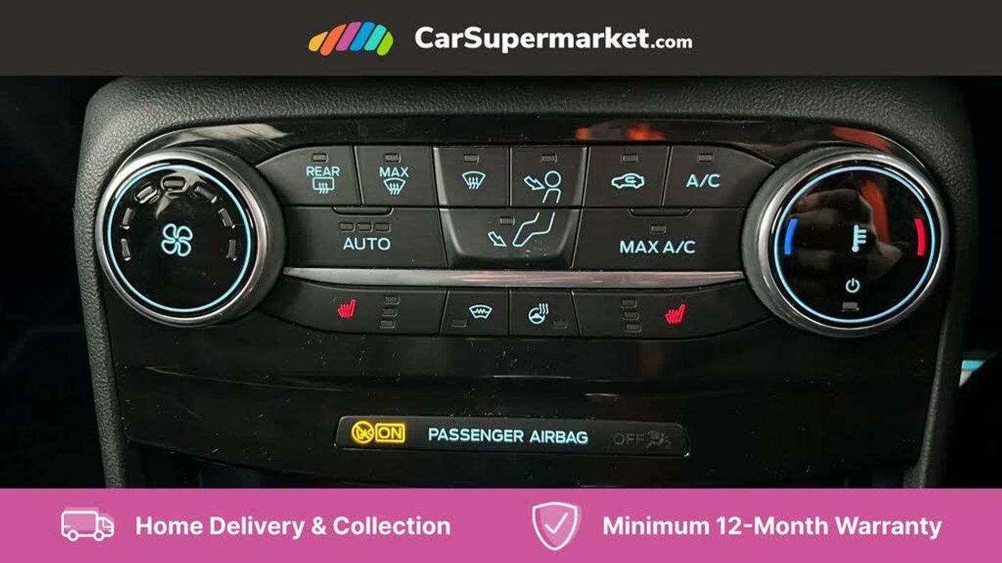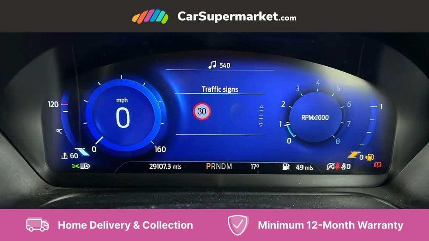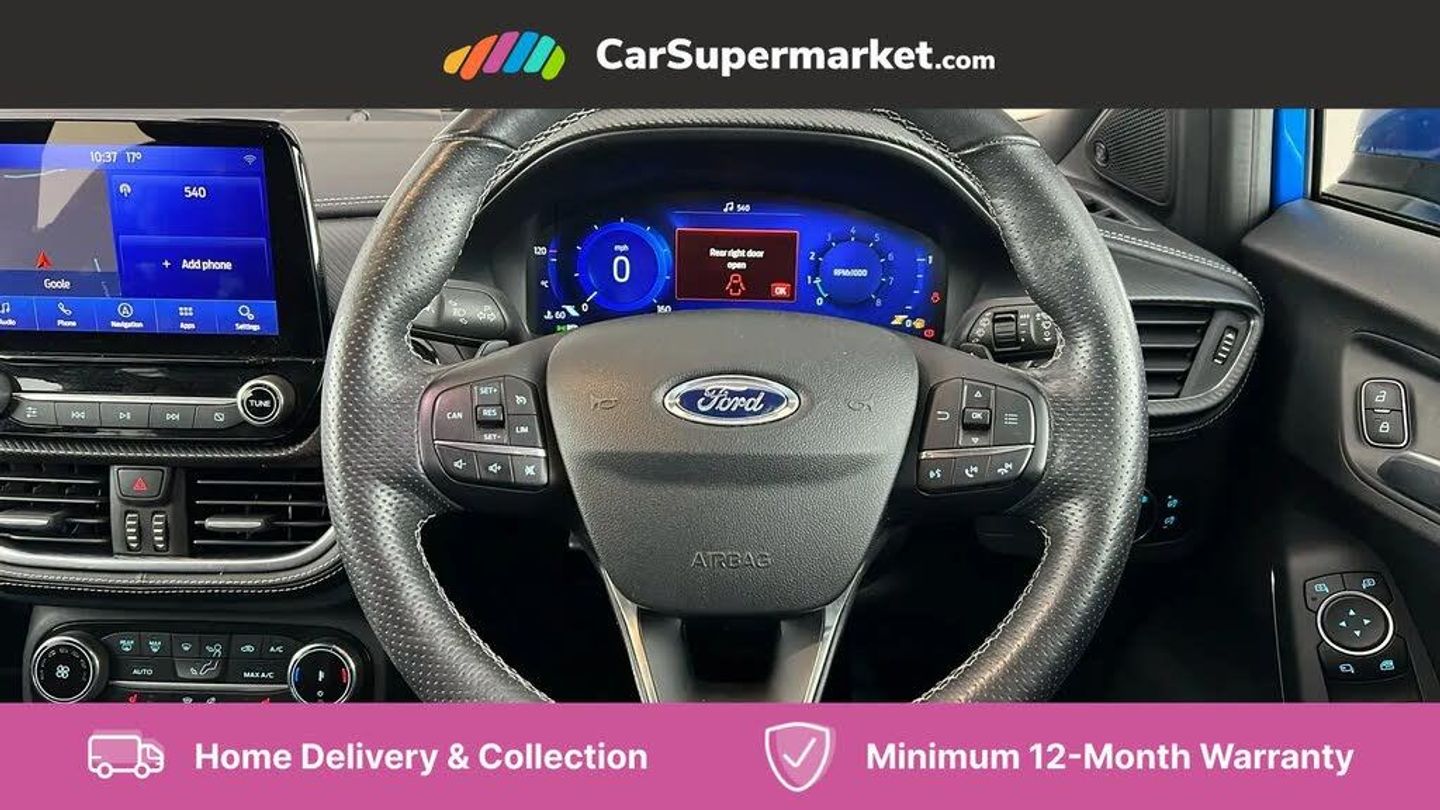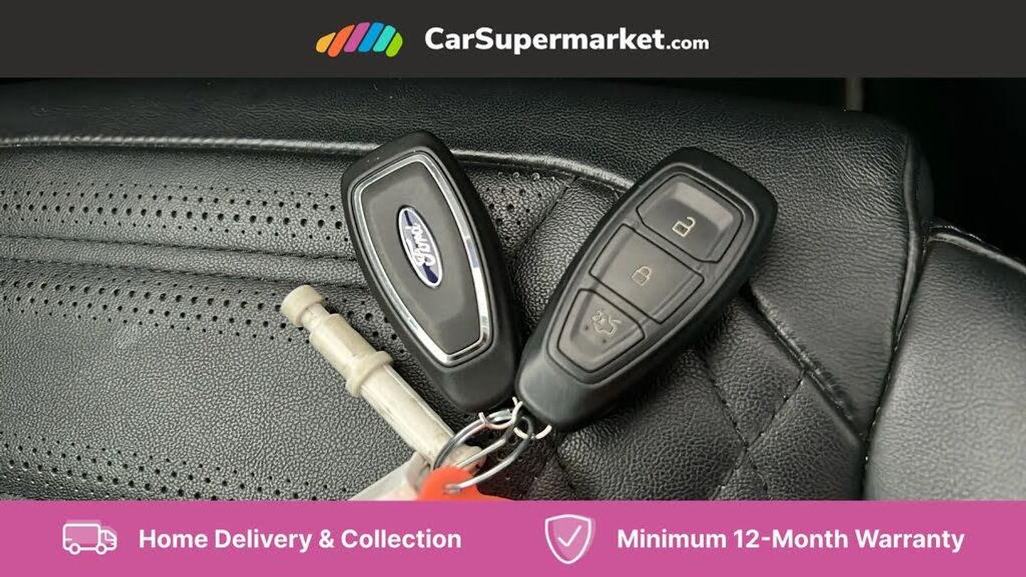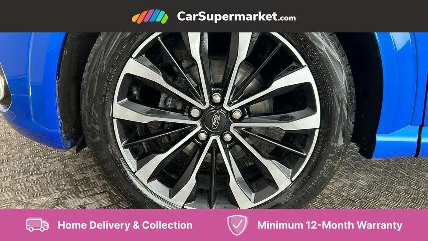 Ford easy fuel,Full digital 12.3" instrument cluster,Lane keeping aid with lane departure warning,Power assist steering,Rear parking sensor,Selectable drive modes(Normal, sport, Eco, trail, slippery),Wireless charging pad,Automatic headlights with rain sensing wipers and auto high beam,Body coloured door mirrors,Bodyside chrome styling,Fixed LED headlamps,Front fog lights with cornering lights and LED rear lamps,Gloss black with chrome elements on front and rear bumpers,High chrome waistline,LED daytime running lights,Power foldable heated door mirrors with puddle lamps,Privacy glass to side rear windows and tailgate glass,Quickclear heated windscreen,Rear wiper,ST-Line body kit with large rear spoiler wth sports suspension,Unique Vignale style upper grille and surround,Centre console with armrest and stowage,Ford megabox extended bootspace,Front and rear head restraints,Heated front seats,Heated steering wheel,Lumbar massage for driver and passenger,Manual air conditioning,Perforated leather flat bottomed steering wheel with metal grey stitching,Premium leather upholstery,Premium sensico wrapped instrument cluster,B&O Premium Audio system + Ford SYNC 3 navigation pack - Puma,Comfort pack - Puma,3 rear seatbelts,Electronic stability control (ESC) and hill start assist,Pre-collision assist with autonomous emergency braking, pedestrian/cyclist detection & post-collision braking,Tyre pressure monitoring system (TPMS),Thatcham alarm,Carbon look interior deco spears,Desert Island Blue,Premium Leather - Black with Metal Grey Stitching