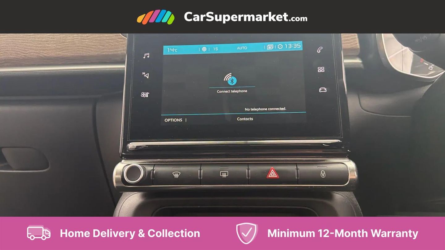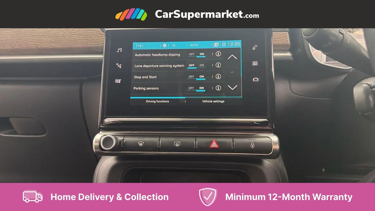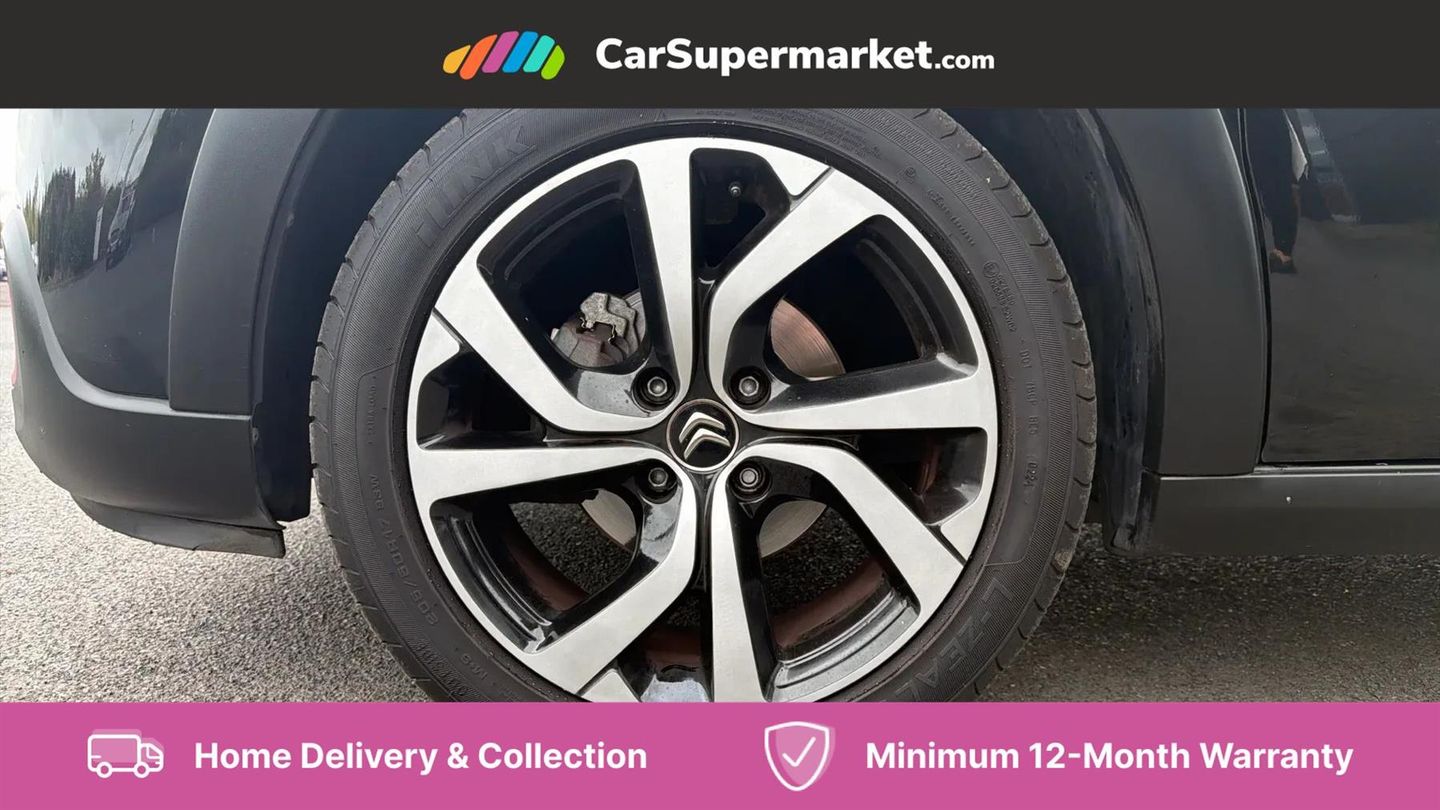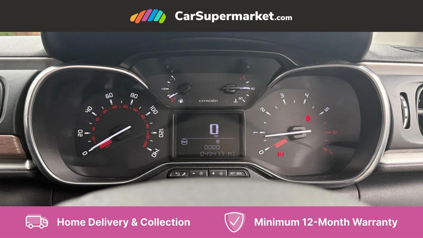 Coffee Break Alert,Cruise control + speed limiter,Exterior temperature display,Multi function trip computer,Rear parking sensors,Reversing camera,Satin chrome surround instrument cluster with white LCD and analogue gauges,Variable assistance power steering,USB connection,3D rear light signature,Automatic activation of hazard warning lights,Body colour bumpers,Body colour door handles,Chrome decoration on front face, under chevrons and around daytime running lights,Citroen illuminated signature in LED headlights and LED daytime running lights,Dark tinted tailgate and rear side windows,Electric folding and heated door mirrors,Electric front windows with one touch/anti-pinch,Electric rear windows with one touch/anti-pinch,Fog lights integrated into front bumper,Gloss black finish B pillar,LED Headlights,Rear windscreen wiper with intermittent mode linked to vehicle speed and automatic activation when reverse gear selected,Roof colour rear view mirror caps,1/3 to 2/3 split folding rear seat,12V socket,Automatic air conditioning,Cloth/leather effect upholstery,Driver and passenger's sun visor with courtesy mirror,Driver's central armrest,Driver's seat height adjustment,Fixing boot light,Front lighting panel with map reading lights,Front seats adjustable with forward back slide and adjustable backrest,Height adjustable front head restraints,Height/reach adjust steering wheel,ISOFIX mounting on outer rear seats with top tether and labels indicating fixing points,Leather trimmed gear lever with leather effect gaiter and overstitching,Map pockets in back of driver and front passenger seats,Parcel shelf,Seatbelt unfastened on the move audible and visual alert for front and rear seats,Storage space under touchscreen with rubber mat,Three rear seats with head restraints,Upholstered armrest in front and rear doors,Safety pack 1 - C3,Safety pack 2 - C3,Shine Technology Pack - C3,Visibility pack with automatic lights - C3,ABS with Electronic brakeforce distribution and Emergency braking assistance,Driver and front passenger seatbelts with pyrotechnic pretensioners and force limiters,Driver's airbag,Electric child locks,ESP with anti skid system,Front passenger airbag,Front passenger airbag deactivation,Front side airbags + front/rear curtain airbags,Hill start assist,Manual parking brake with leather handle and chrome finish button,Mono-tone horn,Three rear three point seatbelts with outer seats have pretensioners and force limiters,Tyre pressure monitoring system,Anti theft alarm,Automatic door and boot locking when moving off with automatic unlocking in case of impact,Central locking with locked indicator and interior one touch lock button,Immobiliser,17" Vector diamond cut alloy wheels,Tyre puncture repair kit