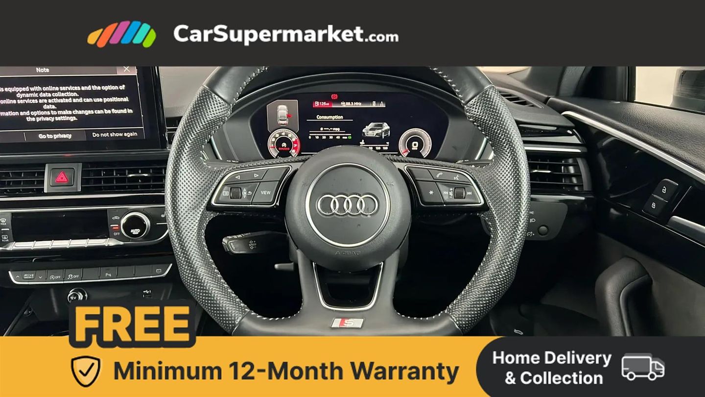 Parking Sensors, Apple CarPlay/Android Auto, Audi Virtual Cockpit, Bluetooth, Sat Nav, Digital Radio, Privacy Glass, Heated Front Seats, 19" Alloy Wheels;This 2020 Audi A4 TFSI Black Edition boasts exceptionally low mileage for its age, having covered just 30,054 miles. This particular example is a Euro 6 compliant model, powered by a 2.0 litre petrol engine. Its MOT is valid until May 2026, and it received its last service on 12th May 2025 at 28,486 miles, demonstrating excellent provenance. Notable features include the Audi Smartphone Interface, which seamlessly integrates Android Auto and Apple CarPlay, heated front seats for added comfort, and a Bluetooth interface for convenient connectivity. The Audi A4 TFSI Black Edition stands out with its desirable Black Edition trim, enhancing its already sophisticated styling. The very low mileage for a 2020 vehicle indicates it has been lightly used, suggesting a well preserved example compared to others on the market. Furthermore, its placement in a low insurance group is a significant advantage, potentially leading to lower running costs for its owner. This combination of low mileage, comprehensive servicing, and appealing features makes this Audi A4 a compelling choice.