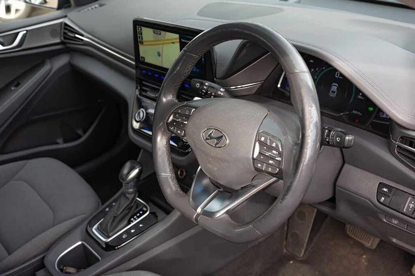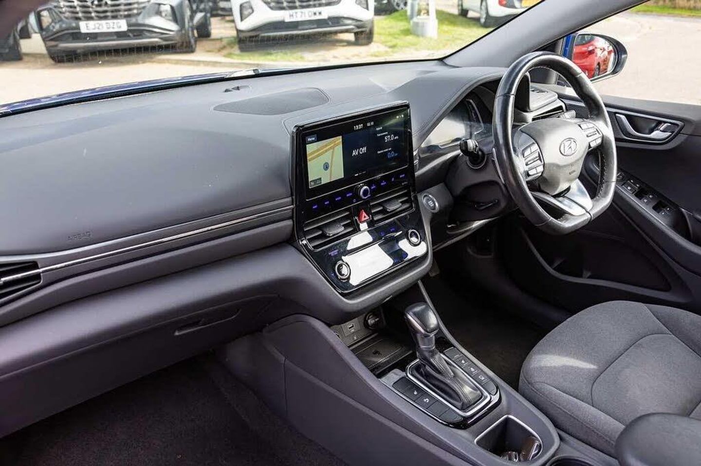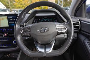 Electric front windows - anti trap + one touch, Heated rear windscreen, Rear electric windows, Solar glass with windscreen shade band, Tinted windows, Active air flap radiator grille, Body colour bumpers, Body colour door handles with chrome inserts, Bodyside mouldings, Chrome door scuff with ioniq logo, Chrome finish window surround, Chrome radiator grille, Rear roof spoiler with integrated LED brake light, Two tone rear bumper, Automatic headlights with dusk sensor, Door mirror puddle lights, High beam assist, LED daytime running lights, LED Headlights, LED indicators in door mirrors, LED rear fog light, Positioning Lights - LED, Rear LED lights, Anti-lock brake system (ABS), Autonomous emergency braking, Electronic stability control, Hill start assist control (HAC), Regenerative braking system, Traction control, Cruise control, Driver attention alert system, Eco driving assistant system (ECO DAS), Electric power steering with variable drive modes, Gear lever drive mode selector, Lane departure warning system with lane keep assist - LKAS, Parking system with rear camera and guidance system, Rear parking sensor, Rear view monitor, Auto dimming rear view mirror, Body colour door mirrors, Electric adjustable door mirrors, Electric heated door mirrors, Power folding door mirrors, 3x3 point rear seatbelts, Airbags - front, front side, curtain and drivers knee airbags, Front passenger airbag deactivation switch, Tyre pressure monitoring system with individual tyre pressure display, Apple car play/Android Auto, Bluetooth system, E-call, Roadside assistance, Voice recognition, Wireless phone charging pad, DAB Digital radio, Infinity sound system includes 1 centre, 2 tweeters, 2 front, 2 rear and 1 ext amp, Radio data system, Steering wheel audio, phone and cruise controls, USB and aux connection in front, Parking Brake - Foot Brake, 10.25'' touchscreen satellite navigation includes traffic messaging channel, mapcare, live services and bluelink, Supervision cluster with 7'' high resolution TFT LCD, Windscreen washer fluid sensor and warning indicator, Dual zone climate control, 12V power outlets, Centre console storage, Chrome interior door handles, Cloth upholstery, Front centre armrest with storage compartment, Front cupholder, Heated steering wheel, Leather wrapped steering wheel, Luggage net, Paddle shifter, Rear centre console with air vents, Sunglasses holder, USB - driver arm rest (charging only), Centre interior light, Illuminated luggage compartment, Interior mood lighting, Map and reading lights, Driver/passenger sunvisors with illuminated vanity mirrors, 60/40 split folding rear seat, Driver seat height adjust, Driver's electric adjustable lumbar support, Front head restraints with vertical and horizontal adjustment, Front seat and rear pockets, Heated front seats, Manual height adjustable front passenger seat, Vertical adjustment rear head restraints, Deadlocks, Immobiliser, Keyless smart entry with push button start, Remote central locking, 15'' Design B alloy wheels, Tyre repair kit