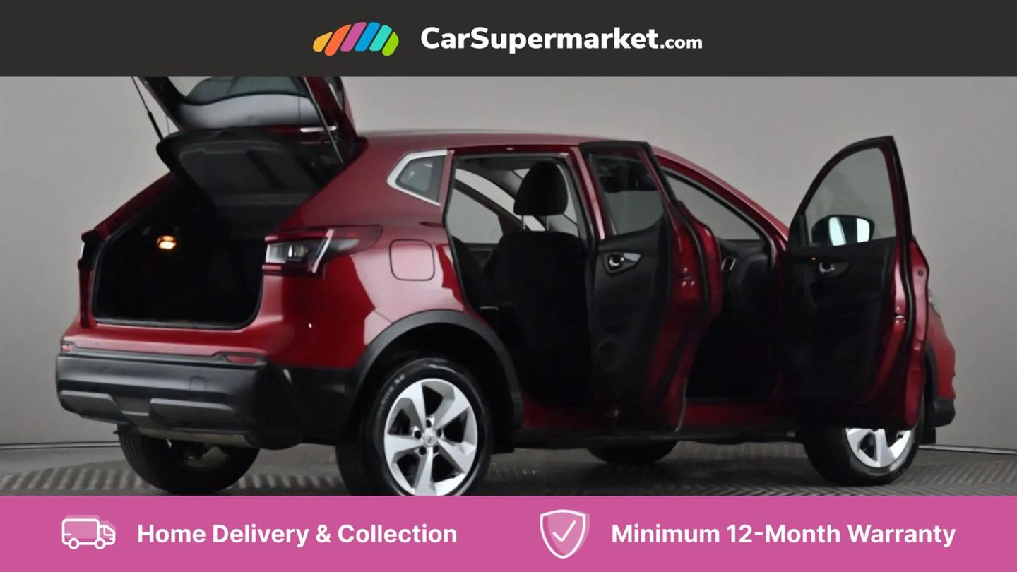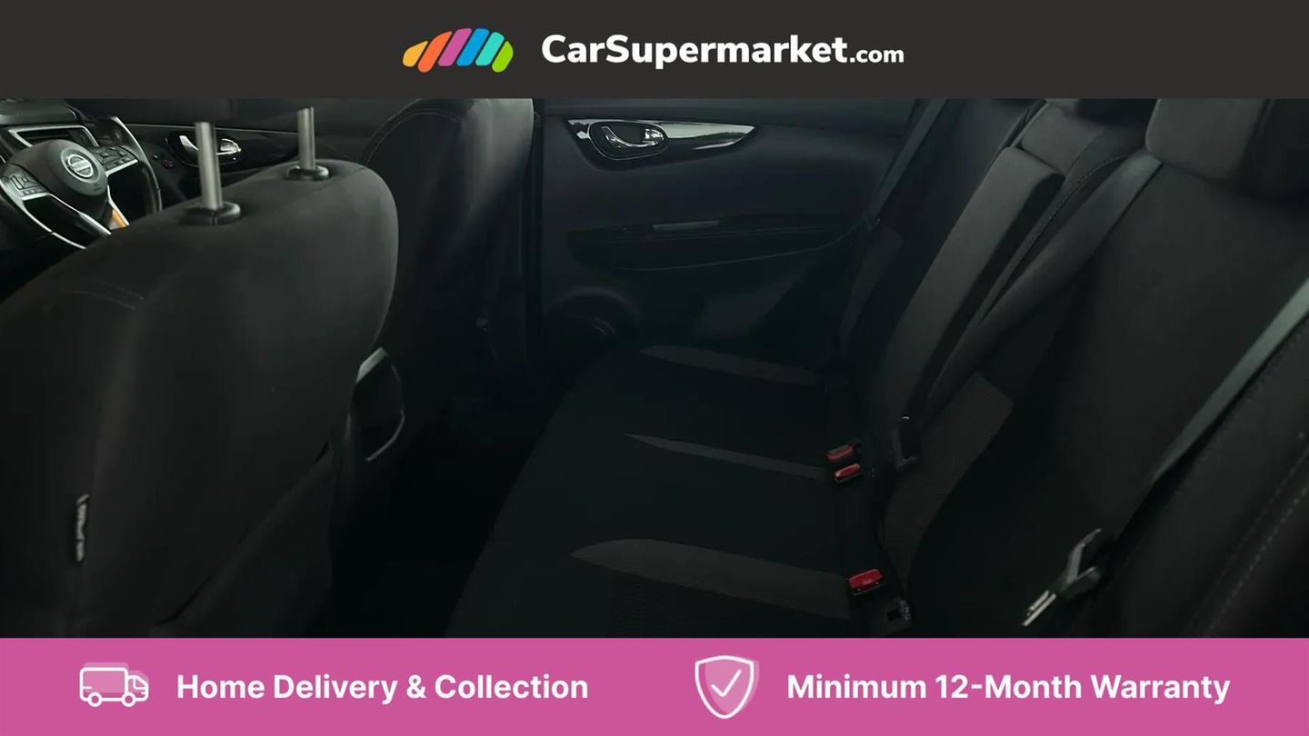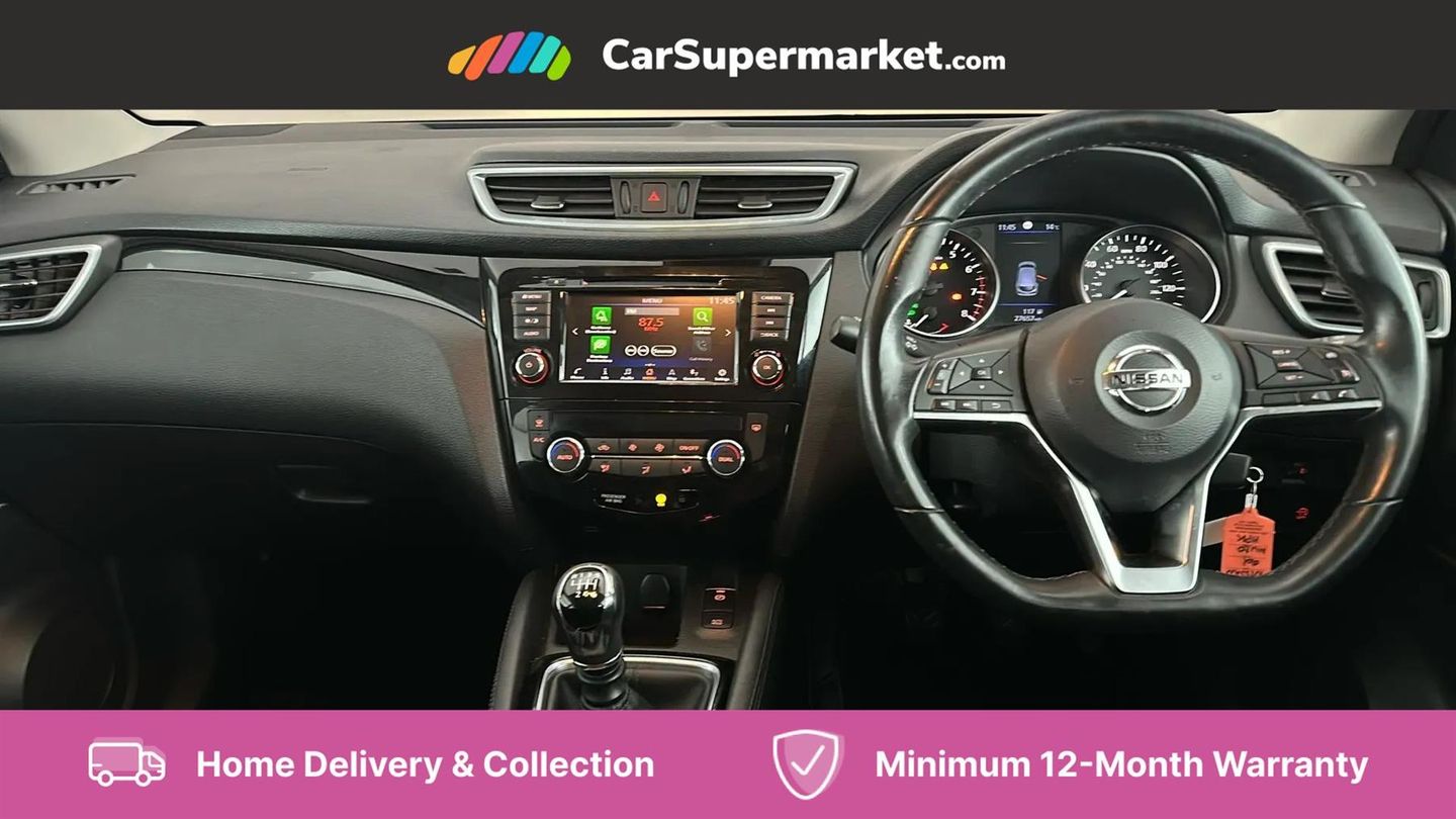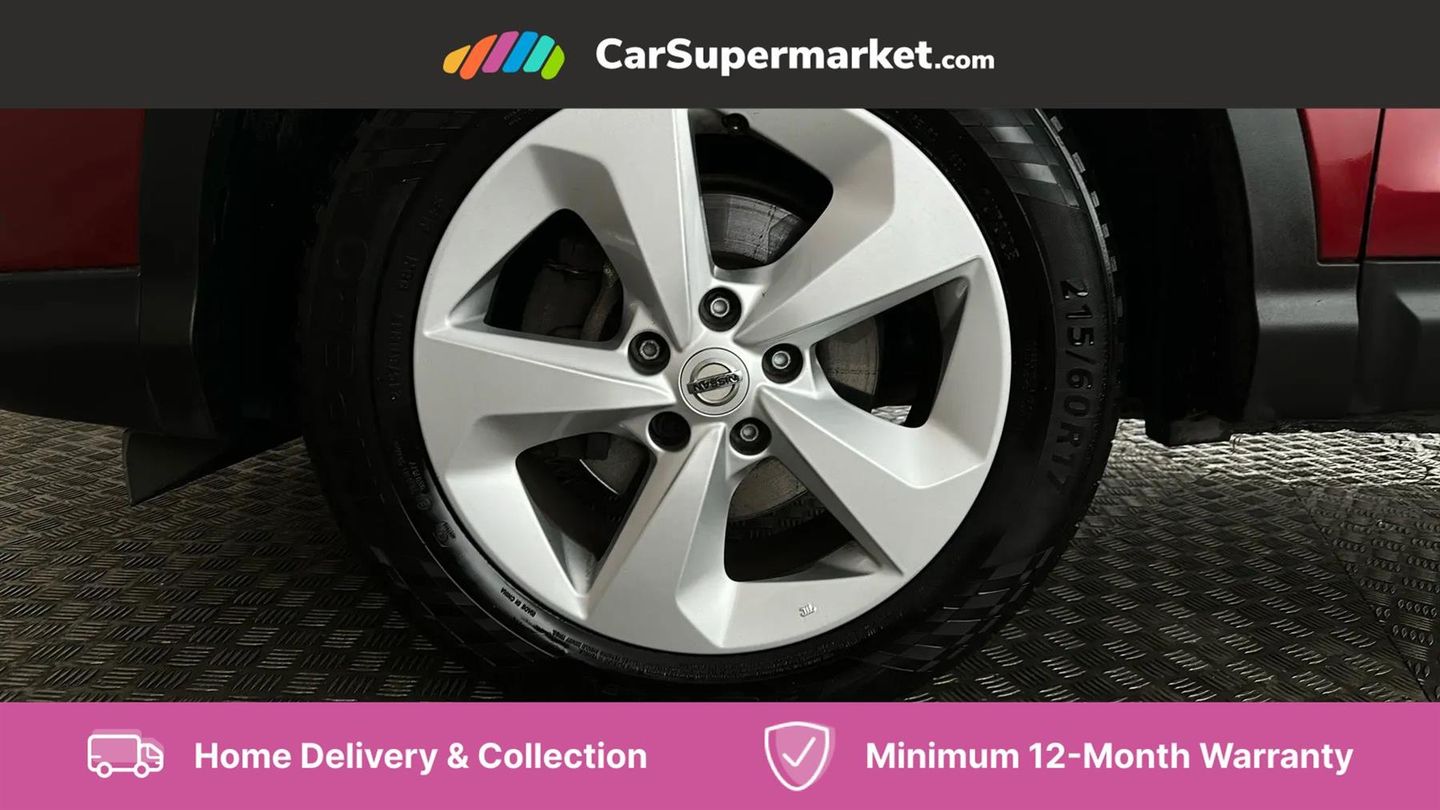 Advanced drive assist display 5'' TFT coloured screen,Android Auto,Apple CarPlay preparation,Bluetooth connectivity,Cruise control + speed limiter,Electric speed sensitive power steering,Front parking sensors,Lane departure warning system,Nissan connect evo 7" touchscreen navigation and entertainment system,Normal or sport selectable steering,Outside temperature sensor,Rear parking sensors,Rear view camera,Service interval indicator,Smartphone integration,Stop/start system,Tomtom connected services,Traffic sign recognition,Trip computer,Voice control system,Nissan chassis control (intelligent ride control, intelligent trace control, intelligent engine brake),6 speakers,AM/FM radio, CD audio system,Aux-in socket,DAB Digital radio,Steering wheel mounted audio controls,USB port,Anti dazzle rear view mirror,Auto wipers,Body colour bumpers,Body coloured door handles,Body coloured door mirrors,Chrome window surround,Daytime running lights dip function when turn signal applied,Electric folding door mirrors,Electric front and rear windows with one touch illuminated window controls,Electric front/rear windows,Electrically adjustable door mirrors,Front fog lights,Halogen headlights,Heated door mirrors,High beam assist,Intelligent auto headlights,LED indicators in door mirrors,Rear roof spoiler,Rear wiper with reverse link,Shark fin antenna,Signature LED daytime running lights,Underbody vortex generators,2 X front 12v power sockets,3 height adjustable rear headrests,60/40 split folding rear seat,Ambient lighting in centre console,Boot lighting,Centre console storage box/armrest,Chrome interior door handles,Cloth upholstery,Driver's seat manual height adjust,Dual zone climate control,Front and rear door pockets with bottle holders,Front and rear seat belt pre-tensioners with load limiters,Height adjustable front headrests,ISOFIX on outer rear seats,Leather D shaped steering wheel,Leather gear lever,Leather knee pad,Manual height adjustable front passenger seat,Manual lumbar support on driver seat,Parcel shelf stow function under luggage board,Pollen filter,Rear armrest with 2 cupholders,Tilt/telescopic adjustable steering wheel,6 airbags - Driver, front passenger, curtain and side airbags,ABS, ESP, EBD and brake assist,Auto hold function,Child locks on rear doors,Electronic parking brake,Front and rear seat belt warning,Front passenger airbag deactivation,Height adjustable front seatbelts,Hill start assist,Intelligent emergency braking with pedestrian recognition,Three 3 point rear seatbelts,Tyre pressure monitoring system,Anti-theft immobiliser,Remote central locking,Thatcham Cat.1 alarm,Piano black dash trim,17" Alloy wheels,Tyre puncture repair kit
