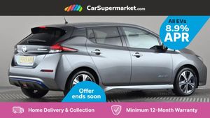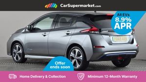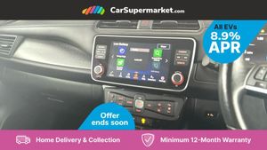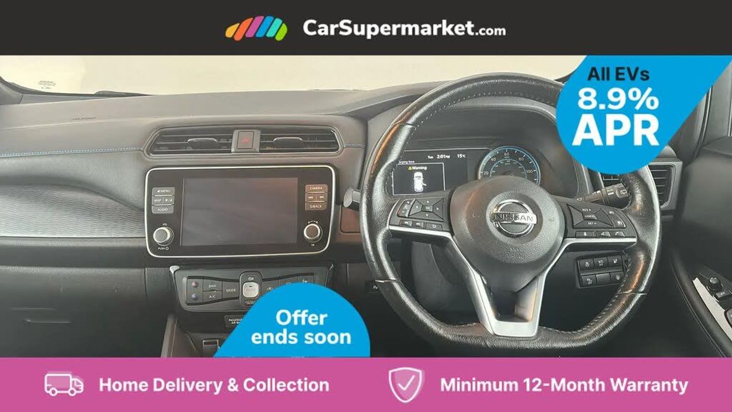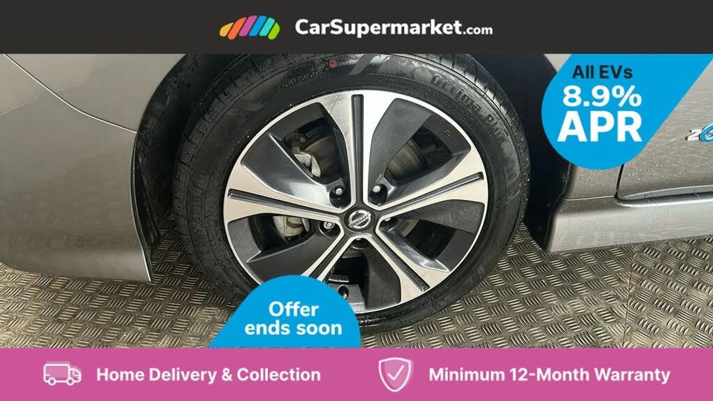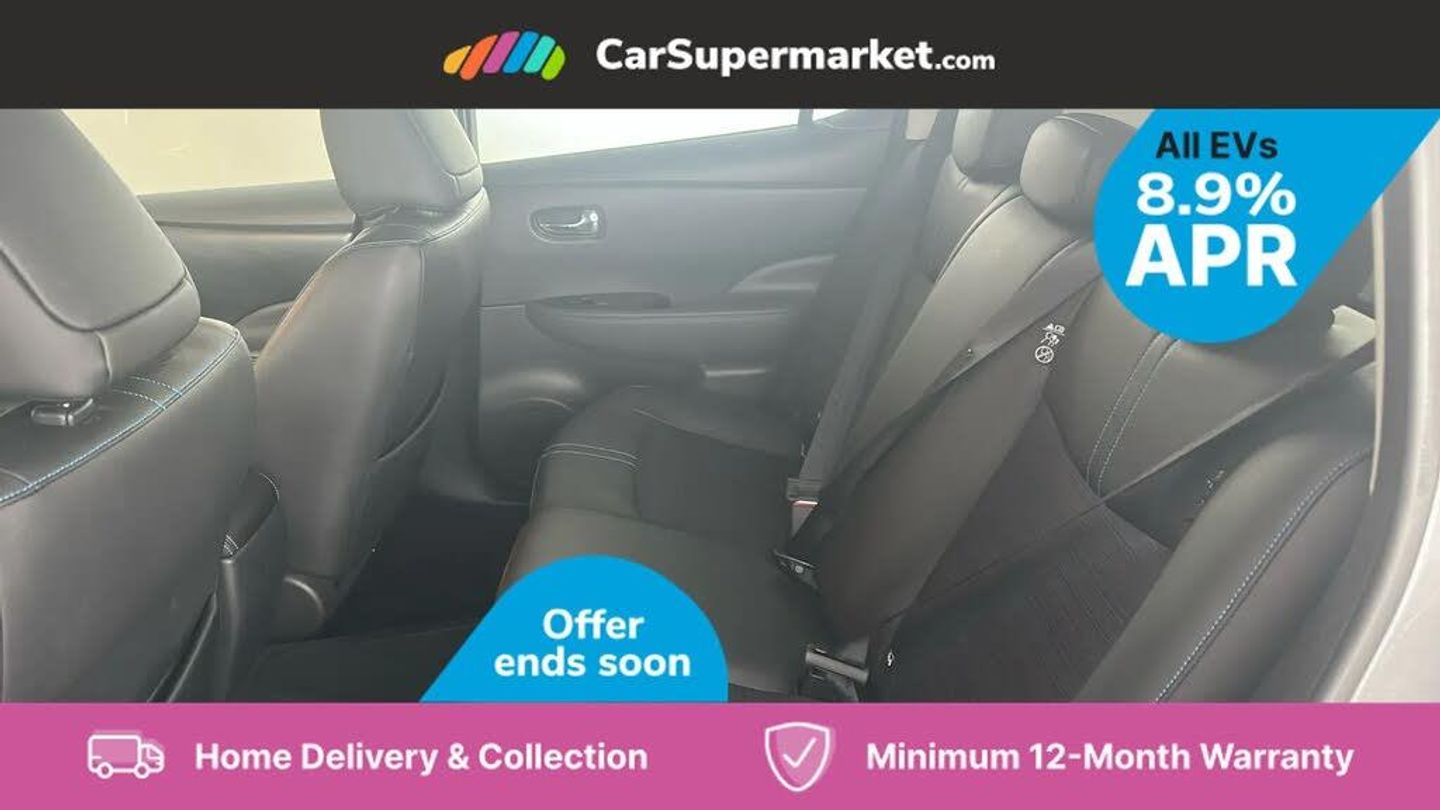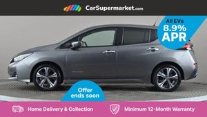 7" Combimeter,Apple car play/Android Auto,Blind spot warning,E Pedal,Intelligent Cruise control (ICC),Intelligent lane intervention,Lane departure warning system,Nissan connect EV 8" touch screen navigation and entertainment system,Push button starter,Rear cross traffic alert,Rear view camera,Speed limiter,Speed sensitive power steering,Telematics system,Trip computer,Voice control system,6.6 kw On-board charger,6.6 kW onboard charger,EVSE charging cable,6 speakers,AM/FM/DAB audio system,Aux-in socket,Remote audio control,Two rear USB sockets,USB port,Anti dazzle rear view mirror,Auto dimming rear view mirror,Automatic activation of hazard warning lights,Automatic rain sensing wipers,Body coloured door mirrors with integrated LED indicators,Chrome door handles,Door mirrors with turn signal and puddle lamps,Electric front/rear windows,Electrically adjustable and folding door mirrors,Follow me home headlights,Gloss black finish B pillar,High beam assist,Illuminated charge port,Intelligent auto headlights,LED signature daytime running lights,LED tail light signature,Metallic blue rear bumper accent,Rear privacy glass,60/40 split folding rear seat,Automatic air conditioning with timer and heater,Front centre console and armrest,Front head restraints,Front seatback pockets,Heat pump system with remote control,Height adjustable driver seat,Isofix child seat anchor points,Leather D shaped steering wheel,Manual adjust driver/passenger seats,PTC (Positive Temp Co-efficent) heater,Quick charge port,Rear assist grips,Rear head restraints,Rear heater duct,Synthetic leather/cloth upholstery,Tilt adjustable steering wheel,Heat pack - LEAF,Tech Pack - Leaf,3 point front seatbelts with pre-tensioners,3x3 point rear seatbelts,ABS with EBD and brake assist,Curtain airbags,Driver and passenger airbags,Front seatbelt pretensioners + load limiters,Height adjustable front seatbelts,Hill start assist,Intelligent emergency braking with pedestrian recognition,Intelligent trace control,Seatbelt reminder for driver and front passenger,Side airbags,Traction control,Tyre pressure monitoring system,VDC Dynamic Vehicle Control,Deadlock,Immobiliser,Nissan i-key,Remote central locking,Thatcham Cat.1 alarm,17" Alloy wheels