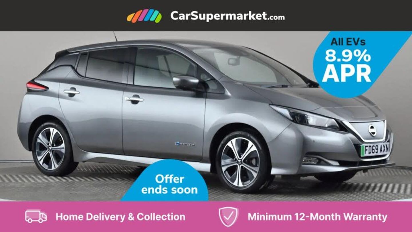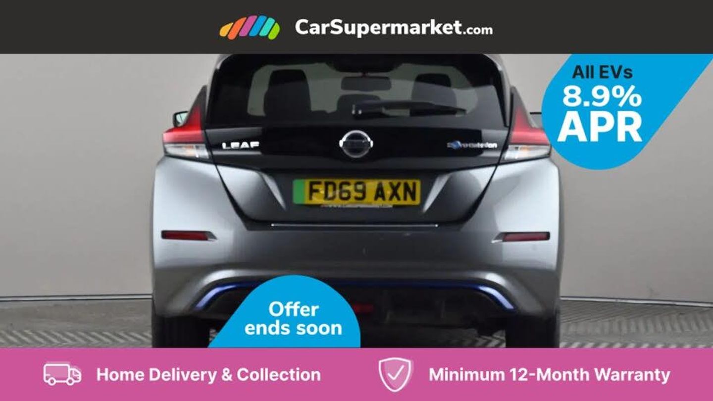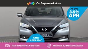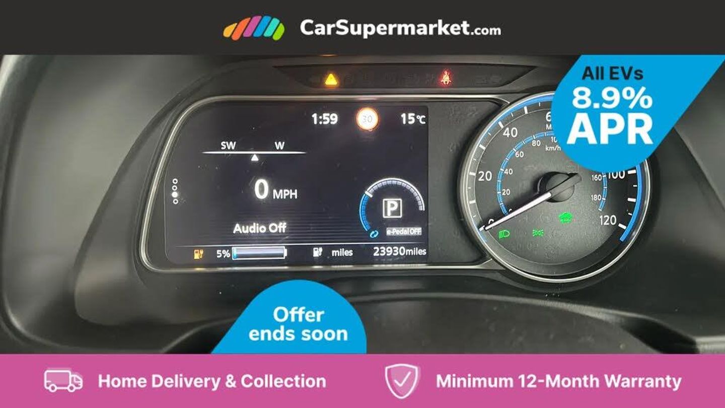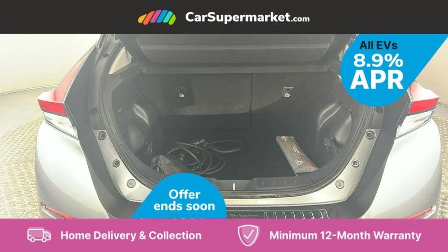 7" Combimeter,Apple car play/Android Auto,Blind spot warning,E Pedal,Intelligent Cruise control (ICC),Intelligent lane intervention,Lane departure warning system,Nissan connect EV 8" touch screen navigation and entertainment system,Push button starter,Rear cross traffic alert,Rear view camera,Speed limiter,Speed sensitive power steering,Telematics system,Trip computer,Voice control system,6.6 kw On-board charger,6.6 kW onboard charger,EVSE charging cable,6 speakers,AM/FM/DAB audio system,Aux-in socket,Remote audio control,Two rear USB sockets,USB port,Anti dazzle rear view mirror,Auto dimming rear view mirror,Automatic activation of hazard warning lights,Automatic rain sensing wipers,Body coloured door mirrors with integrated LED indicators,Chrome door handles,Door mirrors with turn signal and puddle lamps,Electric front/rear windows,Electrically adjustable and folding door mirrors,Follow me home headlights,Gloss black finish B pillar,High beam assist,Illuminated charge port,Intelligent auto headlights,LED signature daytime running lights,LED tail light signature,Metallic blue rear bumper accent,Rear privacy glass,60/40 split folding rear seat,Automatic air conditioning with timer and heater,Front centre console and armrest,Front head restraints,Front seatback pockets,Heat pump system with remote control,Height adjustable driver seat,Isofix child seat anchor points,Leather D shaped steering wheel,Manual adjust driver/passenger seats,PTC (Positive Temp Co-efficent) heater,Quick charge port,Rear assist grips,Rear head restraints,Rear heater duct,Synthetic leather/cloth upholstery,Tilt adjustable steering wheel,Heat pack - LEAF,Tech Pack - Leaf,3 point front seatbelts with pre-tensioners,3x3 point rear seatbelts,ABS with EBD and brake assist,Curtain airbags,Driver and passenger airbags,Front seatbelt pretensioners + load limiters,Height adjustable front seatbelts,Hill start assist,Intelligent emergency braking with pedestrian recognition,Intelligent trace control,Seatbelt reminder for driver and front passenger,Side airbags,Traction control,Tyre pressure monitoring system,VDC Dynamic Vehicle Control,Deadlock,Immobiliser,Nissan i-key,Remote central locking,Thatcham Cat.1 alarm,17" Alloy wheels