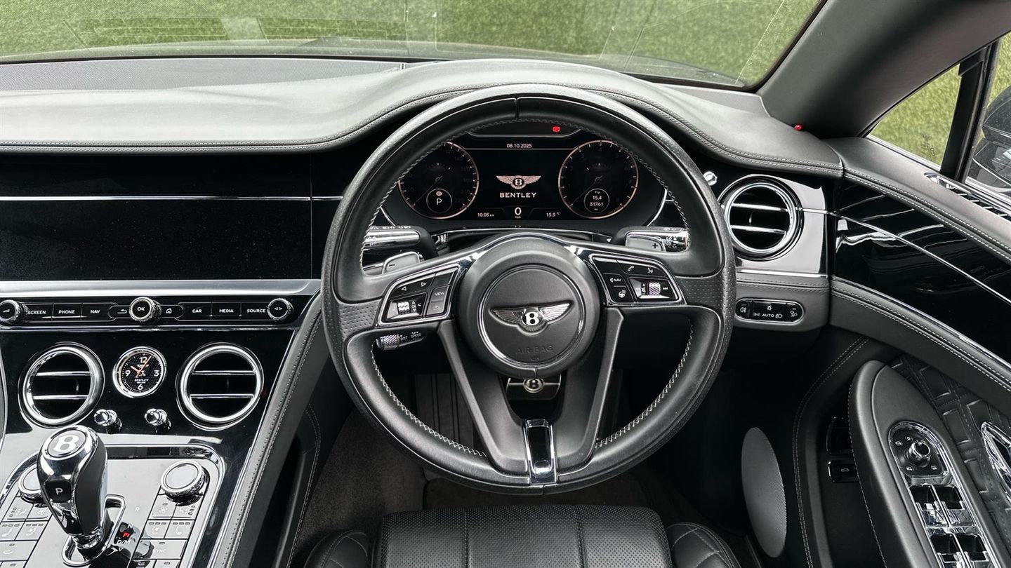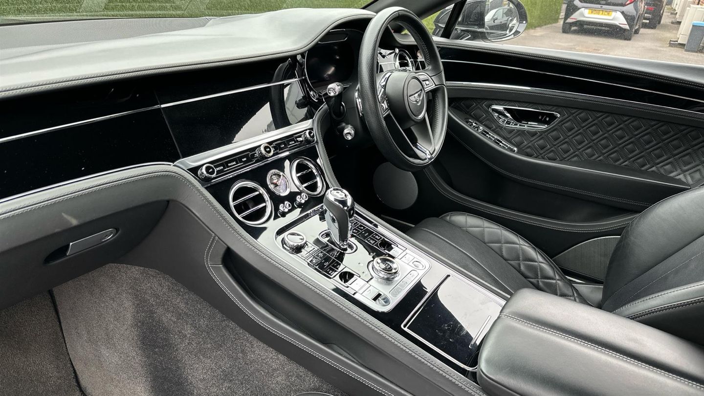 Bentley Continental GT W12 in Black Crystal with a Beluga Black interior with Mulliner Quilted Stitch. Mulliner Driving Specification with Black and Polished Edge Alloy Wheel, LED Welcome Lamps - By Mulliner, Touring Specification, Front Seat Comfort Specification, Heated, Single Tone, 3 Spoke, Indented Hide Trimmed Steering Wheel, Bentley Rotating Display, Inductive Phone Charger, Remote Controlled Garage Door Opener, Contrast Stitching, City Specification, Mood Lighting Specification..