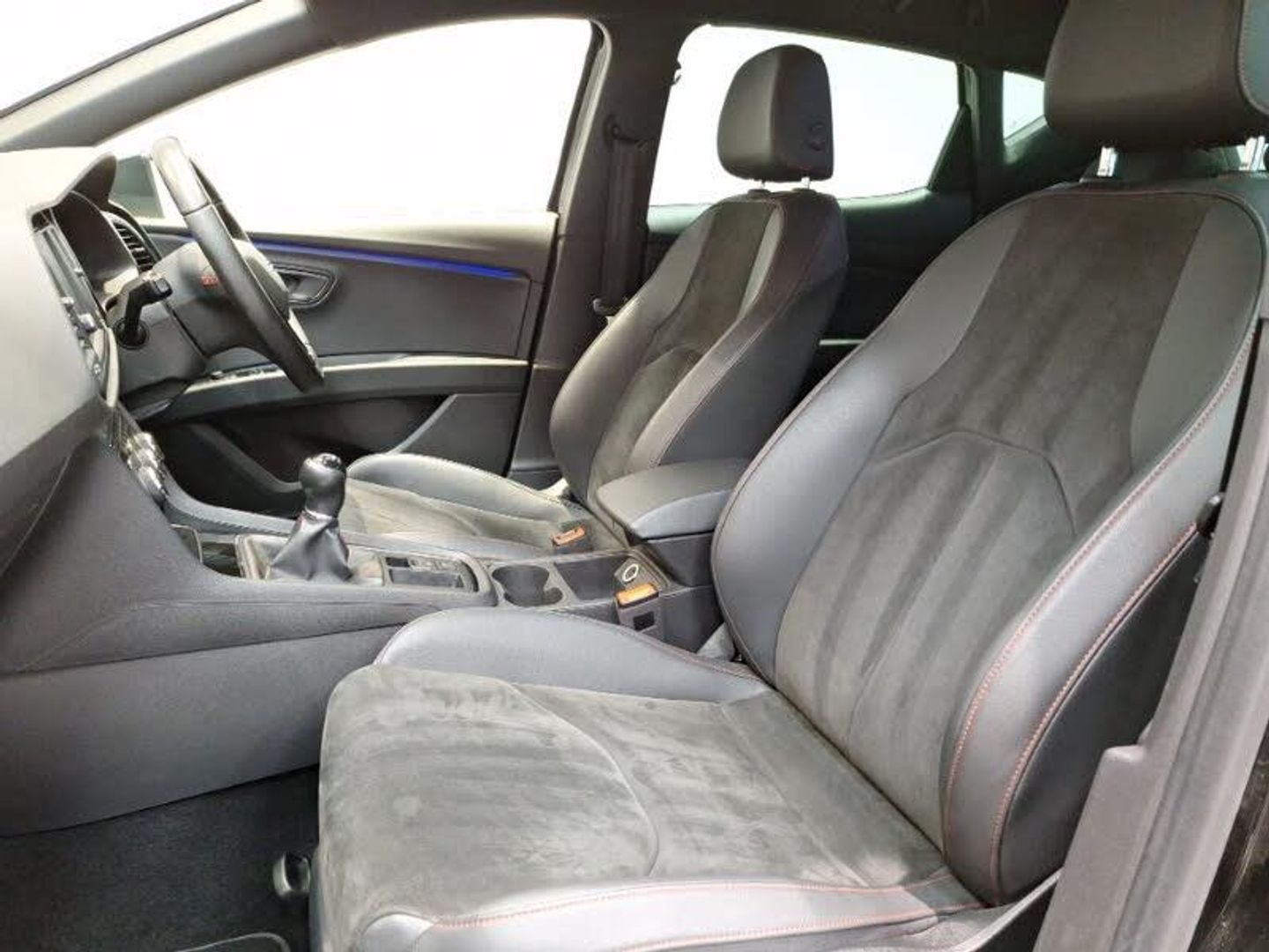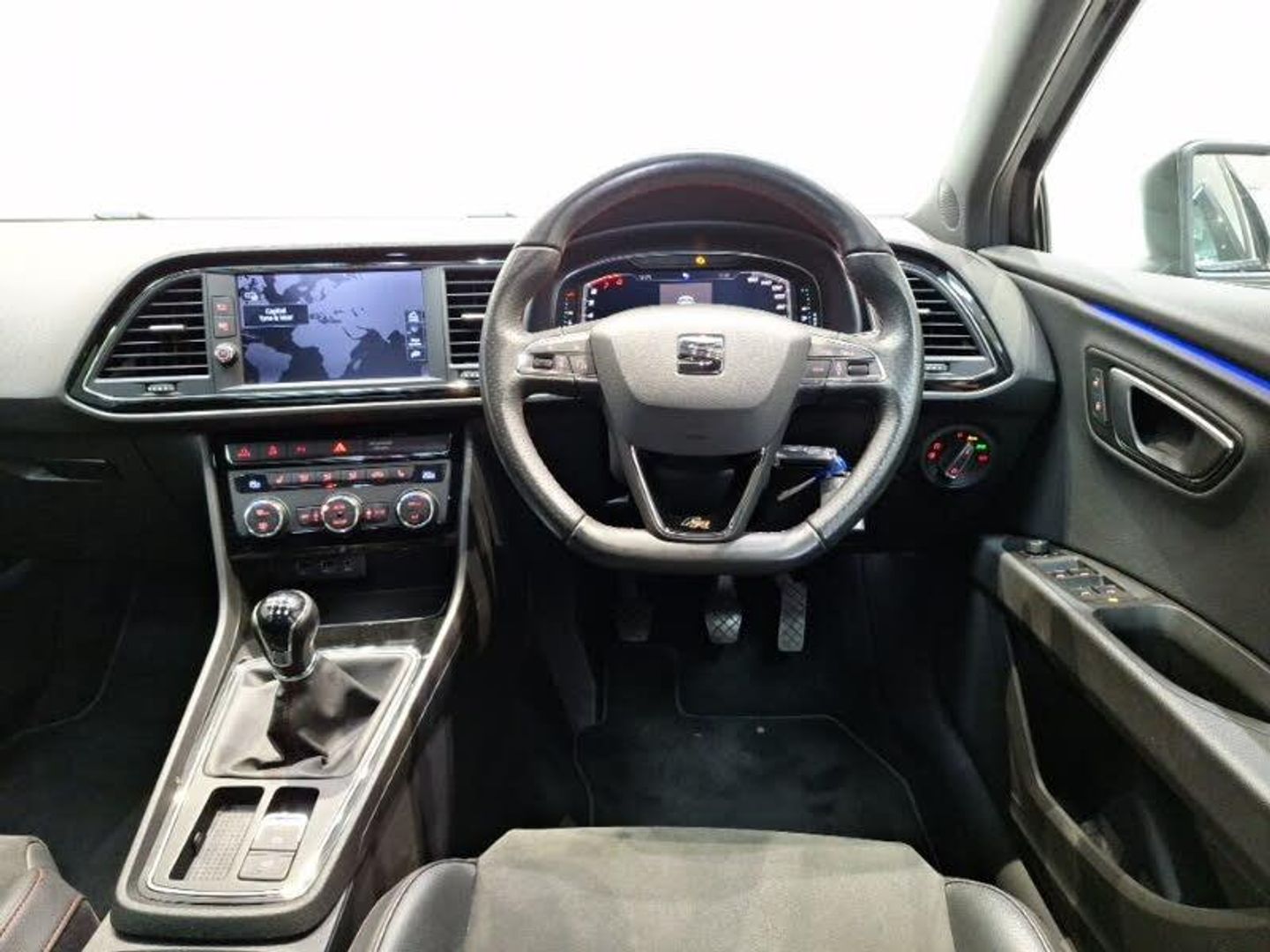 Navigation system 3D map display, high resolution colour driver display, two SD card slots, Media system plus with 8" display, 4 USB, 8 speakers, CD, voice control, DAB, bluetooth and handsfree, steering wheel mounted audio and phone control, Full Link Smartphone Integration with Mirror Link, Apple Car Play, Google Android Auto with USB Type C cable for Apple and Android compatibility, Front assist with pedestrian protection, Front and rear parking sensors, Digital cockpit, SEAT USB media cable, Auxiliary input socket, Winter pack - Leon, Convenience pack+ - Leon, Electric folding door mirrors, Electric front/rear windows, Electrically adjustable and heated door mirrors, Dual zone climate control, 2 folding remote keys with window open/close function and boot opening/door mirror folding function, Electro-mechanical power steering, ISOFIX points in outer rear seats with top tether anchorage points, Remote central locking + deadlocks, Front sport seats in microsuede cloth - Black with red stitching