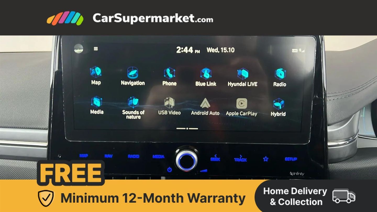 10.25" touchscreen satellite navigation includes traffic messaging channel, mapcare, live services and bluelink,Apple car play/Android Auto,Bluetooth system,Cruise control,Driver attention alert system,E-call,Eco driving assistant system (ECO DAS),Electric power steering with variable drive modes,Gear lever drive mode selector,Lane departure warning system with lane keep assist - LKAS,Parking Brake - Foot Brake,Parking system with rear camera and guidance system,Rear parking sensor,Rear view monitor,Roadside assistance,Supervision cluster with 7" high resolution TFT LCD,Voice recognition,Windscreen washer fluid sensor and warning indicator,Wireless phone charging pad,DAB Digital radio,Infinity sound system includes 1 centre, 2 tweeters, 2 front, 2 rear and 1 ext amp,Radio data system,Steering wheel audio, phone and cruise controls,USB and aux connection in front,Active air flap radiator grille,Auto dimming rear view mirror,Automatic headlights with dusk sensor,Body colour bumpers,Body colour door handles with chrome inserts,Body colour door mirrors,Bodyside mouldings,Chrome door scuff with ioniq logo,Chrome finish window surround,Chrome radiator grille,Door mirror puddle lights,Electric adjustable door mirrors,Electric front windows - anti trap + one touch,Electric heated door mirrors,Heated rear windscreen,High beam assist,LED daytime running lights,LED Headlights,LED indicators in door mirrors,LED rear fog light,Positioning Lights - LED,Power folding door mirrors,Rear electric windows,Rear LED lights,Rear roof spoiler with integrated LED brake light,Solar glass with windscreen shade band,Tinted windows,Two tone rear bumper,12V power outlets,60/40 split folding rear seat,Centre console storage,Centre interior light,Chrome interior door handles,Cloth upholstery,Driver seat height adjust,Driver's electric adjustable lumbar support,Driver/passenger sunvisors with illuminated vanity mirrors,Dual zone climate control,Front centre armrest with storage compartment,Front cupholder,Front head restraints with vertical and horizontal adjustment,Front seat and rear pockets,Heated front seats,Heated steering wheel,Illuminated luggage compartment,Interior mood lighting,Leather wrapped steering wheel,Luggage net,Manual height adjustable front passenger seat,Map and reading lights,Paddle shifter,Rear centre console with air vents,Sunglasses holder,USB - driver arm rest (charging only),Vertical adjustment rear head restraints,3x3 point rear seatbelts,Airbags - front, front side, curtain and drivers knee airbags,Anti-lock brake system (ABS),Autonomous emergency braking,Electronic stability control,Front passenger airbag deactivation switch,Hill start assist control (HAC),Regenerative braking system,Traction control,Tyre pressure monitoring system with individual tyre pressure display,Deadlocks,Immobiliser,Keyless smart entry with push button start,Remote central locking,15" Design B alloy wheels,Tyre repair kit