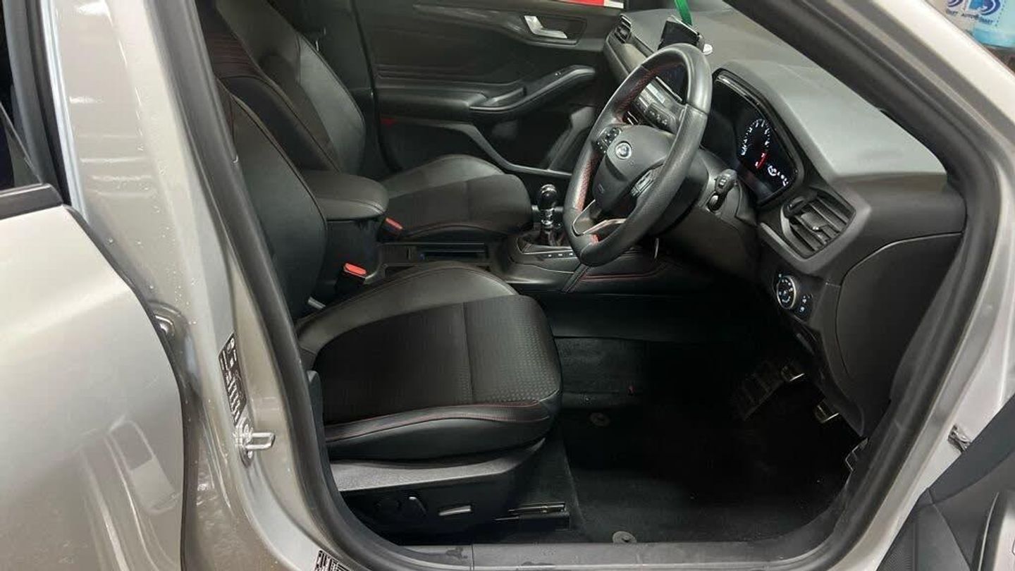 18in Alloy Wheels - 5x2 Spoke - Matt Black - Machined Finish, Airbags - Driver and Front Passenger, Airbags - Front and Rear Side Curtain, Airbags - Front Side Impact, Alloy Finish Pedals, Automatic Dimming Rear View Mirror, Body Colour Bumpers, Cruise Control with Speed Limiter, Dark Headliner, DEATC - Dual-Zone Electronic Automatic Temperature Control, Door Handles - Body Colour, Door Mirrors - Electrically-operated - Heated - Power-Foldable - Body Colour Housings - Side Indicators - Puddle Lights, Electric Parking Brake, ESC - Electronic Stability Control, Flat Bottomed Steering Wheel with Red Stitching, Ford Easy Fuel System, Ford SYNC3 DAB Navigation System, FordPass Connect, Foundry Partial Leather and Salerno Leather - Vinyl Bolster - Ebony with Generic Red Stitching, Front and Rear Floor Mats with Red Stitching, Front and Rear Seatbelt Minder, Front Passenger Airbag Deactivation Switch, Front Seat - Drivers Manual Lumbar Support Adjustment, Front Seats - Driver and Passenger Heated Seats, Gear Knob - Aluminium, Halogen Reflector Headlights, Headlights - Automatic On-Off, Instrument Cluster - 4.2in Colour TFT Display, Keyless Start with Ford Power Start Button, Lane Keeping Aid with Lane Departure Warning, Large Rear Spoiler - Body Colour with Centre High Mounted Stop Light, LED Daytime Running Lights, LED Front Fog Lights with Cornering Function, Moondust Silver, MyKey, Parking Sensor - Front and Rear, Passenger Seat Manual Height and Lumbar Adjust, Polished Twin Tailpipe, Post Collision Braking, Pre-Collision Assist with Autonomous Emergency Braking and Pedestrian-Cyclist Detection, Pre-Collision Assist with Pedestrian Detection, Quickclear Heated Windscreen, Rain Sensitive Windshield Wipers, Rear Centre Headrest, Rear Privacy Glass, Red Brake Calipers, Remote Central Locking and Engine Immobiliser, Selectable Drive Mode, Soft Console Knee Pads with Red Stitching, Spare Wheel - Mini Steel, Sports Tuned Suspension, Steering Wheel - 3-Spoke - Leather Trimmed, Steering Wheel - ST-Line Sports Style - Flat Bottom, Thatcham Category 1 Alarm, Trip Computer, Tyre Pressure Monitoring System, Unique Door and Instrument Panel Inserts, Unique ST-Line Upper and Lower Grille and Full Bodystyling Kit and ST-Line Wing Badges, Windows - Electrically Operated Front and Rear with One Touch Opening and Closing