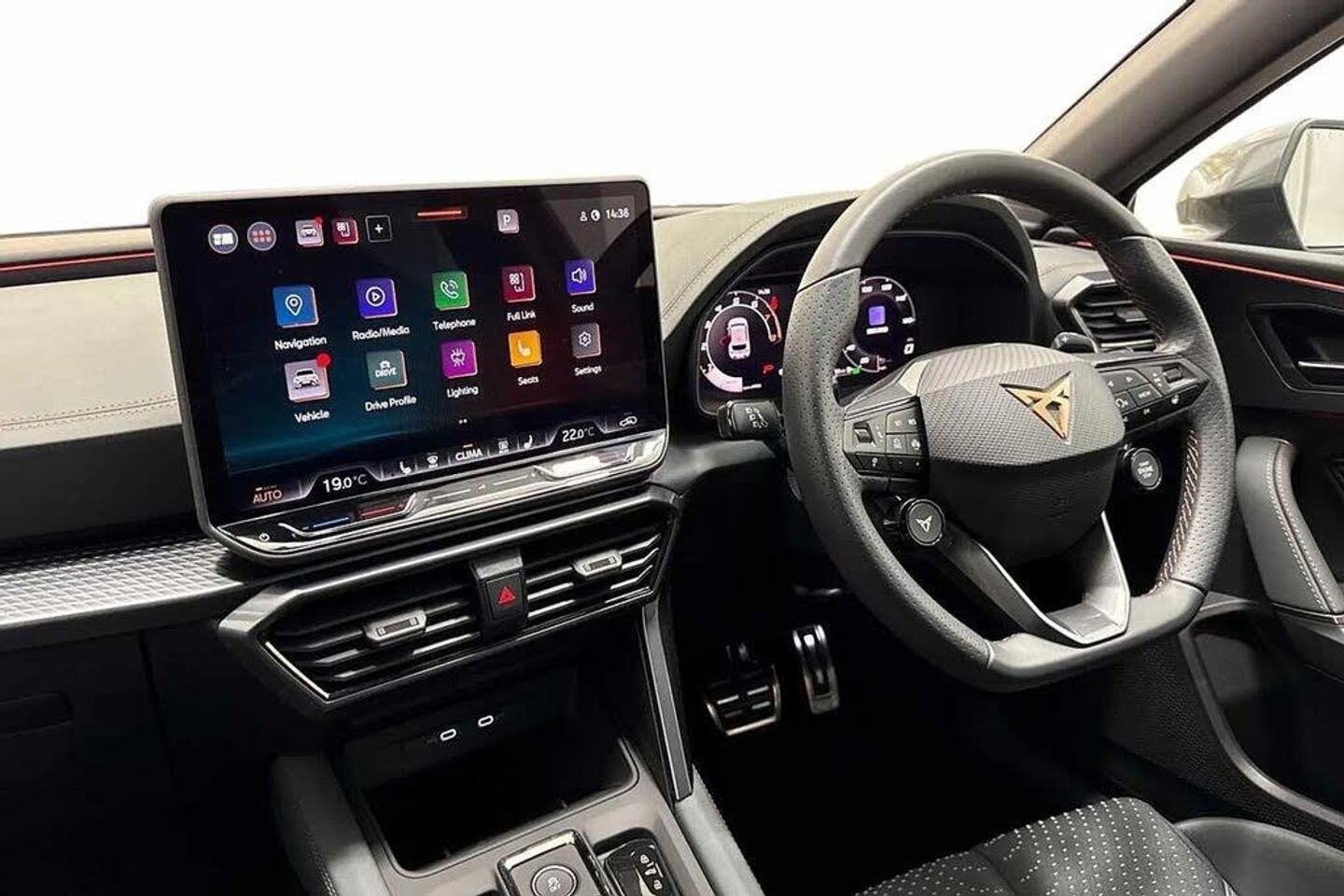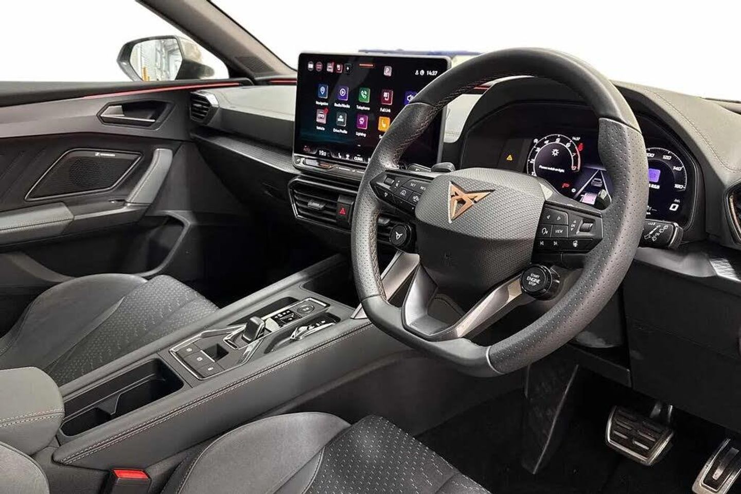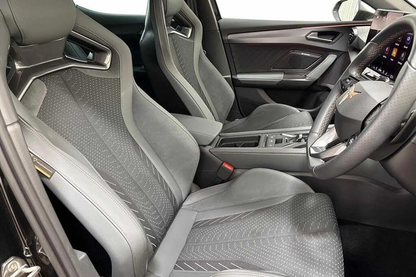 Dark tinted rear windows,Electric front/rear windows,Rain sensing wipers,Rear wash/wipe,Body colour door handles,Body coloured bumpers,Cupra sports bumpers,Rear side wing doors,High beam assist,LED front fog lamps with cornering function,LED rear fog lamp,Matrix LED Headlights with variable light distribution,Matrix Beam and Dynamic headlight range control,Separate daytime running light with automatic headlight control and coming home feature,Third brake light,Welcome light with logo projector in door mirrors,ABS,Akebono performance brake calipers,Brake control system - ESC and brake booster,Electronic parking brake,Hill hold control,Rear disc brakes,Adaptive cruise control with follow-to-stop and speed limiter,CUPRA drive profile selection with (Comfort/Sport/Individual),throttle response and gearshift mode,Dynamic road sign display,Front and rear parking sensors,Front assist with forward collision warning braking reaction to vehicles,pedestrians and cyclists,Intelligent park assist,Rear view camera,Side and exit assist,Auto dimming rear view mirror,Electrically adjustable,heated and folding door mirrors,3 point seatbelts on all rear seats,Child proof door locks,Driver and front passenger airbags with front passenger airbag de-activation,front side and curtain airbags,Pre-crash front and rear seat belt tensioner,window closure and hazard lights,Seat belt reminder for front and rear seats,Tiredness recognition system,Tyre pressure monitoring system,E-call,Full link smartphone integration with Mirror Link,wireless Apple CarPlay and wired Google Android Auto,Auxiliary input socket,Immersive by Sennheiser TM - 10 speakers,1 central speaker,1 subwoofer,Lockable tailgate,Start/stop system with regenerative braking,Wireless phone charger,Digital cockpit,Four x USB Type C ports (2 in front and 2 in rear),Lane change assist with emergency assist,RPM,trip computer,outside temp gauge,instrument light brightness,low fuel warning light,lights on reminder,gearshift indicator,Service interval indicator,Chrome and copper interior detailing,3 seat bench in 2nd row,5 headrests,60/40 split rear bench seat with armrest,Electrically adjustable driver seat and lumbar support with memory function + manually adjustable passenger seat,Heated front seats,ISOFIX points in outer rear seats with top tether anchorage points,Single front passenger seat,Three zone climate control,12v power supply in centre console,Black headlining,Cupra sports pedals,CUPRA Supersports,heated steering wheel with satellite buttons,Folding boot cover,Front centre armrest,Height/reach adjust steering wheel,Illuminated interior front door sills,Textile cloth upholstery,Ambient lighting (glovebox,footwell,ambient lighting multicoloured),Front and rear reading lights X 4,Interior wraparound lighting,Sunvisors with illuminated mirror,Dynamic and comfort pack - Leon Cupra,Media system plus with 12.9" display + navigation pack - Leon Cupra,Anti theft alarm system with interior monitoring in cab,backup horn and towing protection,KESSY Advanced - Keyless start,keyless entry,Locking wheel bolts,19" Hailstorm forged machined R black and copper alloy wheel with 91Y tyres,Breakdown kit,Tool kit