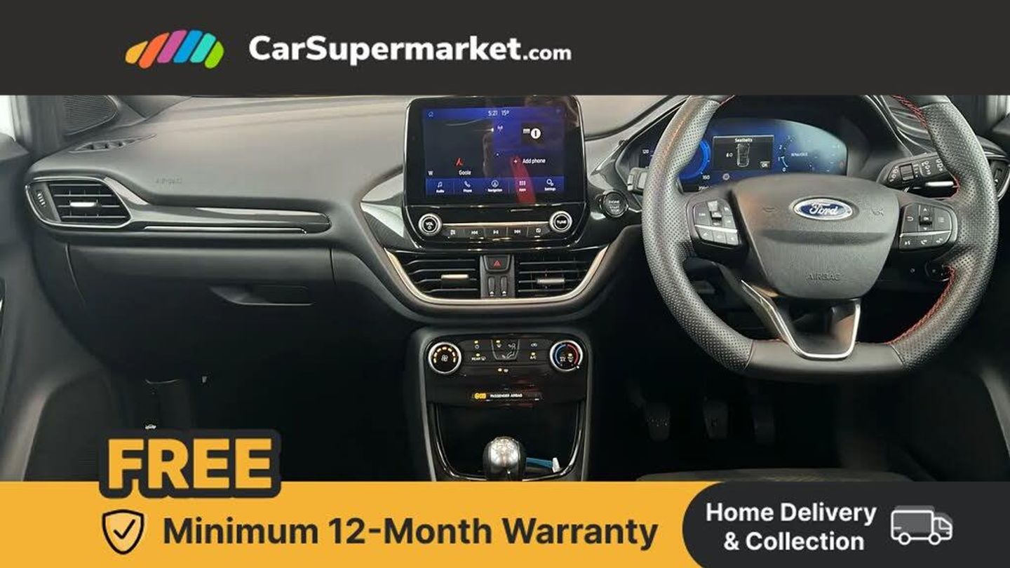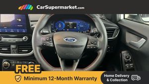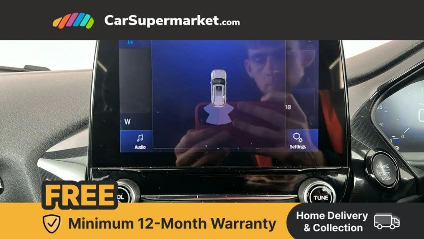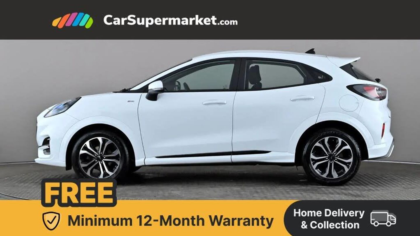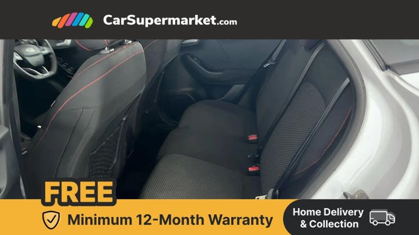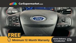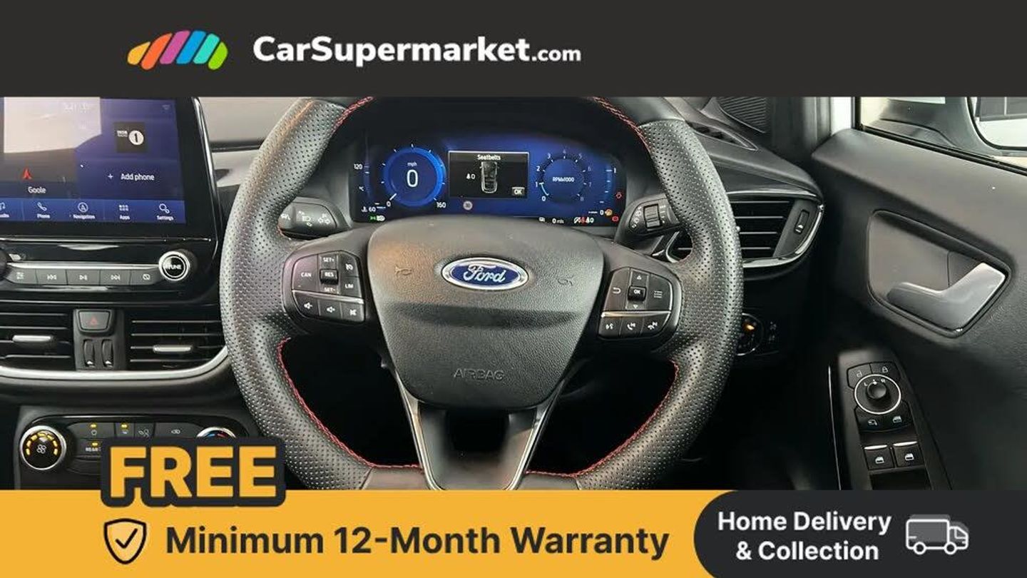 Driver impairment monitor,Emergency call service,Ford easy fuel,Full digital 12.3" instrument cluster,Lane keeping aid with lane departure warning,Power assist steering,Power start button,Rear parking sensor,Selectable drive modes(Normal, sport, Eco, trail, slippery),Speed sign recognition,Sport suspension,Automatic headlights with auto high beam,Automatic rain sensing wipers,LED rear lamps,Power foldable heated door mirrors with puddle lamps,Projector headlamps with LED day time running lights and front fog lamps,Quickclear heated windscreen,Rear side wing doors,Rear wiper,ST-Line body styling kit with unique grille and large body colour rear spoiler,Third brake light,3 seat bench in 2nd row,Centre console with armrest and stowage,Ford megabox extended bootspace,Front and rear head restraints,Manual 2 way passenger seat adjustment,Manual 4 way driver seat adjust with lumbar adjustment,Single front passenger seat,ST- Line cloth trim with red stitching,ST-Line flat bottomed sensico leather steering wheel with leather handbrake and aluminium gear knob,Ford SYNC 3 navigation pack - Puma,3 rear seatbelts,Child safety lock,Electronic stability control (ESC) and hill start assist,Pedestrian/cyclist detection & post-collision braking,Pre collision assist with autonomous emergency braking,Tyre pressure monitoring system (TPMS),Thatcham alarm,Frozen White