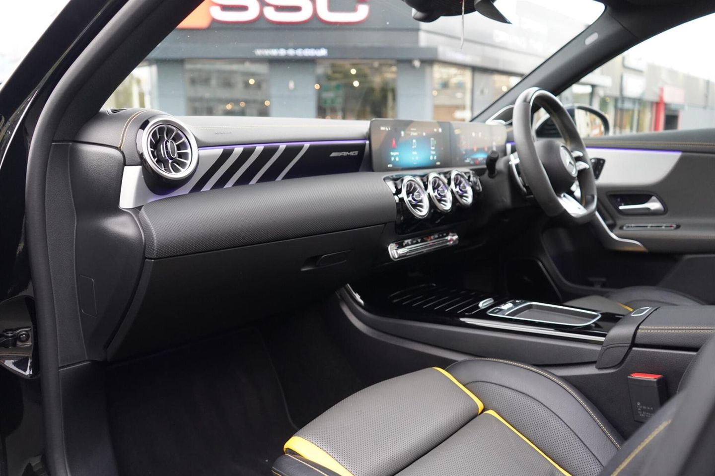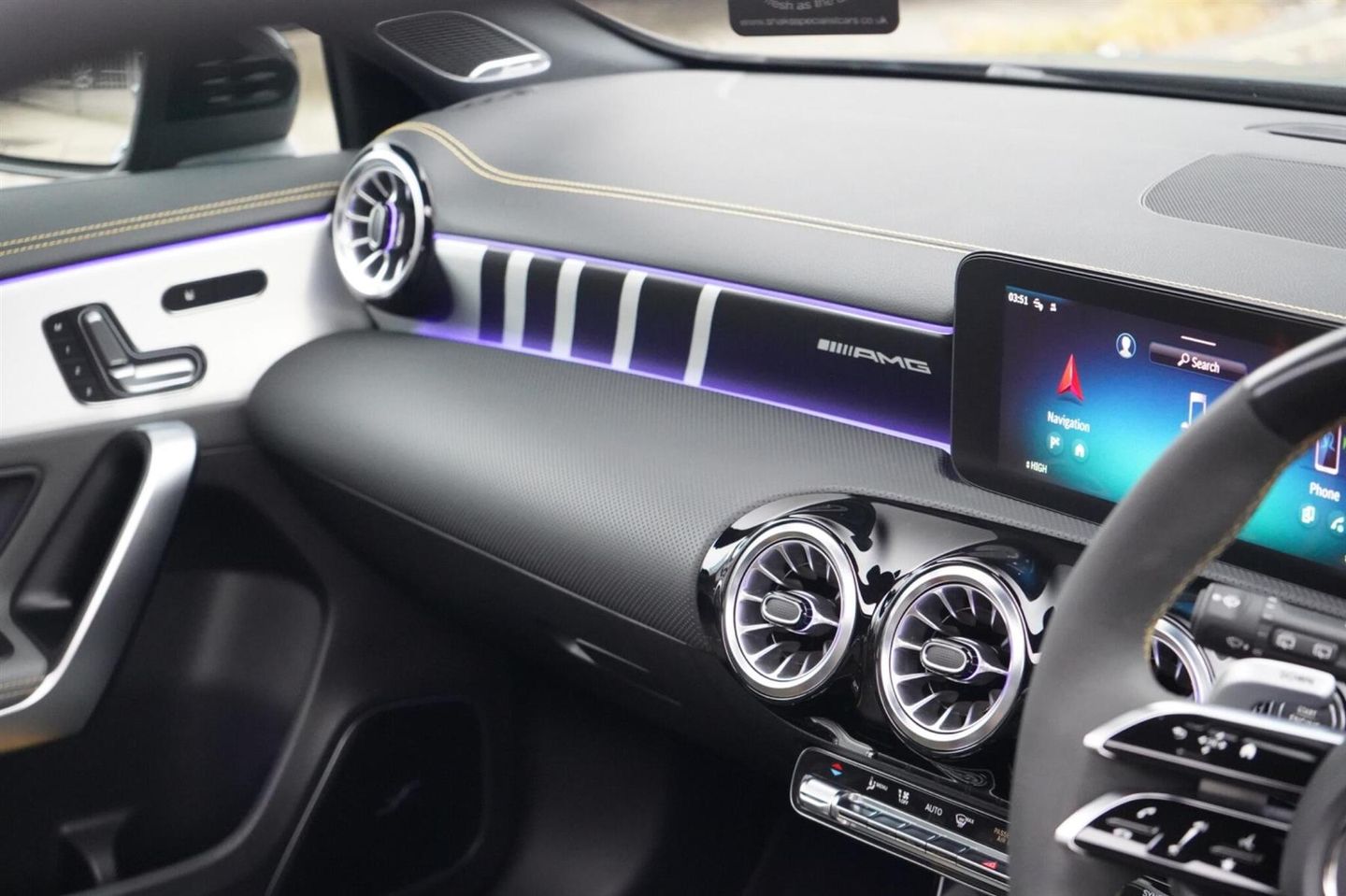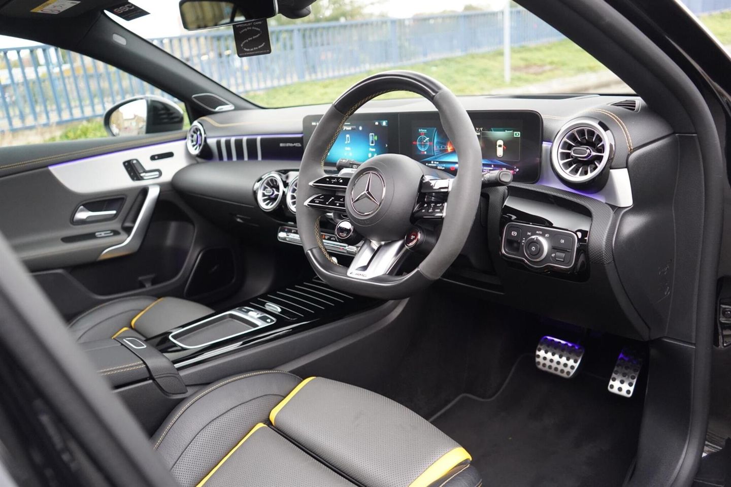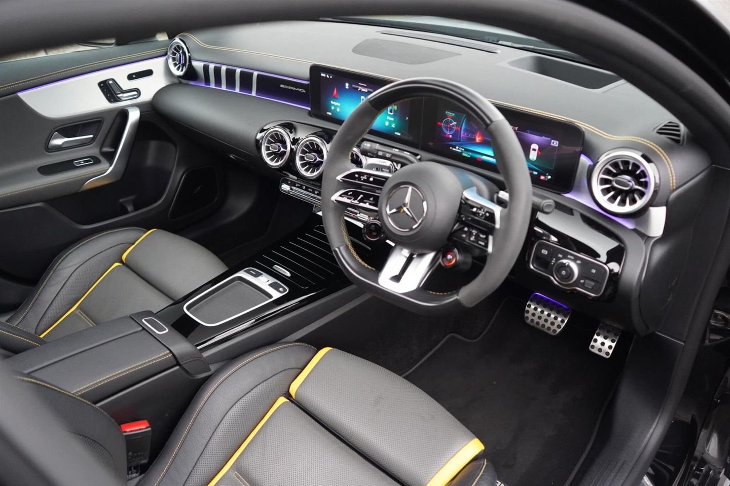 Stunning Facelift A45 AMG S PLUS Finished In Satin PPF. Cosmos Black Metallic With Black/Grey/Yellow AMG Leather Interior. Fantastic Spec Inc: Maxton Bodystyling, Facelift Multi Function AMG Performance Steering Wheel With AMG Buttons, Head-Up Display, AMG Aero Pack, 19'' AMG Cross Spoke Alloys In Matt Black, AMG Night Pack, Valvetronic AMG Exhaust, Panoramic Sunroof, Burmester Surround Sound, AMG Drivers Package, AMG Leather Package, AMG Track Pace, Widescreen Cockpit, COMAND Online, Quad AMG Exhaust Tips, Active Lane Keeping Assist, Blind Spot Assist, Exit Warning Assist, Red AMG Calipers, Cruise Control with Limiter, DAB, Thermotronic Luxury Climate, Dual Bluetooth Interfaces, Electric Heated AMG Performance Seats With Memory, Electric Folding Mirrors With Memory, Auto Dimming Mirrors, Keyless System, Illuminated Door Sill Trims, Multibeam LED Headlights, Adaptive Highbeam Assist Plus, Multi-Contour Seat Package, Light and Sight Package, Parking Pack, Privacy Glass, Speed Limit Assist, Traffic Sign Assist, Tyre Pressure Monitoring System, 64 Colour Ambient Lighting Programme. This A45 S Comes With Full Mercedes Service History and Remainder Of Manufacturers Warranty, This 2023 Mercedes-Benz A Class A45 AMG S Plus is a remarkable example of performance and luxury. Featuring a potent 2.0L Petrol Engine and a sophisticated Four Wheel Drive system, this Euro 6 compliant model offers exhilarating acceleration, reaching 0-62mph in a mere 3.9 seconds. The AMG S Plus trim level ensures a premium experience, enhanced by the immersive 590W Burmester Surround Sound System and the intelligent MULTIBEAM LED Headlamps with Adaptive Highbeam Assist. Convenience is paramount with KEYLESS-GO for effortless entry and THERMOTRONIC Automatic Climate Control for personalised comfort, while the Memory Package for the driver's seat ensures your preferred seating position is always ready.