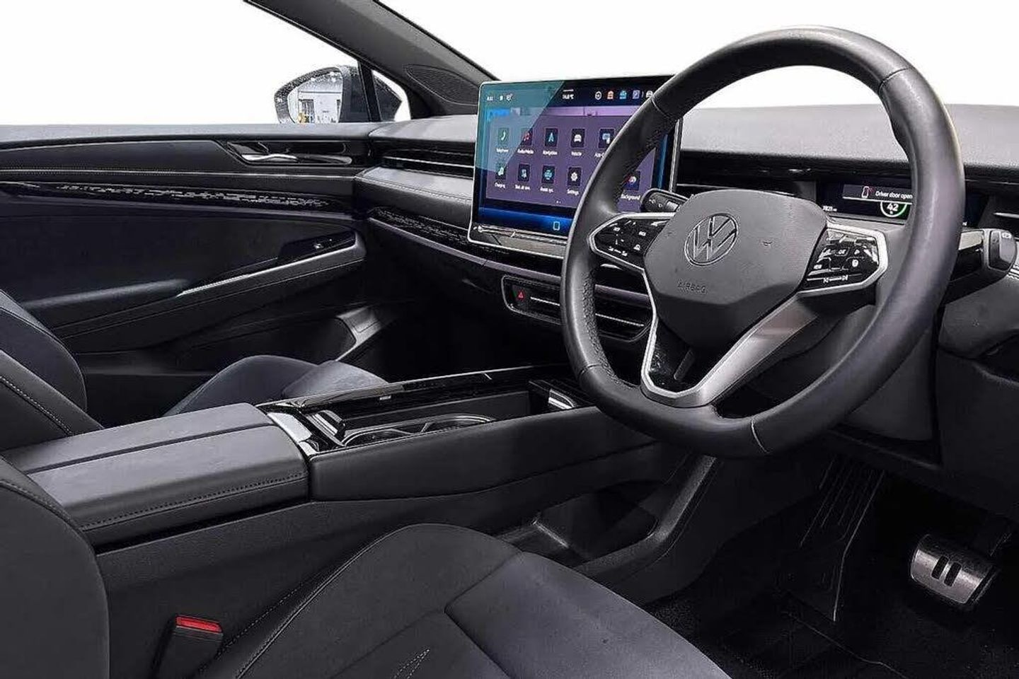 Exterior Pack Plus with Electronic Darkening Panoramic Sunroof- ID.7,Exterior styling package Black style - ID.7,Metallic - Aquamarine blue,Swivelling towbar,Art Velours eco microfleece cloth upholstery with seat bolsters in Artex - Soul black,Front and rear electric windows,Heated windscreen washer jets,Rain sensor,Rear wiper,Windscreen - Laminated,heated,infrared-reflecting and sound insulating,AC Charging socket,Body coloured bumpers,Charging flap with weather protection,Rear side wing doors,Roof aerial,Auto headlights,High beam assist with automatic sensing for switching between dipped and main beam,LED 3rd brake light,LED daytime running lights,LED indicator lights,Welcome lights,ABS,Autonomous emergency braking front assist with pedestrian and cyclist monitoring,Brake energy recuperation,Electric parking brake,ESP,Front disc brakes,Rear drum brakes,360 degree arial view parking camera,Adaptive cruise control,Advanced driver attention and drowsiness monitor,Dynamic road sign display,Engine start button,Lane change system,Side assist,Rear traffic alert and Exit warning system,Oncoming vehicle braking when turning including swerve support,Park assistance plus with front and rear parking sensors,Parking route memory,Semi-automatic vehicle control in an emergency,Auto dimming rear view mirror,Exterior mirrors convex on the left and aspherical on the right,Gloss black door mirrors with integrated indicators,Heated door mirrors,Remote electrically foldable door mirrors,puddle lights and reverse activated tilting door mirror,3 point seat belts in front with seat belt pretensioners,3x3 point rear seatbelts,Driver and front passenger airbag with front passenger airbag deactivation,Extended safety system with proactive passenger protection system,Front curtain and side airbags with center airbag,Rear door child safety locks,Tyre pressure warning,Warning signal and warning light for front and rear seat belts not fastened,Black carpet mats,3 zone air care climatronic with rear air conditioning control panel,Allergen filter and enhanced air filter,Electric auxiliary air heater,2 USB-C ports in the front,2 USB-C charging sockets on the center console in the rear,Art Velours eco microfleece cloth upholstery with seat bolsters in Artex,Centre console with illuminated storage compartment with sliding cover and two drinks holders,Door and side trim panel in foam film,insert in leatherette,First aid kit,warning triangle and safety vest,Front centre armrest,Leatherette-wrapped multifunction heated steering wheel with touch control,Luggage compartment floor,folding with stowage area,Luggage net and storage net on sides,Play and Pause brake and accelerator pedals,Variable boot floor,height adjustable and removable,30 colours options interior ambient lighting,Sun visors with illuminated vanity mirrors,Car2X intelligent vehicle networking,Preparation for Volkswagen connect,Voice activation for navigation and phone,Wireless App-Connect,Wireless Smartphone charger,8+1 Speakers,DAB+ radio,Augmented reality head up display,Digital instrument cluster,Emergency call service,Ready 2 discover pro navigation system with 15" infotainment display,Speedo and rev counter,electronic odometer,trip,service interval display and exterior temperature gauge,Traffic jam assist,Travel assist with lane assist and emergency assist,Standard electronic engine sound actuator,Comfort dashboard in soul black,12 way power seat adjustment for both front seats,with memory feature and seat depth adjustment,ErgoActive comfort seats in front,Front seats with massage programs,Heated front seats,Isofix child seat preparation,Power adjustable lumbar support in front,Rear centre headrest,Rear seat bench unsplit,backrest split folding with center armrest including 2 cup holders,Single front passenger seat,System optimised front head restraints,Anti theft alarm,Anti theft wheel,Comfort Seat - Art Velour Eco - Soul Black,Exterior Styling Black Style Pack,Towbar - Swivelling,Exterior Pack Plus with Electronic Darkening Panoramic Sunroof