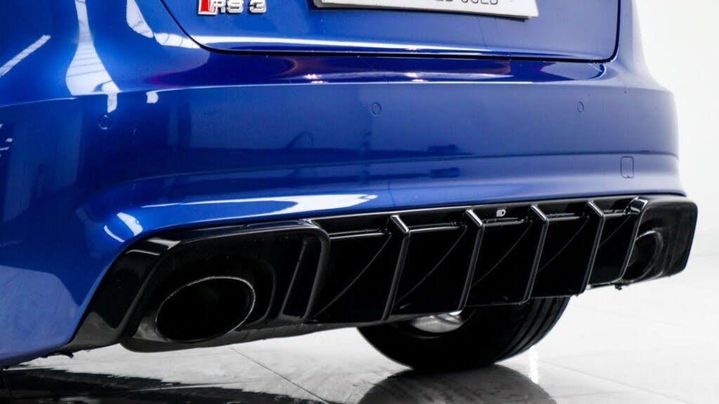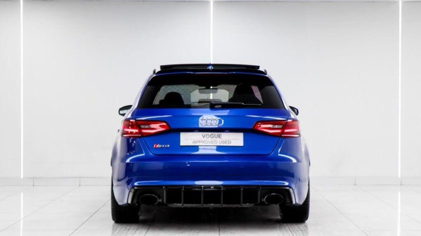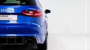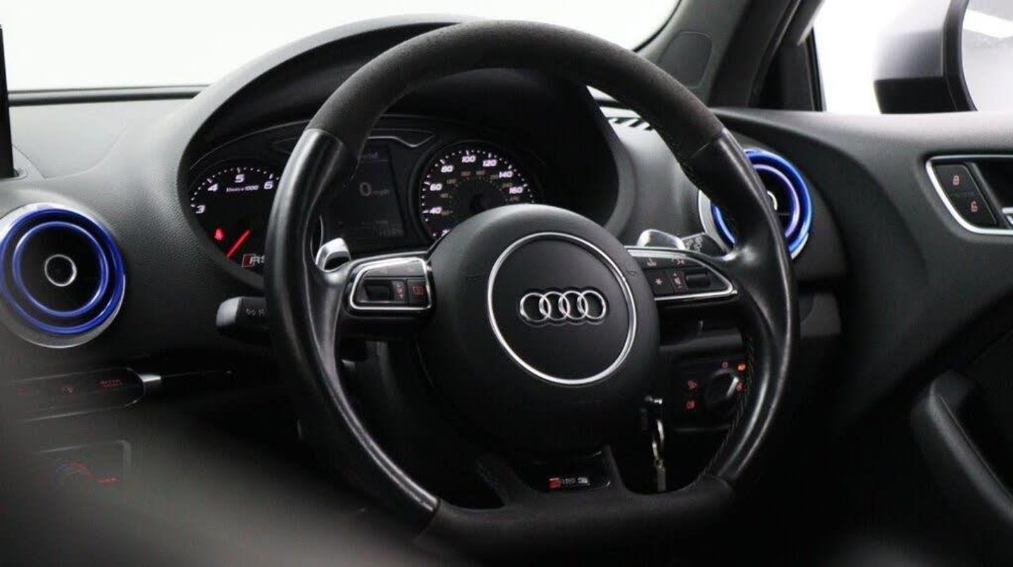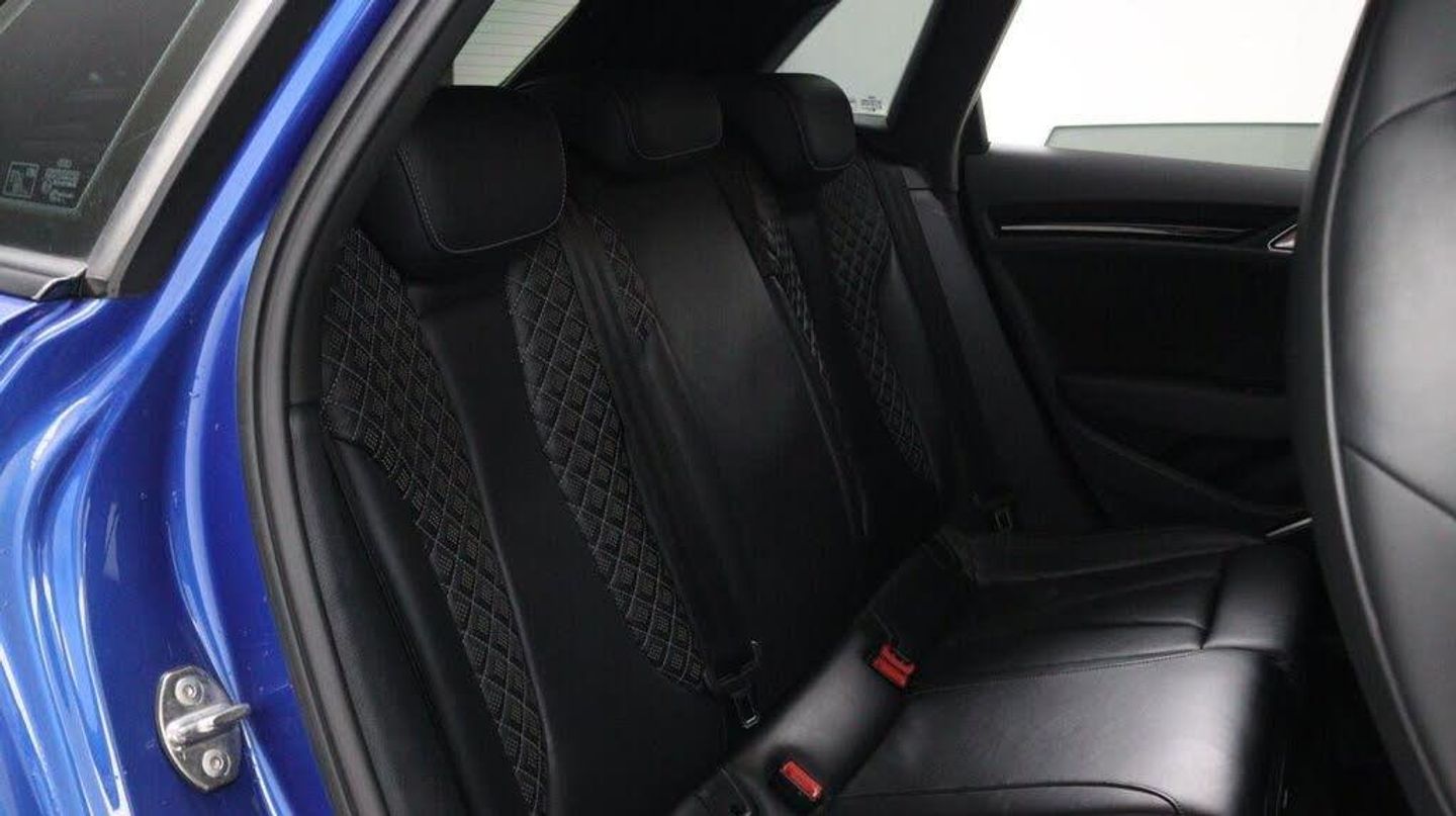 Sepang Blue, Fine Nappa Leather with Diamond Quilting - RS Super Sports Seats - Lunar Silver/Granite Grey Stitching RS3 Logo, Cruise Control, Bang and Olufsen Sound System, Audi Hill Hold Assist, RS3 Design Package, Electrically Adjustable 4-Way Lumbar Support, Privacy Glass, Styling Package - High-Gloss Black, Door Mirrors - High-Gloss Black Housing, Panoramic Glass Sunroof, Brake Calipers - Red with RS3 Logo, Black Roof Rails, 19in Alloy Wheels - 5-Arm Rotor Design - Matt Titanium - Diamond Cut Finish, 12V Power Socket - Rear, 12V Power Socket - Rear x2, 19in Alloy Wheels - 5-Arm Rotor Design - Galvanised Silver, ABS - Anti-Lock Braking System, AMI - Audi Music Interface, ASR - Anti Slip Regulation, Adaptive Brake Lights, Airbags - Driver, Airbags - Drivers Knee, Airbags - Front Passenger, Airbags - Front Side, Airbags - Head Level Side For Front and Rear, Alarm - Thatcham Category 1, All Weather LED Headlights, Aluminium Interior Elements, Aluminium Look Pedals, Aluminium-Effect Door Mirror Housings, Anti Theft Locking Wheel Bolts, Audi Drive Select, Audi Parking System Plus, Audi Parking System Rear with Acoustic Indicators, Automatic Wipers with Rain Sensor, Brake Calipers - High Gloss-Black with RS3 Logo, Cables x2 - MP3 Connection Including iPod, Car Jack, Cloth Headlining in Black, Colour Drivers Information System - DIS, Cup Holders - x2 in Centre Console, DAB Digital Radio, Display Screen Colour - 5.8in, Door Mirrors - Electrically Adjustable and Heated, Door Sill Trims - Aluminium with RS3 Logo, Dual-Zone Electronic Climate Control, EBD - Electronic Brakeforce Distribution, EDL - Electronic Differential Lock, ESP - Electronic Stability Programme, Electric Windows - Front and Rear, Electromechanical Parking Brake, Exhaust Tailpipe - RS, First Aid Kit, Front Bumper with Enlarged Air Inlets, Front Centre Armrest, Front Passenger Airbag Deactivation Switch, Front Sports Seats, Front and Rear Floor Mats, Full European Map Data, Grab Handles - Dampered, Head Restraints - Rear, Headlights - Coming-Leaving Home Function, Headlights - Light Sensor, Heat Insulating Glass, Heated Front Seats, Heated Rear Windscreen, ISOFIX Child Seat Mounting for Front Passenger and Rear Outer Seats, Immobiliser, Inlays - 3D Design Black, Interior Elements - Air Vents - Aluminium, Interior Elements - Frame Around the Inside Door Handle - Aluminium, Interior Elements - Glove Compartment - Aluminium, Interior Elements - Window Control Switches - Aluminium, LED Daytime Running Lights, LED Rear Lights, Luggage Compartment - Side Net, MMI Radio, MMI Touch, Manual Front Seat Adjustment, Mobile Telephone Preparation - Bluetooth Interface, Pollen Filter, Progressive Steering, RS Body Styling, RS Brake System - High Performance, RS Instrument Panel with Black Dials and Red Needles, RS Sports Suspension, Radiator Grille - Honeycomb Design, Rear Diffuser - RS3, Remote Central Locking with 2 Fold Away Keys, Roof Spoiler - RS3 Specific in Body Colour, Satellite Navigation System - SD Card Based, Seat Belt Reminder for All Seats, Seats - Adjustment for Cushion Depth, Seats - Extendable Thigh Support, Seats - Split Folding Rear - 60-40, Side Sills - RS, Smoking Package, Steering Wheel - 3-Spoke MultiFunction-Flat-Bottomed-Leather with Alcantara Inserts with RS Emblem, Steering Wheel - Gear Shift Paddles - Aluminium, Storage Compartment Under Rear Seat, Storage Net in Front Passenger Footwell and Front Seat Backrests, Storage and Luggage Package, Tool Kit, Tyre Pressure Monitoring System, Tyre Repair Kit, USB Connection, Voice Control - Navigation, Warning Triangle