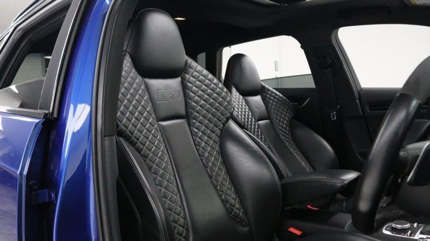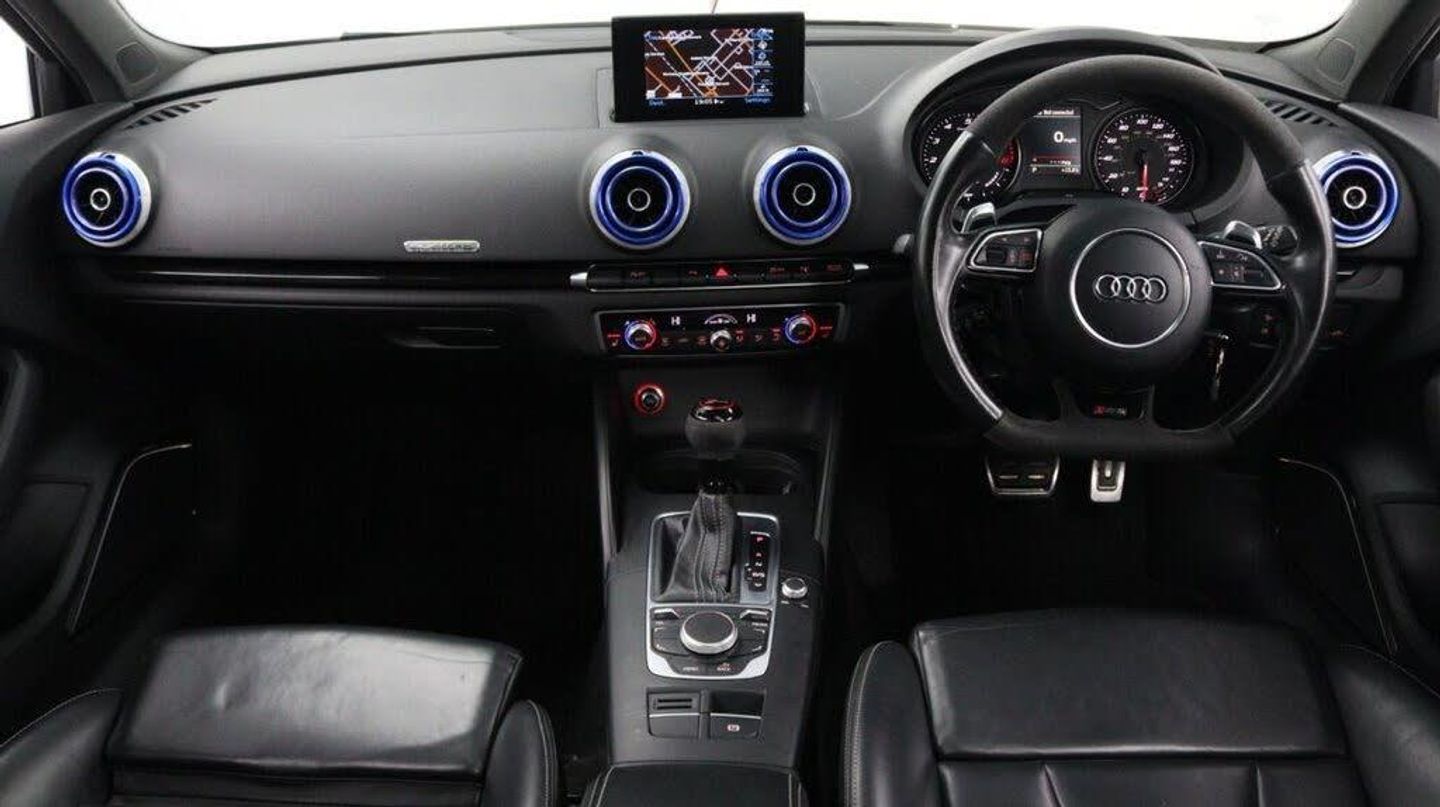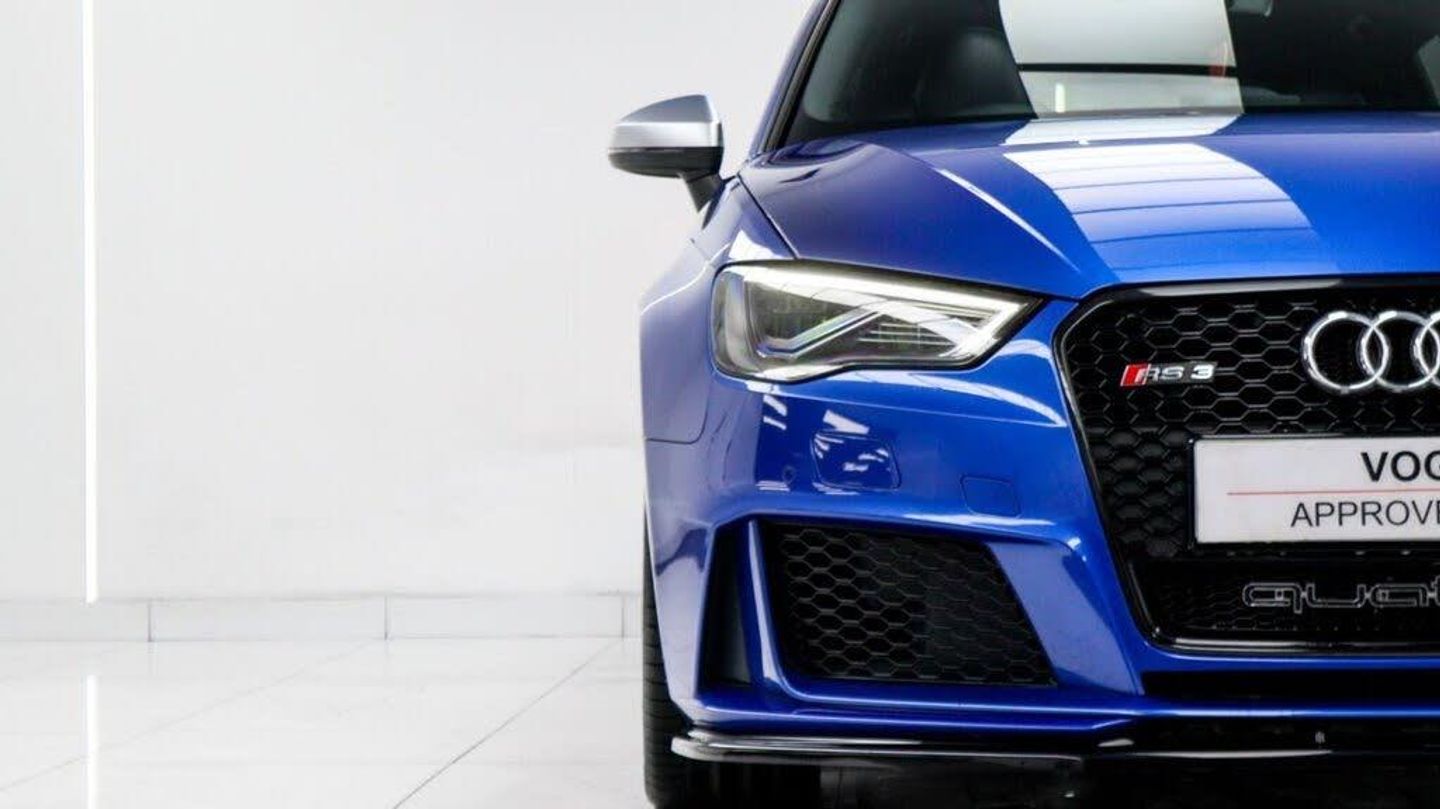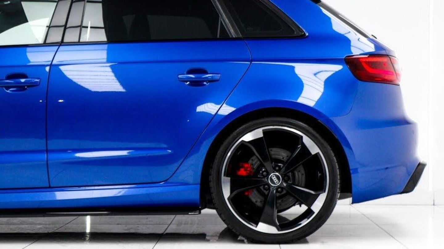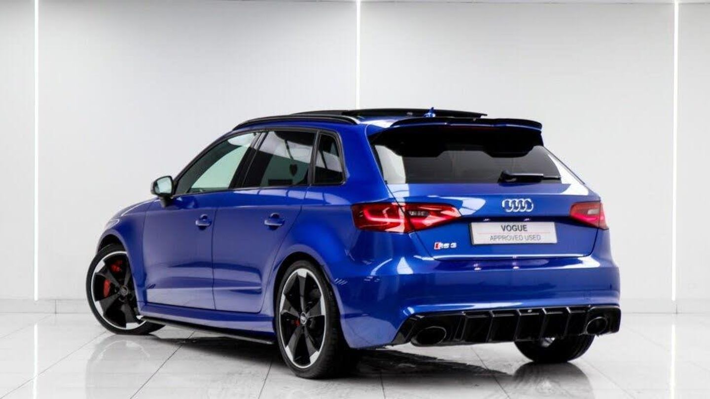 Sepang Blue, Fine Nappa Leather with Diamond Quilting - RS Super Sports Seats - Lunar Silver/Granite Grey Stitching RS3 Logo, Cruise Control, Bang and Olufsen Sound System, Audi Hill Hold Assist, RS3 Design Package, Electrically Adjustable 4-Way Lumbar Support, Privacy Glass, Styling Package - High-Gloss Black, Door Mirrors - High-Gloss Black Housing, Panoramic Glass Sunroof, Brake Calipers - Red with RS3 Logo, Black Roof Rails, 19in Alloy Wheels - 5-Arm Rotor Design - Matt Titanium - Diamond Cut Finish, 12V Power Socket - Rear, 12V Power Socket - Rear x2, 19in Alloy Wheels - 5-Arm Rotor Design - Galvanised Silver, ABS - Anti-Lock Braking System, AMI - Audi Music Interface, ASR - Anti Slip Regulation, Adaptive Brake Lights, Airbags - Driver, Airbags - Drivers Knee, Airbags - Front Passenger, Airbags - Front Side, Airbags - Head Level Side For Front and Rear, Alarm - Thatcham Category 1, All Weather LED Headlights, Aluminium Interior Elements, Aluminium Look Pedals, Aluminium-Effect Door Mirror Housings, Anti Theft Locking Wheel Bolts, Audi Drive Select, Audi Parking System Plus, Audi Parking System Rear with Acoustic Indicators, Automatic Wipers with Rain Sensor, Brake Calipers - High Gloss-Black with RS3 Logo, Cables x2 - MP3 Connection Including iPod, Car Jack, Cloth Headlining in Black, Colour Drivers Information System - DIS, Cup Holders - x2 in Centre Console, DAB Digital Radio, Display Screen Colour - 5.8in, Door Mirrors - Electrically Adjustable and Heated, Door Sill Trims - Aluminium with RS3 Logo, Dual-Zone Electronic Climate Control, EBD - Electronic Brakeforce Distribution, EDL - Electronic Differential Lock, ESP - Electronic Stability Programme, Electric Windows - Front and Rear, Electromechanical Parking Brake, Exhaust Tailpipe - RS, First Aid Kit, Front Bumper with Enlarged Air Inlets, Front Centre Armrest, Front Passenger Airbag Deactivation Switch, Front Sports Seats, Front and Rear Floor Mats, Full European Map Data, Grab Handles - Dampered, Head Restraints - Rear, Headlights - Coming-Leaving Home Function, Headlights - Light Sensor, Heat Insulating Glass, Heated Front Seats, Heated Rear Windscreen, ISOFIX Child Seat Mounting for Front Passenger and Rear Outer Seats, Immobiliser, Inlays - 3D Design Black, Interior Elements - Air Vents - Aluminium, Interior Elements - Frame Around the Inside Door Handle - Aluminium, Interior Elements - Glove Compartment - Aluminium, Interior Elements - Window Control Switches - Aluminium, LED Daytime Running Lights, LED Rear Lights, Luggage Compartment - Side Net, MMI Radio, MMI Touch, Manual Front Seat Adjustment, Mobile Telephone Preparation - Bluetooth Interface, Pollen Filter, Progressive Steering, RS Body Styling, RS Brake System - High Performance, RS Instrument Panel with Black Dials and Red Needles, RS Sports Suspension, Radiator Grille - Honeycomb Design, Rear Diffuser - RS3, Remote Central Locking with 2 Fold Away Keys, Roof Spoiler - RS3 Specific in Body Colour, Satellite Navigation System - SD Card Based, Seat Belt Reminder for All Seats, Seats - Adjustment for Cushion Depth, Seats - Extendable Thigh Support, Seats - Split Folding Rear - 60-40, Side Sills - RS, Smoking Package, Steering Wheel - 3-Spoke MultiFunction-Flat-Bottomed-Leather with Alcantara Inserts with RS Emblem, Steering Wheel - Gear Shift Paddles - Aluminium, Storage Compartment Under Rear Seat, Storage Net in Front Passenger Footwell and Front Seat Backrests, Storage and Luggage Package, Tool Kit, Tyre Pressure Monitoring System, Tyre Repair Kit, USB Connection, Voice Control - Navigation, Warning Triangle