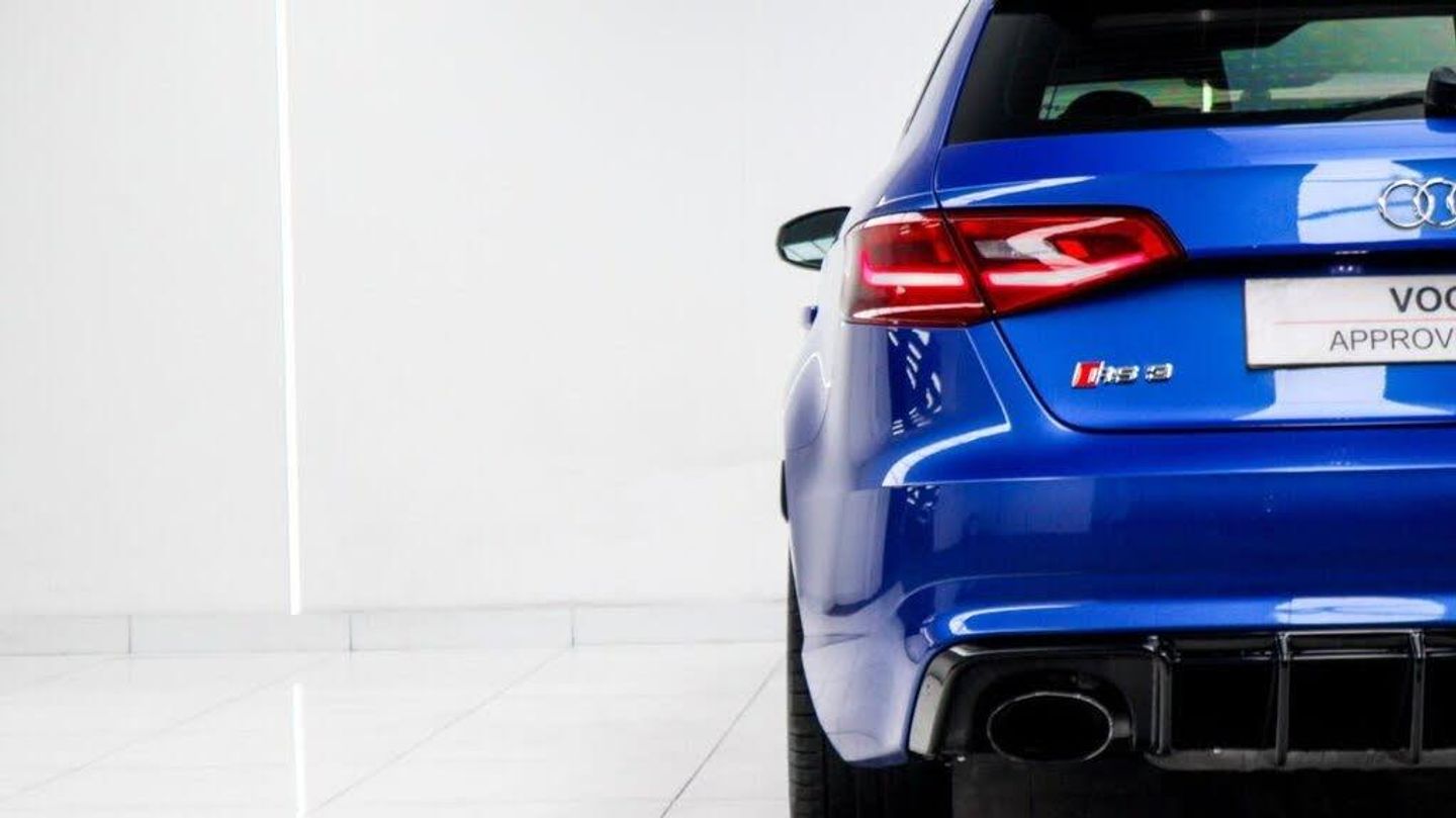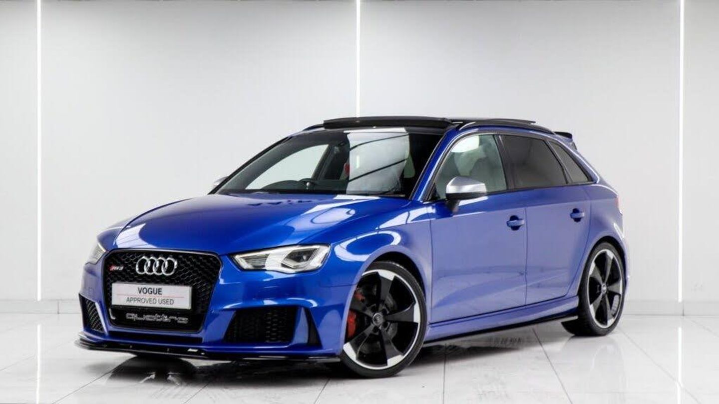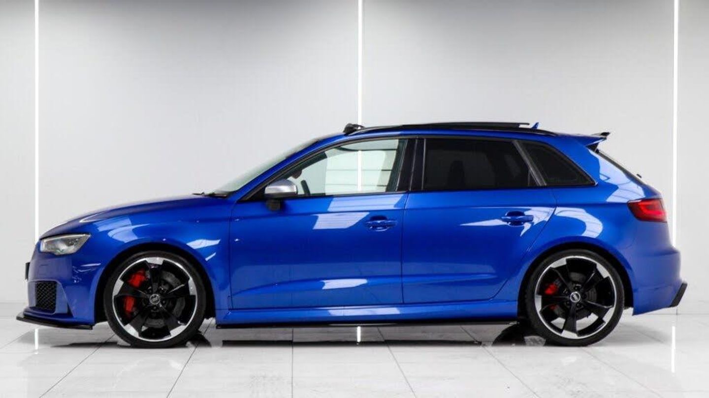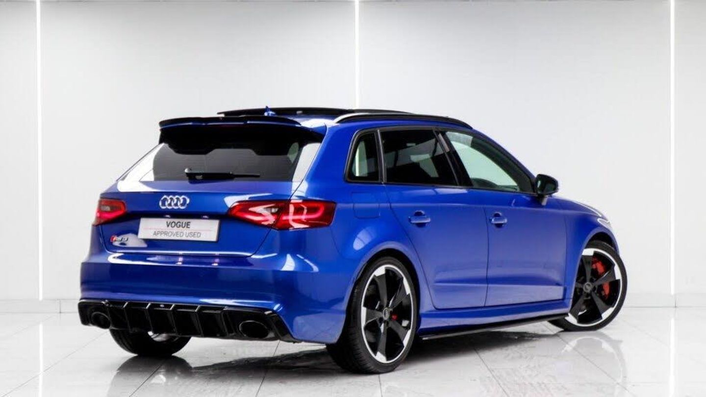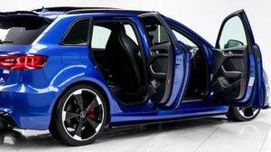 Sepang Blue, Fine Nappa Leather with Diamond Quilting - RS Super Sports Seats - Lunar Silver/Granite Grey Stitching RS3 Logo, Cruise Control, Bang and Olufsen Sound System, Audi Hill Hold Assist, RS3 Design Package, Electrically Adjustable 4-Way Lumbar Support, Privacy Glass, Styling Package - High-Gloss Black, Door Mirrors - High-Gloss Black Housing, Panoramic Glass Sunroof, Brake Calipers - Red with RS3 Logo, Black Roof Rails, 19in Alloy Wheels - 5-Arm Rotor Design - Matt Titanium - Diamond Cut Finish, 12V Power Socket - Rear, 12V Power Socket - Rear x2, 19in Alloy Wheels - 5-Arm Rotor Design - Galvanised Silver, ABS - Anti-Lock Braking System, AMI - Audi Music Interface, ASR - Anti Slip Regulation, Adaptive Brake Lights, Airbags - Driver, Airbags - Drivers Knee, Airbags - Front Passenger, Airbags - Front Side, Airbags - Head Level Side For Front and Rear, Alarm - Thatcham Category 1, All Weather LED Headlights, Aluminium Interior Elements, Aluminium Look Pedals, Aluminium-Effect Door Mirror Housings, Anti Theft Locking Wheel Bolts, Audi Drive Select, Audi Parking System Plus, Audi Parking System Rear with Acoustic Indicators, Automatic Wipers with Rain Sensor, Brake Calipers - High Gloss-Black with RS3 Logo, Cables x2 - MP3 Connection Including iPod, Car Jack, Cloth Headlining in Black, Colour Drivers Information System - DIS, Cup Holders - x2 in Centre Console, DAB Digital Radio, Display Screen Colour - 5.8in, Door Mirrors - Electrically Adjustable and Heated, Door Sill Trims - Aluminium with RS3 Logo, Dual-Zone Electronic Climate Control, EBD - Electronic Brakeforce Distribution, EDL - Electronic Differential Lock, ESP - Electronic Stability Programme, Electric Windows - Front and Rear, Electromechanical Parking Brake, Exhaust Tailpipe - RS, First Aid Kit, Front Bumper with Enlarged Air Inlets, Front Centre Armrest, Front Passenger Airbag Deactivation Switch, Front Sports Seats, Front and Rear Floor Mats, Full European Map Data, Grab Handles - Dampered, Head Restraints - Rear, Headlights - Coming-Leaving Home Function, Headlights - Light Sensor, Heat Insulating Glass, Heated Front Seats, Heated Rear Windscreen, ISOFIX Child Seat Mounting for Front Passenger and Rear Outer Seats, Immobiliser, Inlays - 3D Design Black, Interior Elements - Air Vents - Aluminium, Interior Elements - Frame Around the Inside Door Handle - Aluminium, Interior Elements - Glove Compartment - Aluminium, Interior Elements - Window Control Switches - Aluminium, LED Daytime Running Lights, LED Rear Lights, Luggage Compartment - Side Net, MMI Radio, MMI Touch, Manual Front Seat Adjustment, Mobile Telephone Preparation - Bluetooth Interface, Pollen Filter, Progressive Steering, RS Body Styling, RS Brake System - High Performance, RS Instrument Panel with Black Dials and Red Needles, RS Sports Suspension, Radiator Grille - Honeycomb Design, Rear Diffuser - RS3, Remote Central Locking with 2 Fold Away Keys, Roof Spoiler - RS3 Specific in Body Colour, Satellite Navigation System - SD Card Based, Seat Belt Reminder for All Seats, Seats - Adjustment for Cushion Depth, Seats - Extendable Thigh Support, Seats - Split Folding Rear - 60-40, Side Sills - RS, Smoking Package, Steering Wheel - 3-Spoke MultiFunction-Flat-Bottomed-Leather with Alcantara Inserts with RS Emblem, Steering Wheel - Gear Shift Paddles - Aluminium, Storage Compartment Under Rear Seat, Storage Net in Front Passenger Footwell and Front Seat Backrests, Storage and Luggage Package, Tool Kit, Tyre Pressure Monitoring System, Tyre Repair Kit, USB Connection, Voice Control - Navigation, Warning Triangle