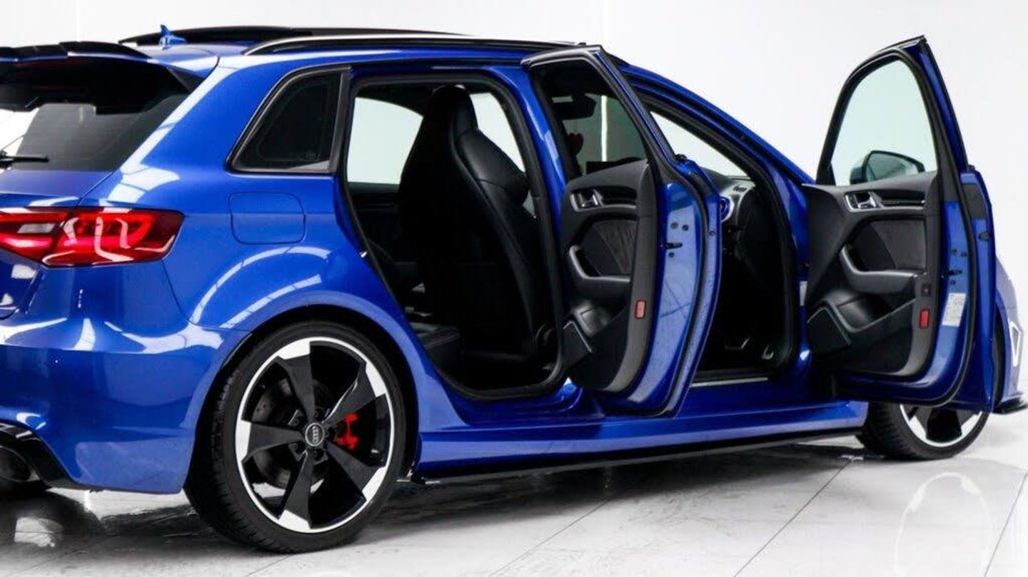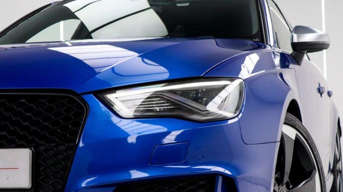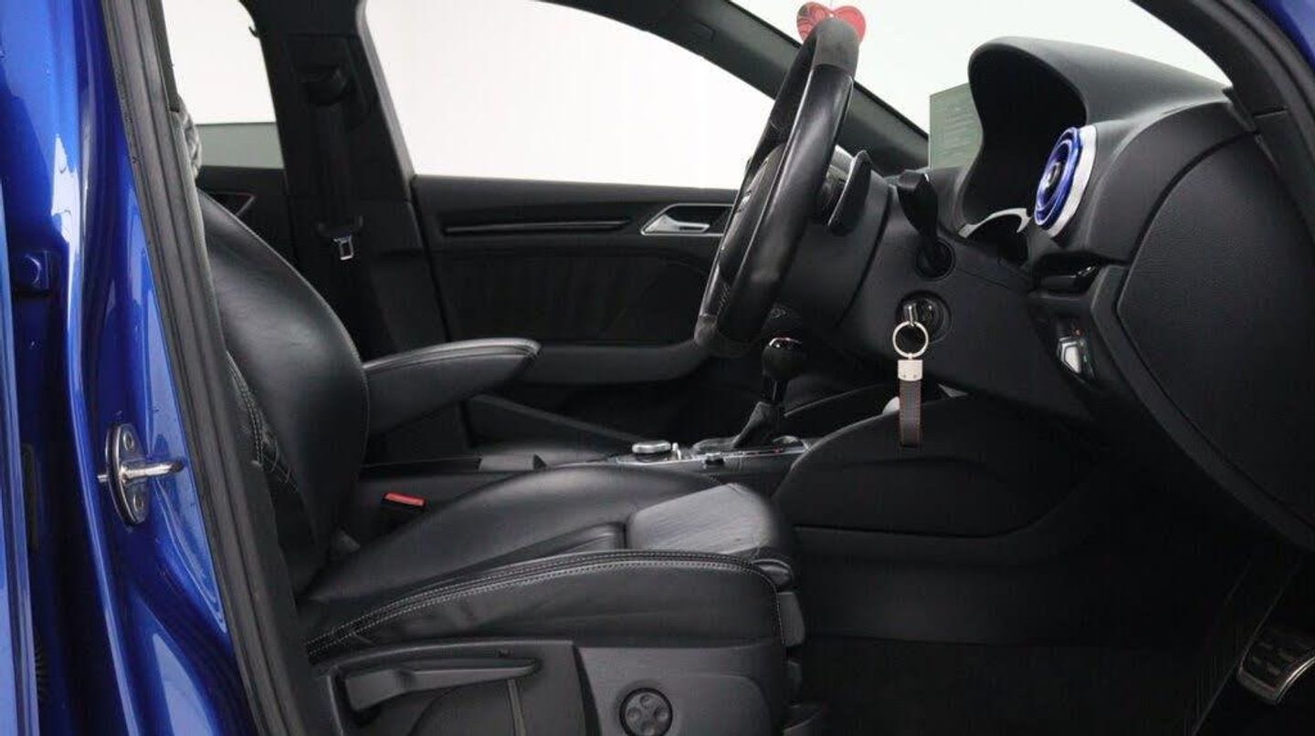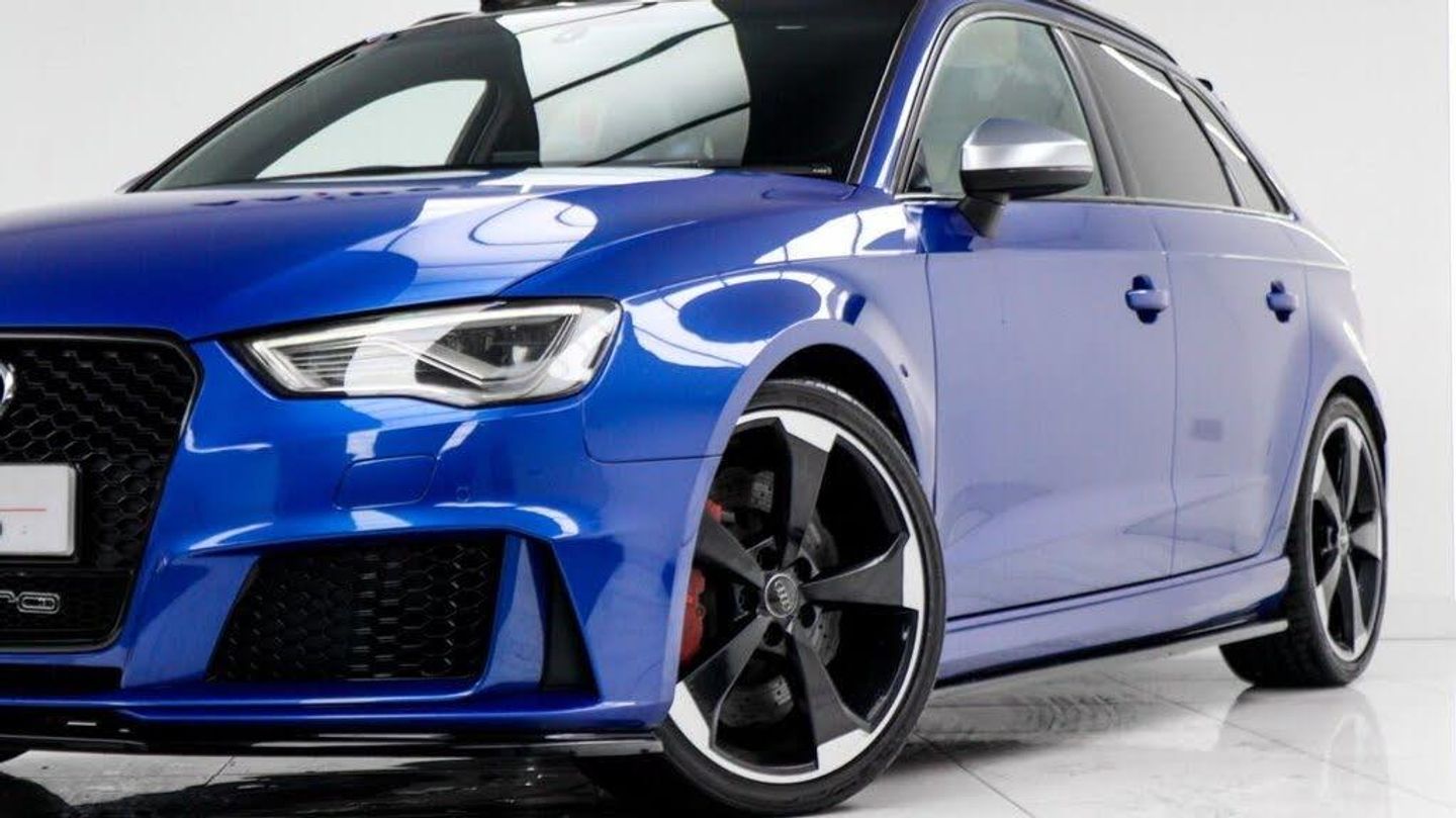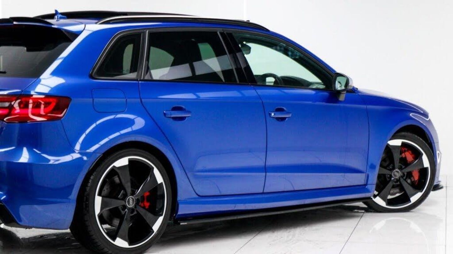 Sepang Blue, Fine Nappa Leather with Diamond Quilting - RS Super Sports Seats - Lunar Silver/Granite Grey Stitching RS3 Logo, Cruise Control, Bang and Olufsen Sound System, Audi Hill Hold Assist, RS3 Design Package, Electrically Adjustable 4-Way Lumbar Support, Privacy Glass, Styling Package - High-Gloss Black, Door Mirrors - High-Gloss Black Housing, Panoramic Glass Sunroof, Brake Calipers - Red with RS3 Logo, Black Roof Rails, 19in Alloy Wheels - 5-Arm Rotor Design - Matt Titanium - Diamond Cut Finish, 12V Power Socket - Rear, 12V Power Socket - Rear x2, 19in Alloy Wheels - 5-Arm Rotor Design - Galvanised Silver, ABS - Anti-Lock Braking System, AMI - Audi Music Interface, ASR - Anti Slip Regulation, Adaptive Brake Lights, Airbags - Driver, Airbags - Drivers Knee, Airbags - Front Passenger, Airbags - Front Side, Airbags - Head Level Side For Front and Rear, Alarm - Thatcham Category 1, All Weather LED Headlights, Aluminium Interior Elements, Aluminium Look Pedals, Aluminium-Effect Door Mirror Housings, Anti Theft Locking Wheel Bolts, Audi Drive Select, Audi Parking System Plus, Audi Parking System Rear with Acoustic Indicators, Automatic Wipers with Rain Sensor, Brake Calipers - High Gloss-Black with RS3 Logo, Cables x2 - MP3 Connection Including iPod, Car Jack, Cloth Headlining in Black, Colour Drivers Information System - DIS, Cup Holders - x2 in Centre Console, DAB Digital Radio, Display Screen Colour - 5.8in, Door Mirrors - Electrically Adjustable and Heated, Door Sill Trims - Aluminium with RS3 Logo, Dual-Zone Electronic Climate Control, EBD - Electronic Brakeforce Distribution, EDL - Electronic Differential Lock, ESP - Electronic Stability Programme, Electric Windows - Front and Rear, Electromechanical Parking Brake, Exhaust Tailpipe - RS, First Aid Kit, Front Bumper with Enlarged Air Inlets, Front Centre Armrest, Front Passenger Airbag Deactivation Switch, Front Sports Seats, Front and Rear Floor Mats, Full European Map Data, Grab Handles - Dampered, Head Restraints - Rear, Headlights - Coming-Leaving Home Function, Headlights - Light Sensor, Heat Insulating Glass, Heated Front Seats, Heated Rear Windscreen, ISOFIX Child Seat Mounting for Front Passenger and Rear Outer Seats, Immobiliser, Inlays - 3D Design Black, Interior Elements - Air Vents - Aluminium, Interior Elements - Frame Around the Inside Door Handle - Aluminium, Interior Elements - Glove Compartment - Aluminium, Interior Elements - Window Control Switches - Aluminium, LED Daytime Running Lights, LED Rear Lights, Luggage Compartment - Side Net, MMI Radio, MMI Touch, Manual Front Seat Adjustment, Mobile Telephone Preparation - Bluetooth Interface, Pollen Filter, Progressive Steering, RS Body Styling, RS Brake System - High Performance, RS Instrument Panel with Black Dials and Red Needles, RS Sports Suspension, Radiator Grille - Honeycomb Design, Rear Diffuser - RS3, Remote Central Locking with 2 Fold Away Keys, Roof Spoiler - RS3 Specific in Body Colour, Satellite Navigation System - SD Card Based, Seat Belt Reminder for All Seats, Seats - Adjustment for Cushion Depth, Seats - Extendable Thigh Support, Seats - Split Folding Rear - 60-40, Side Sills - RS, Smoking Package, Steering Wheel - 3-Spoke MultiFunction-Flat-Bottomed-Leather with Alcantara Inserts with RS Emblem, Steering Wheel - Gear Shift Paddles - Aluminium, Storage Compartment Under Rear Seat, Storage Net in Front Passenger Footwell and Front Seat Backrests, Storage and Luggage Package, Tool Kit, Tyre Pressure Monitoring System, Tyre Repair Kit, USB Connection, Voice Control - Navigation, Warning Triangle