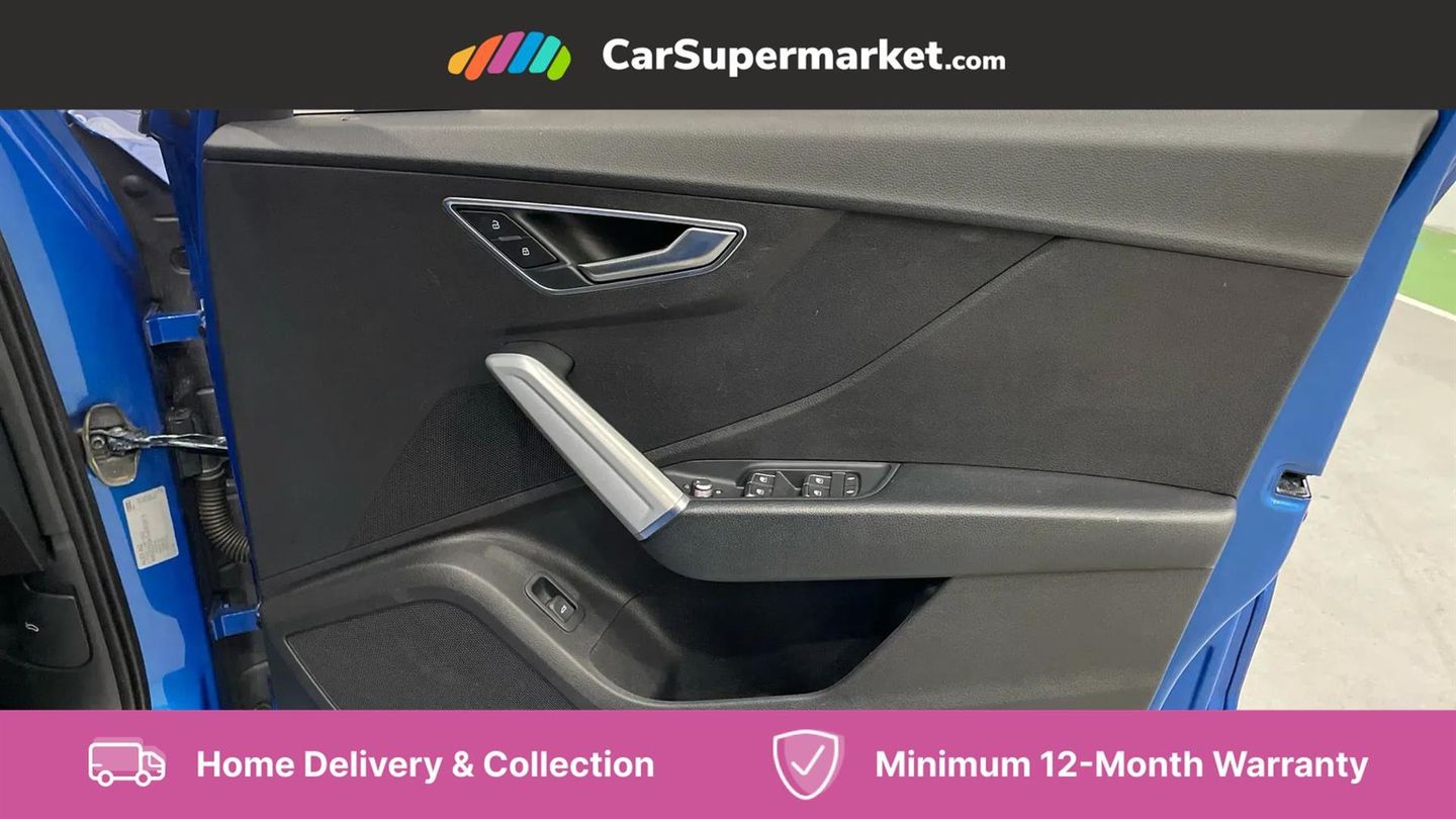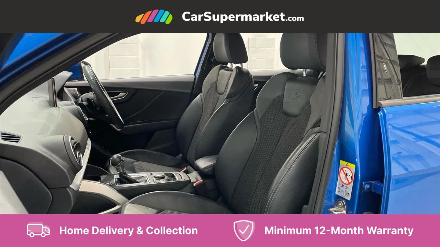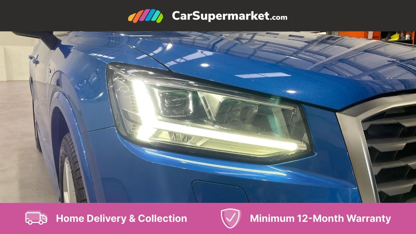 Audi drive select,Audi smartphone interface,Automatic start/stop system with recuperation,Bluetooth interface includes bluetooth audio streaming,Cruise control,MMI - Multi Media Interface control system,MMI SD card integrated nav with 3D map display, dynamic route guidance with TMC, MMI search, natural voice recognition and myAudi special destinations,Power operated tailgate,Progressive steering,Service interval indicator,Dynamic suspension,2 x SDXC card reader,Audi music interface - apple iPod, apple iPhone, USB storage media, compatible MP3 players, 2 x USB charging points and 1 x Aux-in,CD Drive,DAB digital radio and AM/FM radio,MMI radio plus with 7" colour MMI screen and MMI controller,Black window trims,Bumper in full body colour paint finish,Chrome exhaust tailpipe,Electrically adjustable and heated door mirrors with integrated LED side indicators,Front and rear electric windows,Front underbody guard and rear diffuser trim in selenite silver,Front windscreen with grey tinted sunband,Headlight washers,Interior mirror,LED headlights with LED rear lights + dynamic rear indicators,LED indicator lights,Manual folding door mirrors,Rain and light sensors,Rear wiper,S Line badges on the front wings,S Line body styling - front and rear bumpers, side skirts, radiator grille, rear diffuser insert and front air intakes,60/40 split folding rear seat bench,Black cloth headlining,Front centre armrest,Front headrests,Front sport seats with S embossed logo,Height/reach adjust steering wheel,Illuminated door sill trims with S logo,ISOFIX child seat mounting for front passenger with airbag deactivation and outer rear seat including top tether attachment point for outer rear seats,Manual seat adjustment including seat height adjustment for front seats,Stainless steel pedals,Storage compartments - Glovebox, cupholder compartment in centre console, storage compartment in rear centre console, front and rear door pockets,Three rear headrests,Non smoking pack - Q2,3x3 point rear seatbelts,6 airbags - Front, curtain and front side airbags,Electromechanical parking brake,Electronic stabilisation control including ABS, ASR and EDL,Extended and proactive pedestrian protection,Hill hold assist,Multi collision brake assist,Pre-sense front with pedestrian recognition,Seatbelt monitoring,Tyre pressure warning light,Warning triangle and first aid kit,Anti theft alarm,Anti theft wheel bolts,Central locking system with remote control key,Electronically operated child locks,Aluminium interior element
