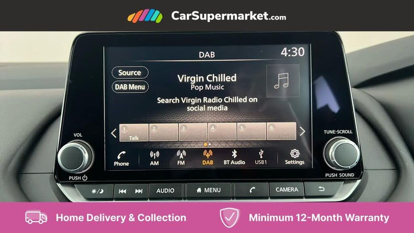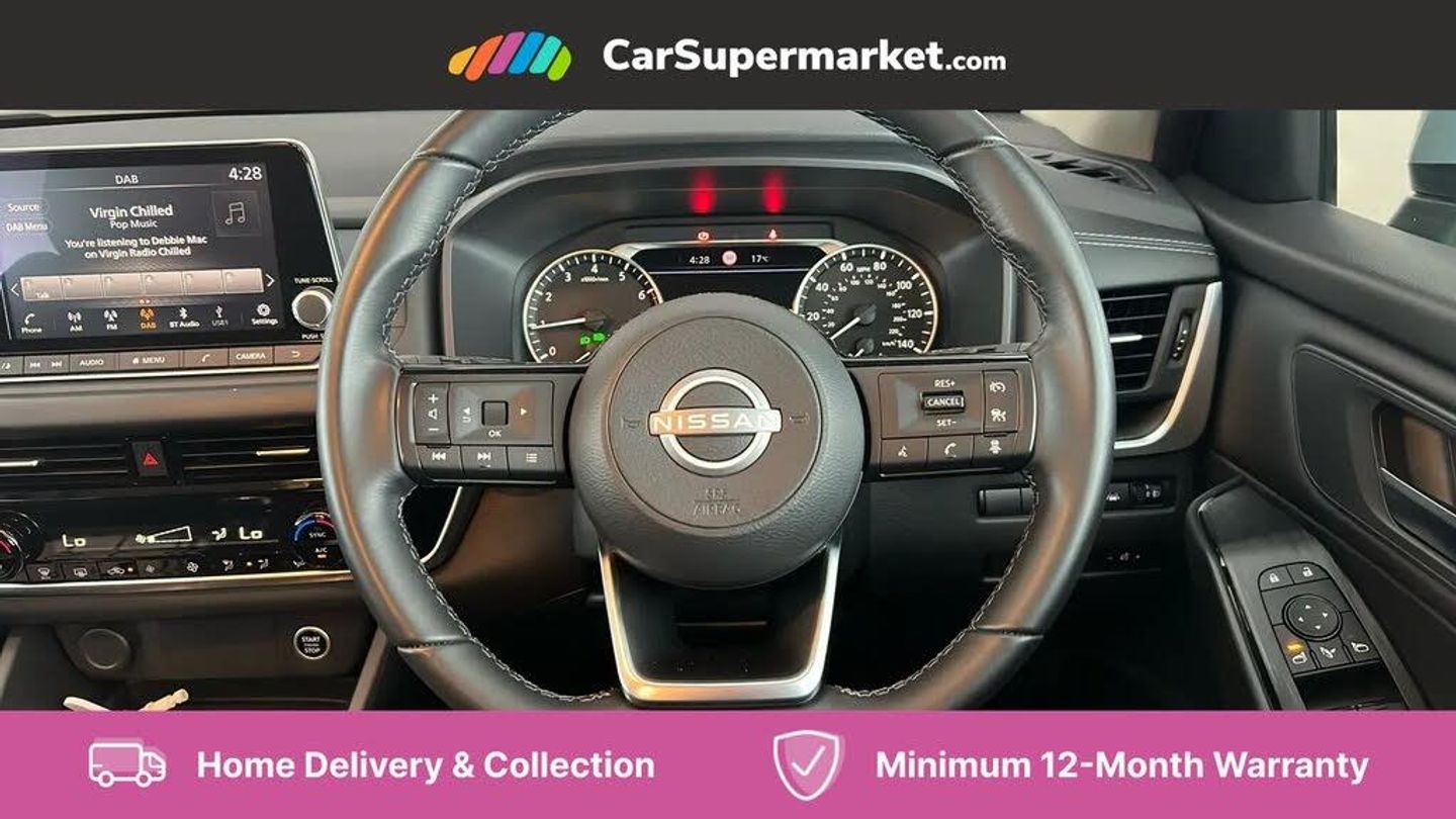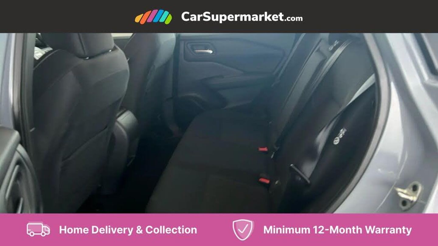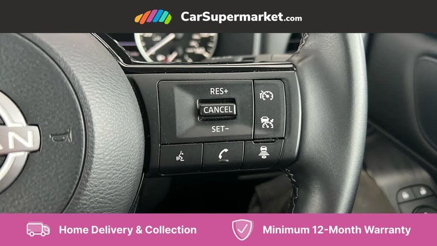 7" High definition full colour TFT screen combimeter,Android auto/Apple CarPlay (Wired),Blind spot warning,Drive modes (sport, normal, eco),Electric speed sensitive power steering,Emergency and breakdown call,Idle stop/start system,Intelligent Cruise control (ICC),Intelligent driver alert system,Intelligent forward collision warning,Intelligent lane intervention,Lane departure prevention,Lane departure warning system,Maximum speed limiter,Nissan connect 8" touchscreen infotainment system,Push button starter,Rear cross traffic alert,Rear parking sensors,Rear view camera,Traffic sign recognition with legal speed adjustment,Trip computer,6 speakers,AM/FM audio system with DAB,Bluetooth audio streaming,Front USB connections (Type-A and Type-C),Auto dimming rear view mirror,Auto rear wiper when reversing,Automatic hazard signal with emergency stop signal,Body colour mirror caps,Body coloured door handles,Bodyside mouldings,Chrome side window finisher,Door handle with button,Electric auto folding door mirrors,Electrically adjustable and heated door mirrors with LED turn indicator,Follow me home headlights,High beam assist,Intelligent auto headlights,LED daytime running lights,LED Headlights,LED rear lights,One touch front and rear electric windows with remote opening and closing,Partially body coloured bumpers,Rear reversing light (bulb lighting),Rear roof spoiler,Rear side wing doors,Shark fin antenna,Splash free rain sensing wipers,Three blink turn signal,12v power socket in dashboard and luggage,2x Rear coat hooks,3 bench rear seats in 2nd row,3 rear headrests,4 folding assist grip,6-way manually adjustable driver's seat,60/40 split folding rear seat bench,Centre console storage tray,Chrome interior door handles,Cloth monoform upholstery,Driver and front passenger sunvisors with illuminated vanity mirrors,Driver seat back pocket,Dual zone automatic climate control with pollen filter,Electrically adjustable lumbar support for driver,Front and rear door storage,Front centre console and armrest,Front cupholders x 2,Front door with bottle holders,Glovebox with light,Hard trunk cover,Height adjustable driver's seat,Height adjustable front headrests,Height adjustable passenger seat,Leather shift knob,Leather steering wheel,Luggage space lighting,Manually adjustable passenger (slide recline + lifter),Multifunction steering wheel,Passenger seat back pocket,Rear armrest with 2 cupholders,Rear door bottle holders,Single front passenger seat,Steering wheel switches,Sunglasses holder,Tilt/telescopic adjustable steering wheel,Two rear isofix child seat anchorage points with top tether,3x3 point rear seatbelt pretensioners + load limiters,ABS with EBD and brake assist,Active brake limited slip,Auto hold function,Child locks on rear doors,Curtain and front side, far side airbags,Driver and passenger airbags,Driver, passenger and 2nd row rear seat belt reminder,Electronic parking brake,Front seatbelt pretensioners + load limiters,Height adjustable front seatbelts,Hill start assist,Intelligent blind spot intervention,Intelligent front emergency braking with pedestrian, cyclist recognition and junction assist,Intelligent rear automatic braking,Tyre pressure monitoring system,Vehicle dynamic control,Capless fuel filler,Engine immobiliser,Intelligent Key,Remote central door locking with deadlocking,Thatcham Cat.1 alarm,Interior instrumental panel A finisher,17" Alloy wheels,Tyre puncture repair kit