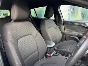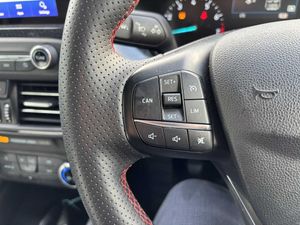 4.2" TFT coloured cluster, Bluetooth system, Digital clock, E-call, Easy fuel capless refuelling system, Eco mode, Ford SYNC 3 navigation with 8" TFT touchscreen, DAB radio and app link Android auto/Apple carplay, Intelligent speed assist, Lane keeping system - lane keeping alert and lane keeping aid, PAS, Selectable drive mode, Trip computer, Sports tuned suspension, 2 USB ports, Aux input, Auto dimming rear view mirror, Auto headlamps (on/off), Automatic rain sensing wipers, Body colour large rear spoiler, Body coloured bumpers, Body coloured door handles, Body coloured electrically operated and heated door mirrors with side indicators, Electrically operated front and rear windows with one touch opening and closing, Front variable intermittent wipers with electric wash, Heated rear window, LED daytime running lamp, LED front fog lamps with cornering function, LED reflector headlamps, Polished twin tailpipe, Power folding door mirrors, Quickclear heated windscreen, Rear privacy glass, Rear side wing doors, Roof rails, ST-Line upper and lower grille with full body styling kit and wing badges, Tailgate wash/wipe, Third brake light, 2nd Load floor, 3 seat bench in 2nd row, 3 spoke flat bottomed Sensico steering wheel with red stitching, Aluminium gear knob, Auto fold rear seats, Cloth upholstery, Dark headliner, Driver's lumbar support, Front floor mats, Height adjustable front headrests, Isofix child seat preparation, Manual air conditioning, Reach + rake adjustable steering column, Rear centre headrest, Single front passenger seat, 3x3 point rear seatbelts, ABS+Electronic Brake force Distribution, Auto hold function, Driver airbag, Electronic parking brake, Electronic stability control, Front and rear seatbelt reminder, Front inertia reel height adjustable seatbelts with pre-tensioners, Front passenger airbag, Front side airbags, Hill start assist, Manual rear child locks, Passenger airbag deactivate switch, Post collision braking, Pre collision assist with autonomous emergency braking and pedestrian/cyclist detection, Side curtain airbags, Three rear inertia reel lap/diagonal seatbelts, Tyre pressure monitoring system, Ford keyfree system with Keyless entry and keyless start/sleep mode key fob, MyKey system, Remote central locking & engine immobiliser, Thatcham category 1 alarm, 17" 5x2 spoke alloy wheels with rock metallic finish, Mini steel spare wheel
