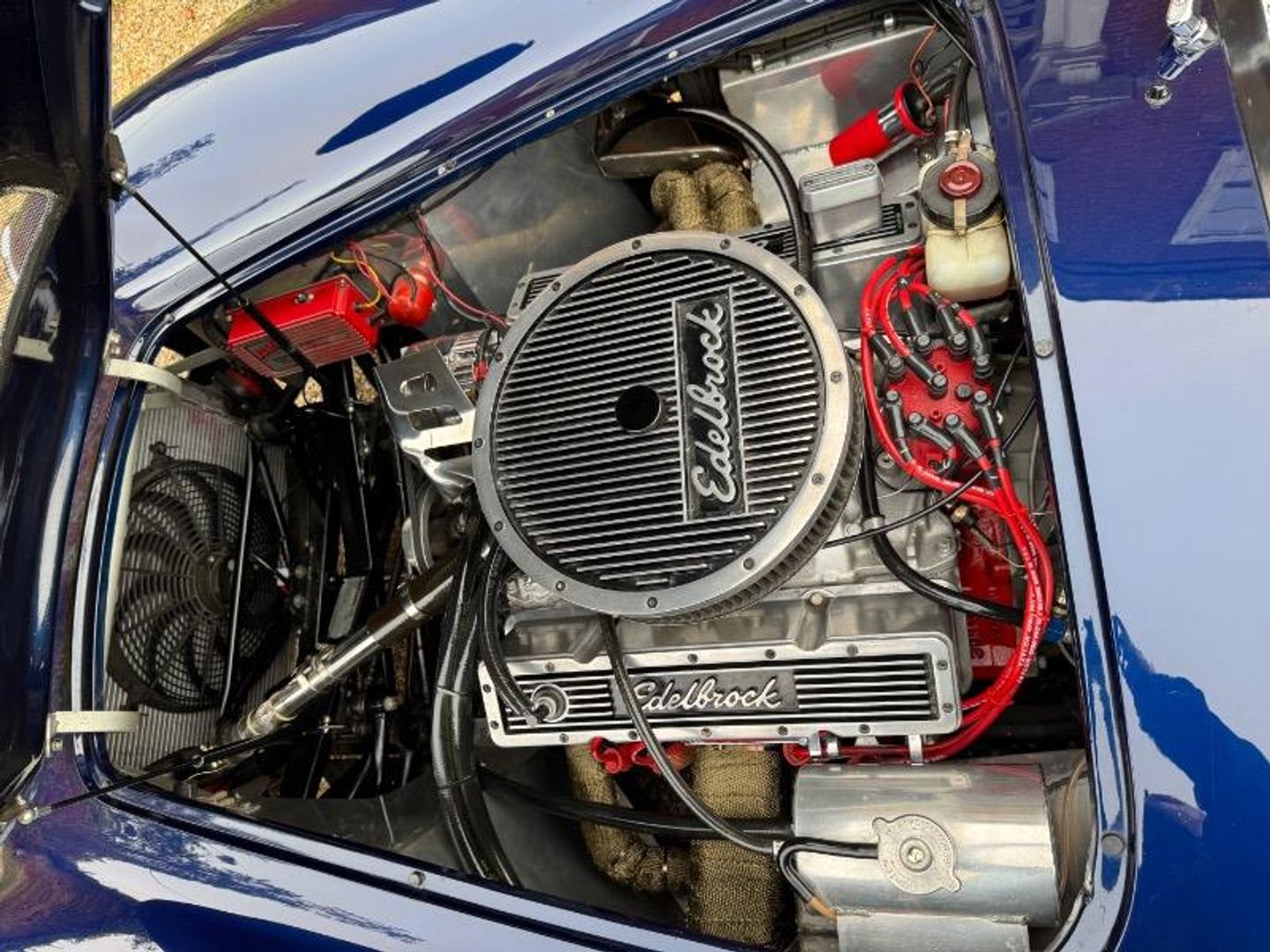 Spec includes Edelbrock Air filter, Edelbrock performance Carburettor , Edelbrock performer inlet manifold, Aluminium Edelbrock Performance heads , Tubular stainless steel exhaust headers, MSD Ignition system and distributor , Edelbrock rocker covers, Chrome alternator and bracket, Aluminium pulleys, Aluminium header tank, Aluminium radiator
