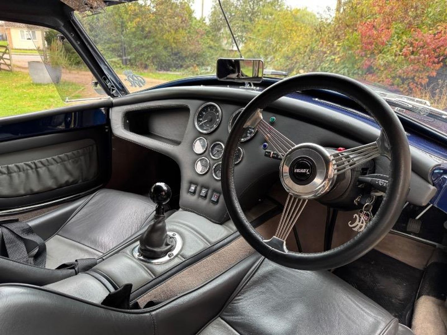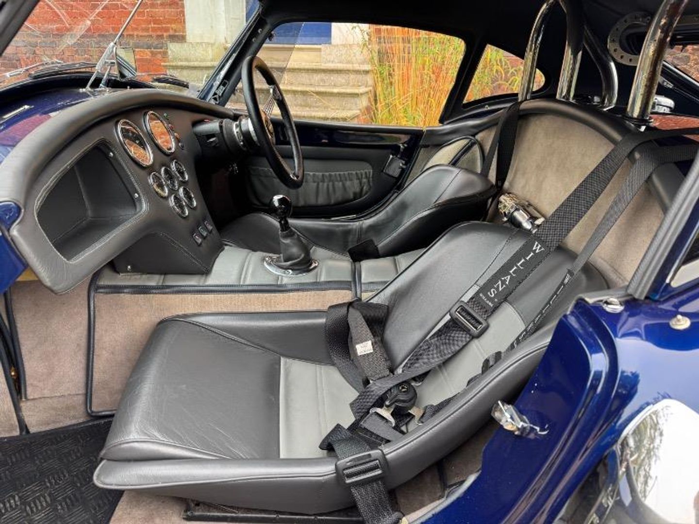 Two tone anthracite and grey leather interior including leather Transmition tunnel top , Contrasting grey luxury carpet set, Smiths classic instruments, Black Willans harness seat belts, Quick release removable Grant classic steering wheel, 8 Ball gear knob, Chrome fire extinguisher etc.