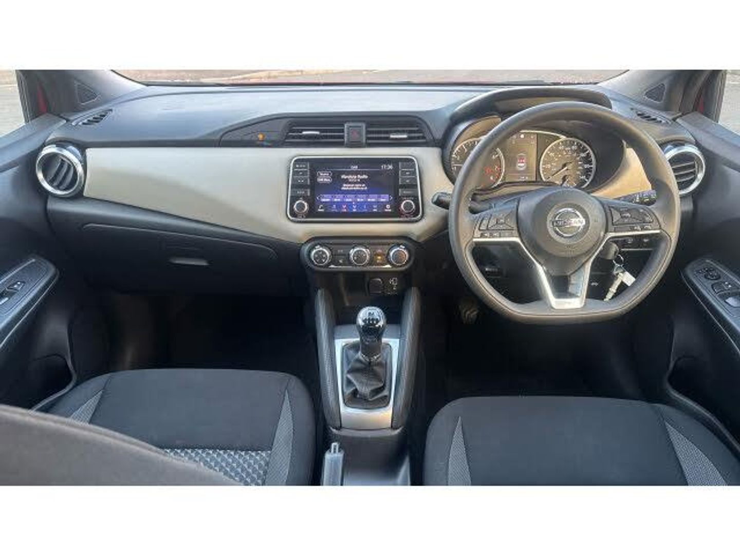 Rear wiper with reverse link, Rain sensor windscreen wipers, Power front windows, Variable front intermittent wipers, Intelligent emergency braking with pedestrian recognition, ABS+EBD+Brake assist, Hill start assist, Bluetooth system, Adjustable speed limiter, Power assist steering, Lane departure prevention, Cruise control, Lane departure warning system, Traffic sign recognition, Engine start button, Stop/start system, Smartphone integration with Apple CarPlay and Android auto, Advanced drive assist display 5'' TFT coloured screen, Nissan connect display audio, Outside temperature gauge, Trip computer, eCall emergency call system, Electrically adjustable door mirrors, Body coloured door mirrors, Door mirror integrated indicators, Audio system with MP3, 4 speakers, Steering wheel mounted audio controls, DAB Digital radio, USB/iPod connection, Concealed rear door handles, Jacknife key type x1, Rear roof spoiler, Antenna, Body coloured bumpers
