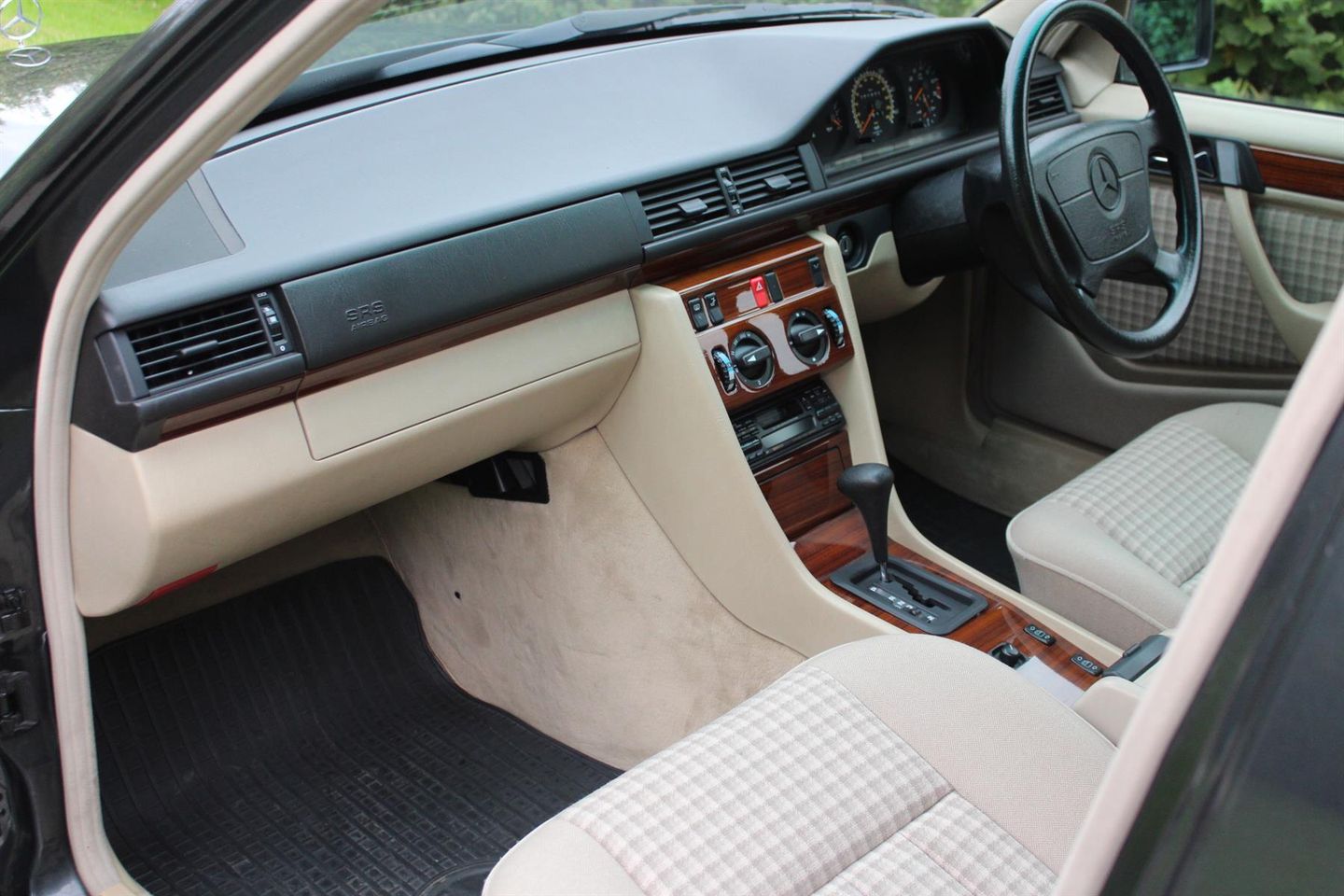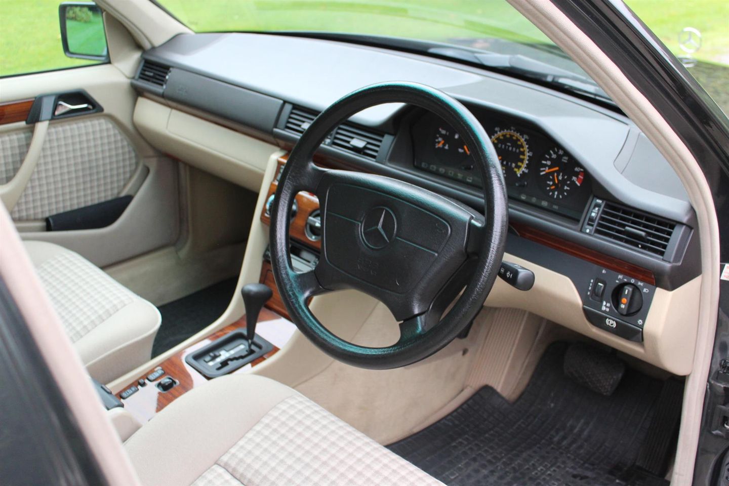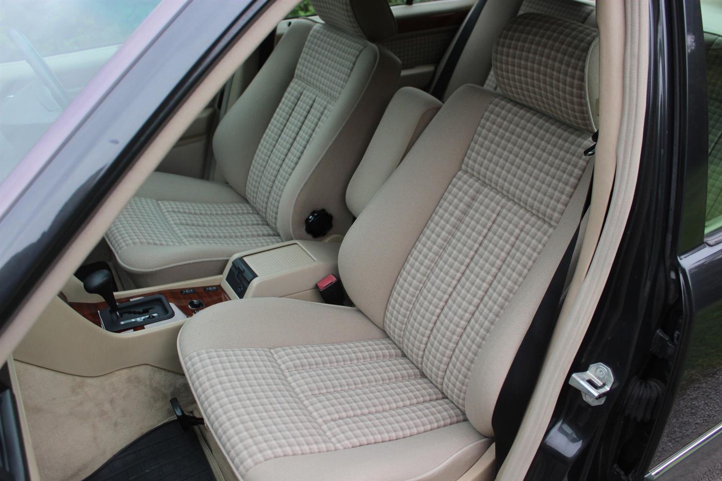 This example was registered 2nd November 1994 at Mercedes Benz in Edgeware London, and was finished in Black pearl metallic (paint code 199). The interior combination chosen was a cream cloth with checked inlays and wood trim.