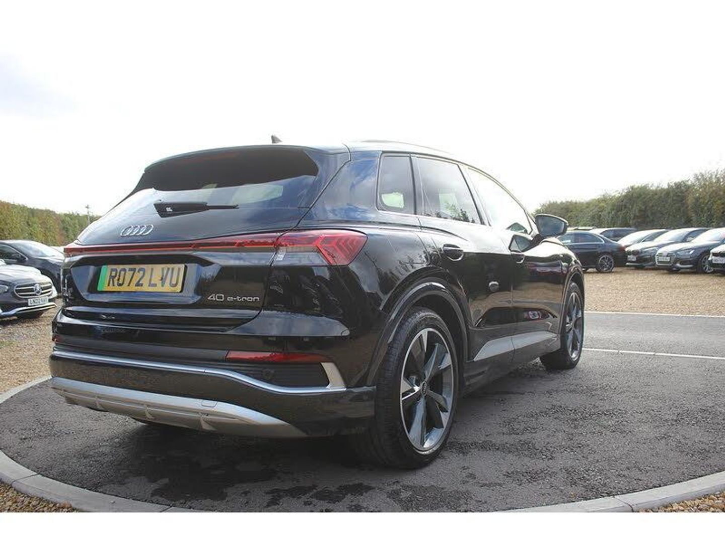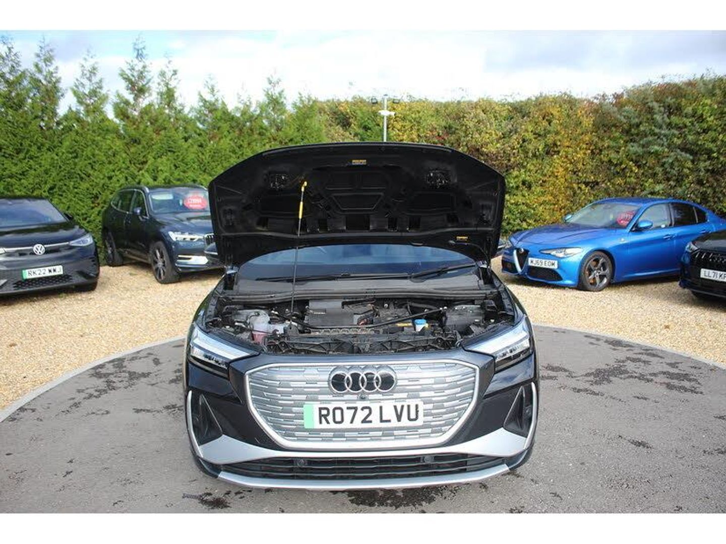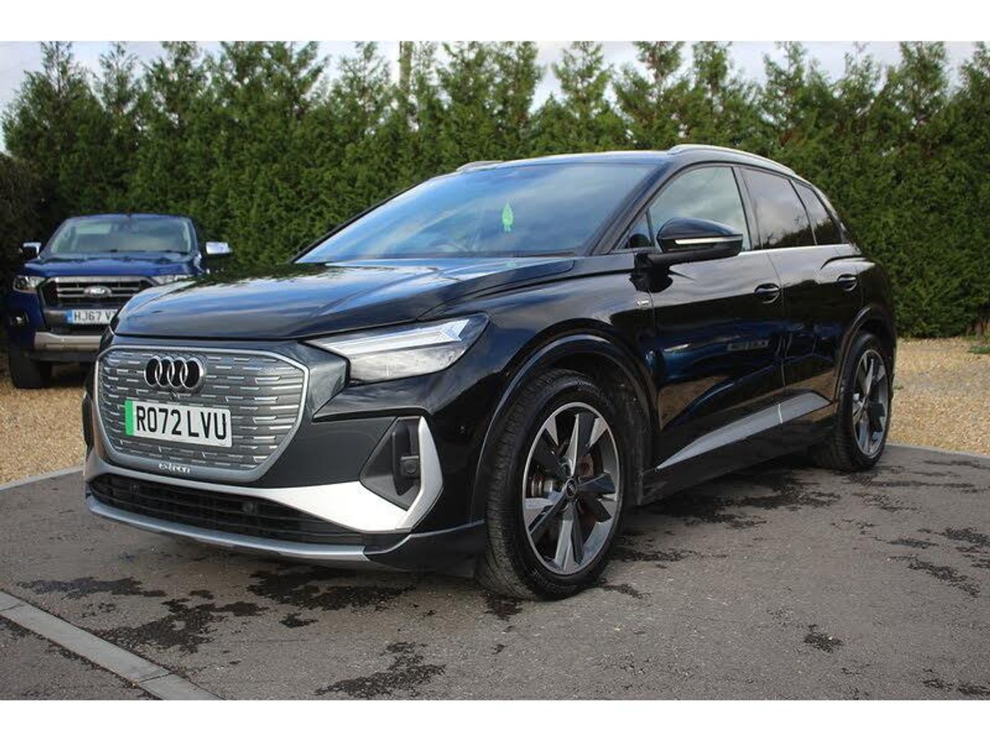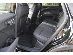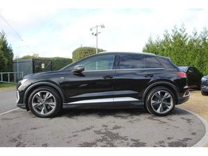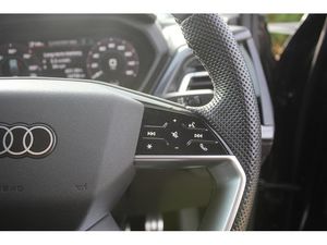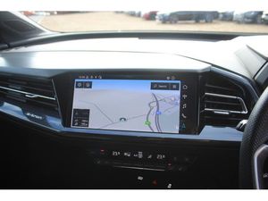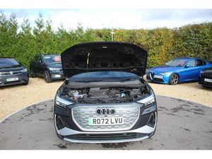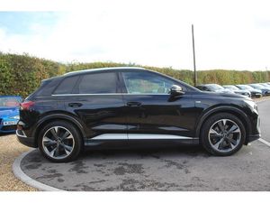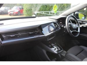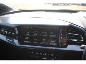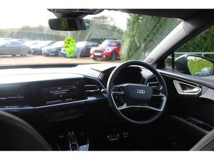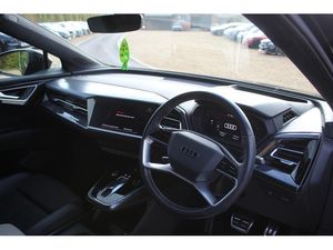 Audi connect safety and service (e-call), Audi drive select, Audi Smartphone Interface with wireless functionality, Audi Virtual Cockpit - 10.25" display, Bluetooth interface, Camera based traffic sign recognition, Lane departure warning system, MMI Navigation Plus with high resolution 11.6 inch touchscreen colour display, Power operated tailgate, Progressive steering, Swerve assist and turn assist, 11KW onboard charger, 135kW DC charging capability, AC and DC charging access point positioned on the rear right, Compact e-tron charging system, Household plug type G (GB), Industry plug CEE 32 A/230 V/6 h/long + straight, Mode 3 AC charging cable 22 kW, Sports suspension with 15mm lower, 2 USB-C ports with charge and data functions, Audi sound system with 8 speakers, DAB Digital radio, 3rd brake light, Acoustic glass windscreen, Aluminium roof rails, Body coloured door mirrors, Contrast bumpers in Manhattan grey, Electrically adjustable/heated/folding/auto dimming door mirrors with integrated LED indications + kerb view function for passenger side, Frameless auto dimming interior rear view mirror, LED daytime running lights, Projection light in the exterior mirrors, e-tron logo projected from the underside of the exterior mirror onto the ground, Rear side wing doors, Rear wiper, S line badges on front wings, S line exterior styling, Side and rear window privacy glass, Single frame grille with a structured, closed surface within an octagonal shape, 3 seat bench in 2nd row, 3 zone automatic air conditioning, 4 way electric lumbar support for driver and front passenger, Accent surfaces in gloss black - centre console control panel, switch panel and trim on front doors in gloss black, Auxiliary air conditioning, Black cloth headlining, Comfort front centre armrest, Driver/passenger manual seat height adjustment, Front and rear head restraints, Front door sill trims with aluminium inlay, illuminated with S logo, Heated front seats, ISOFIX child seat mounting for front passenger and outer rear seats including top tether attachment point of outer rear seats, Single front passenger seat, Stainless steel pedals, Gloss styling pack - Q4 E-tron, Non smoking pack - Q4 E-tron, 3x3 point rear seatbelts, Active vehicle alerting system (AVAS), Driver and front passenger airbag with passenger airbag deactivation, Electric child locks, Front side airbags with head airbags and interaction airbag, Pre-sense front with pedestrian and cyclist detection, Seatbelt warning, Tyre pressure loss indicator, Warning triangle and first aid kit, Anti theft alarm, Anti-theft wheel bolts, Keyless Go, Aluminium look interior elements, Inlay in dark matt brushed aluminium, accent surfaces on instrument panel and centre console trim in chrome paint finish, slate grey, Tool kit