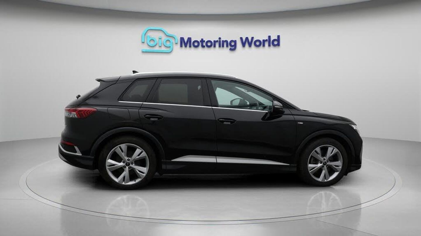 FREE £750 towards your finance-Our Audi Q4 e-tron is finished in Black. Specification includes a range of fantastic features including FREE £750 towards your finance Deposit, Apple CarPlay, Lane Assist, S Line Body Styling, Android Auto, Satellite Navigation, Privacy Glass, Heated Seats, Bluetooth, Parking Sensors Specification information is supplied by CAPHPI and may vary to the actual car. This data does not form any part of a buying contact. Please check specification prior to purchase in-store. The MOT is valid until October 2026, visit bigmotoringworld.co.uk for more photos, a 360 tour, service history and a free HPI report.Were BIG on peace of mind and this Black Audi Q4 e-tron has completed our comprehensive 200 point inspection and passed all checks. Its ready for you to drive away with immediate collection in-store. We include a 90-day warranty as standard plus an option to extend for up to 3 years.Reserve this car exclusively for you, safely and securely at bigmotoringworld.co.uk, with a fully refundable £99 deposit. Test drive before you buy, with no commitment, no hassle and a completely haggle free experience. Still searching and want to see thousands more cars? We are BIG on choice with over 8000 cars to choose from.Visit our award winning web site bigmotoringworld.co.uk.Were Big Motoring World and were BIG on what matters to you.