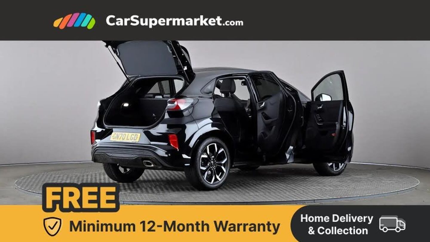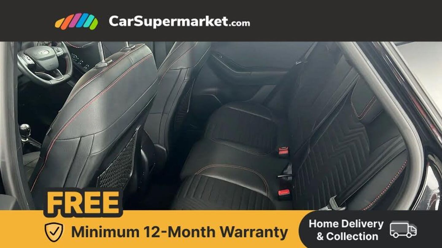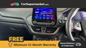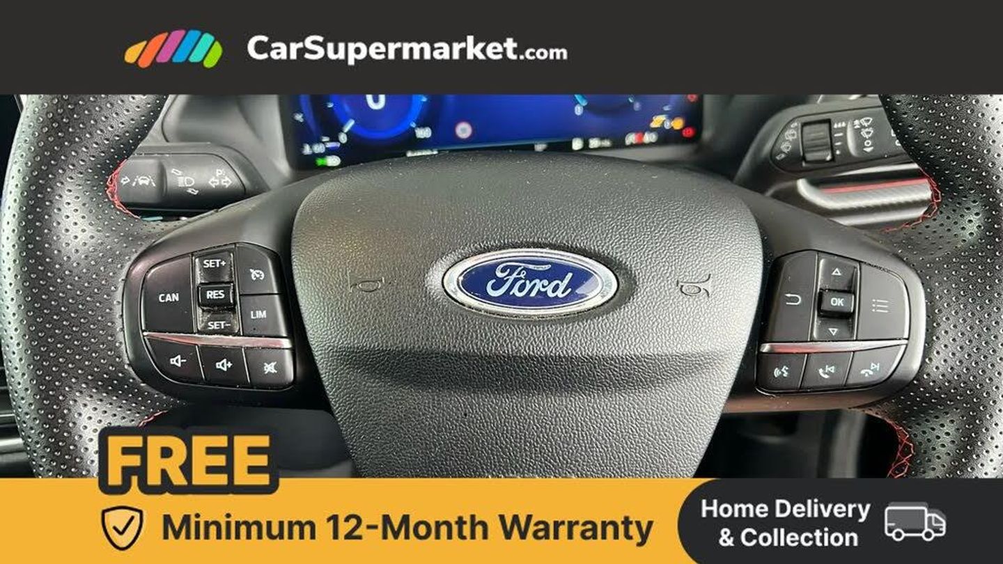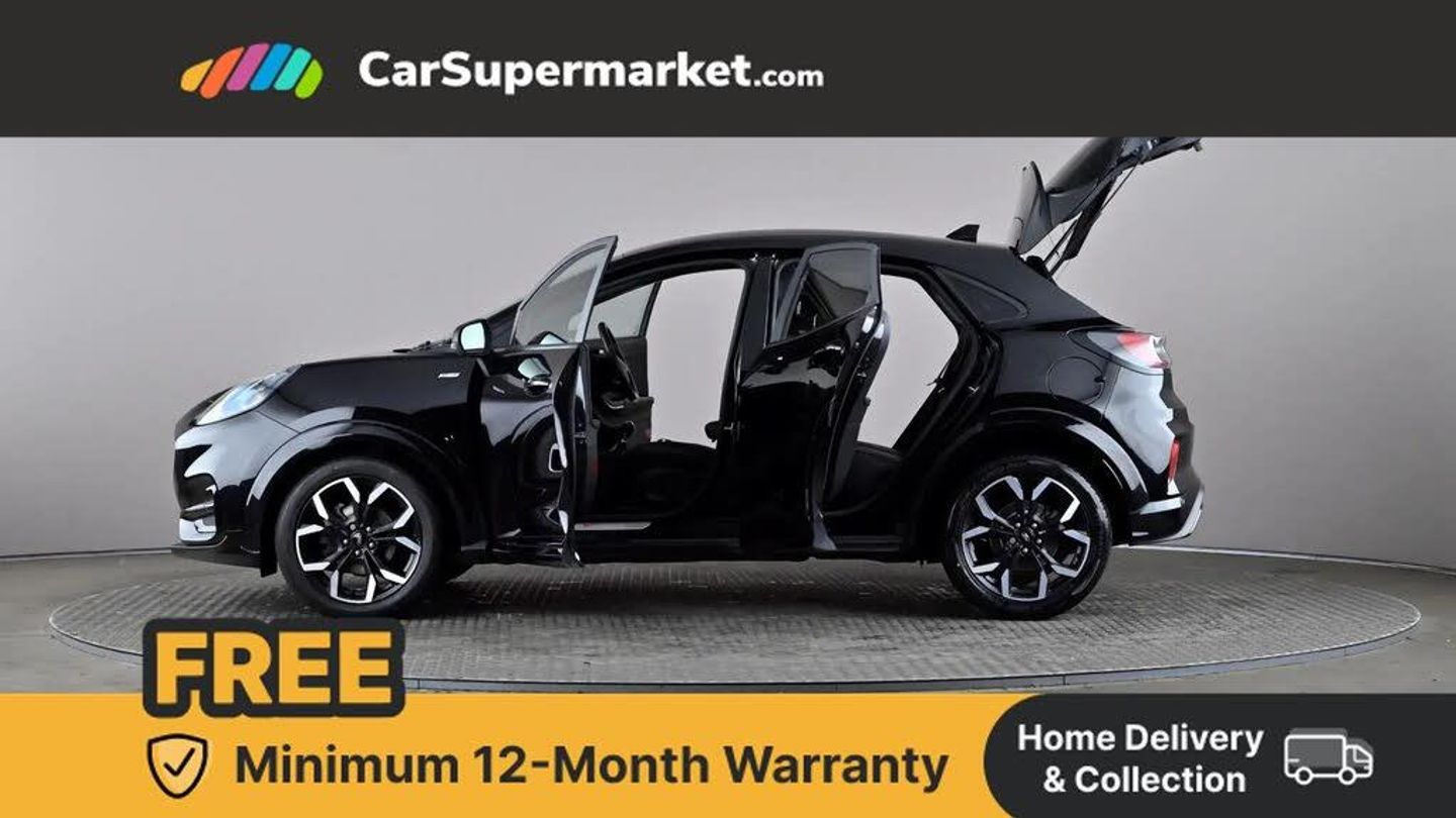 Ford easy fuel,Full digital 12.3" instrument cluster,Lane keeping aid with lane departure warning,Power assist steering,Rear parking sensor,Selectable drive modes(Normal, sport, Eco, trail, slippery),Wireless charging pad,Automatic headlights with rain sensing wipers and auto high beam,Body coloured door mirrors,Front fog lights with cornering lights and LED rear lamps,Power foldable heated door mirrors with puddle lamps,Privacy glass to side rear windows and tailgate glass,Quickclear heated windscreen,Rear wiper,ST-Line body kit with large rear spoiler wth sports suspension,Alloy sports pedals,Casual partial leather upholstery with salerno bolster,Centre console with armrest and stowage,Driver and passenger seat lumbar and height adjust,Ford megabox extended bootspace,Front and rear head restraints,Manual air conditioning,ST-Line flat bottomed sensico leather steering wheel with leather handbrake and aluminium gear knob,B&O Premium Audio system + Ford SYNC 3 navigation pack - Puma,3 rear seatbelts,Electronic stability control (ESC) and hill start assist,Pre-collision assist with autonomous emergency braking, pedestrian/cyclist detection & post-collision braking,Tyre pressure monitoring system (TPMS),Thatcham alarm,Carbon look interior deco spears,Tyre inflation kit