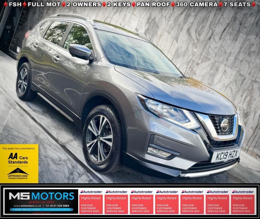18in Alloy Wheels - Machine Cut, 5in High Definition Full Colour TFT Screen Combimeter, 6 Airbags, ABS with EBD and Brake Assist, Alarm - Thatcham, Anti Dazzle Rear View Mirror, Automatic Headlights - Dusk Sensor, Bluetooth with Microphone, Body Coloured Door Mirrors, Centre Console Storage and Armrest, Chrome Window Surrounds, Cruise Control with Speed Limiter, DAB-AM-FM-CD BOSE 8 Speaker Premium Audio System, Door Handles - Chrome, Dual Zone Automatic Air Conditioning with Pollen Filter, ESP - Electronic Stability Programme, Electric Heated - Automatic Folding Door Mirrors with Side Turn Signal Light, Engine Immobiliser, Engine Start Button, Front Fog Lights, Front Row Ventilated Cupholders, Front and Rear Armrests, Front and Rear Door Pockets with Drink Holders, Front and Rear Electric Windows, Front and Rear Parking Sensors, Front and Rear Seatbelt Warning, Halogen Headlamps, Handsfree Automatic Opening Power Tailgate, Head Restraints - 3 Rear, Height Adjustable Front Head Restraints, ISOFIX Child Seat Anchoring Points, Individual Rear Seat Reading Lights, Intelligent Around View Monitor, Intelligent Emergency Braking with Pedestrian Recognition, Intelligent Key, LED Daytime Running Lights, Lane Departure Warning, Leather Steering Wheel and Gear Knob, Luggage Board System, Manually Adjustable Drivers Seat - Slide - Recline - Lifter and Lumbar, Manually Adjustable Passenger Seat - Slide - Recline and Lifter, Nissan Chassis Controls, Nissan Connect EVO 7in Touchscreen Navigation and Entertainment System, Panoramic Sunroof with One Touch Shade, Power Assisted Steering, Rain Sensing Windscreen Wipers, Rear Door Child Locks, Rear Privacy Glass, Rear Split Folding - Reclining and Sliding - 60-40, Remote Central Locking with Superlocking, Roof Rails - Satin, Shark Fin Antenna, Smartphone App Integration, Spare Wheel, Steering Wheel Mounted Audio Controls, TPMS - Tyre Pressure Monitoring System, Tilt and Telescopic Adjustable Steering Wheel, Traffic Sign Recognition, Trip Computer, USB-AUX Socket Input, e-PKB - Electric Parking Brake, Seats - 7-Seat Upgrade, Cloth - Graphite