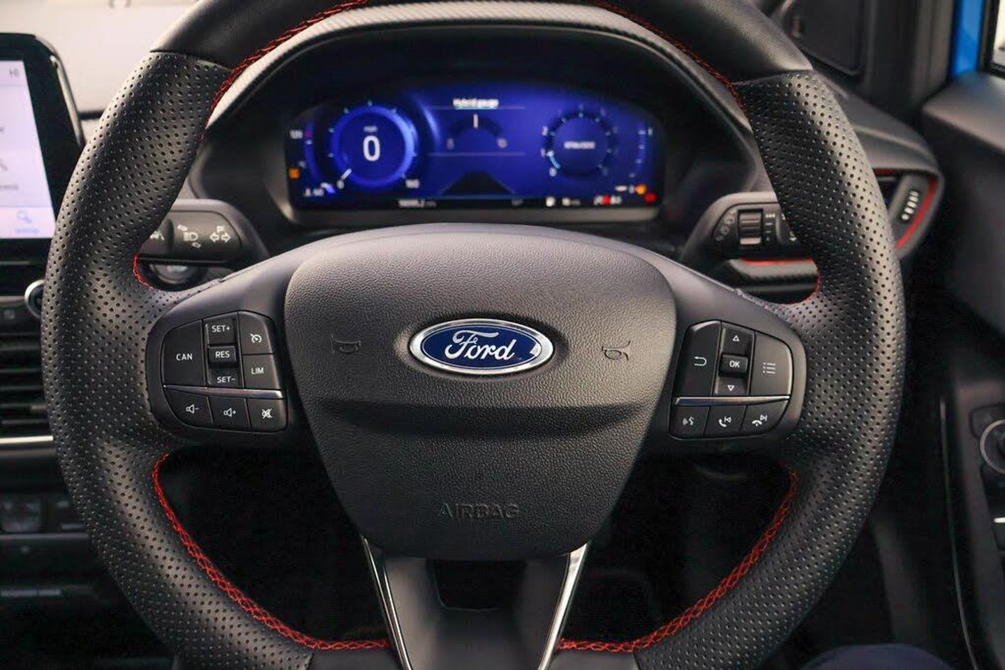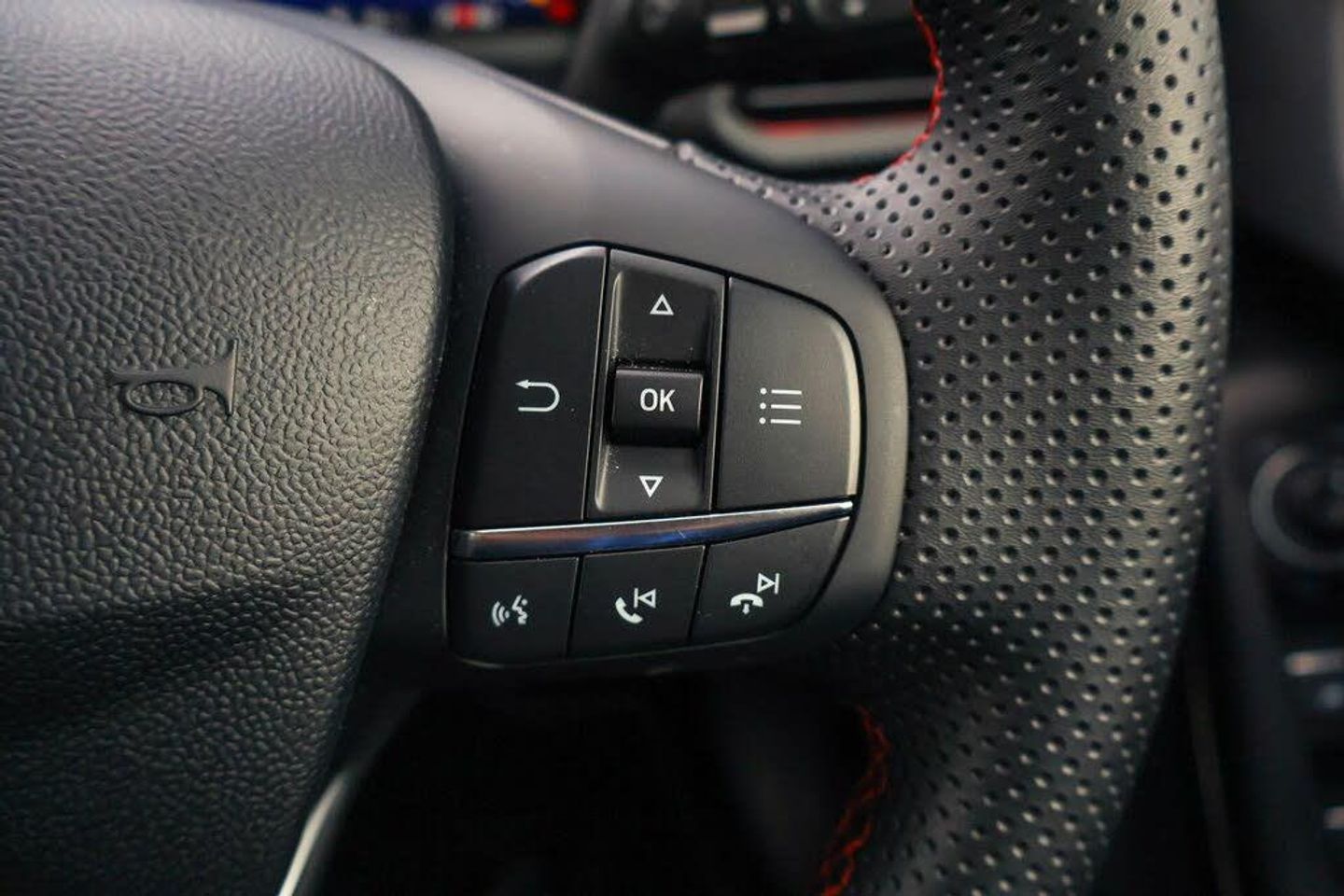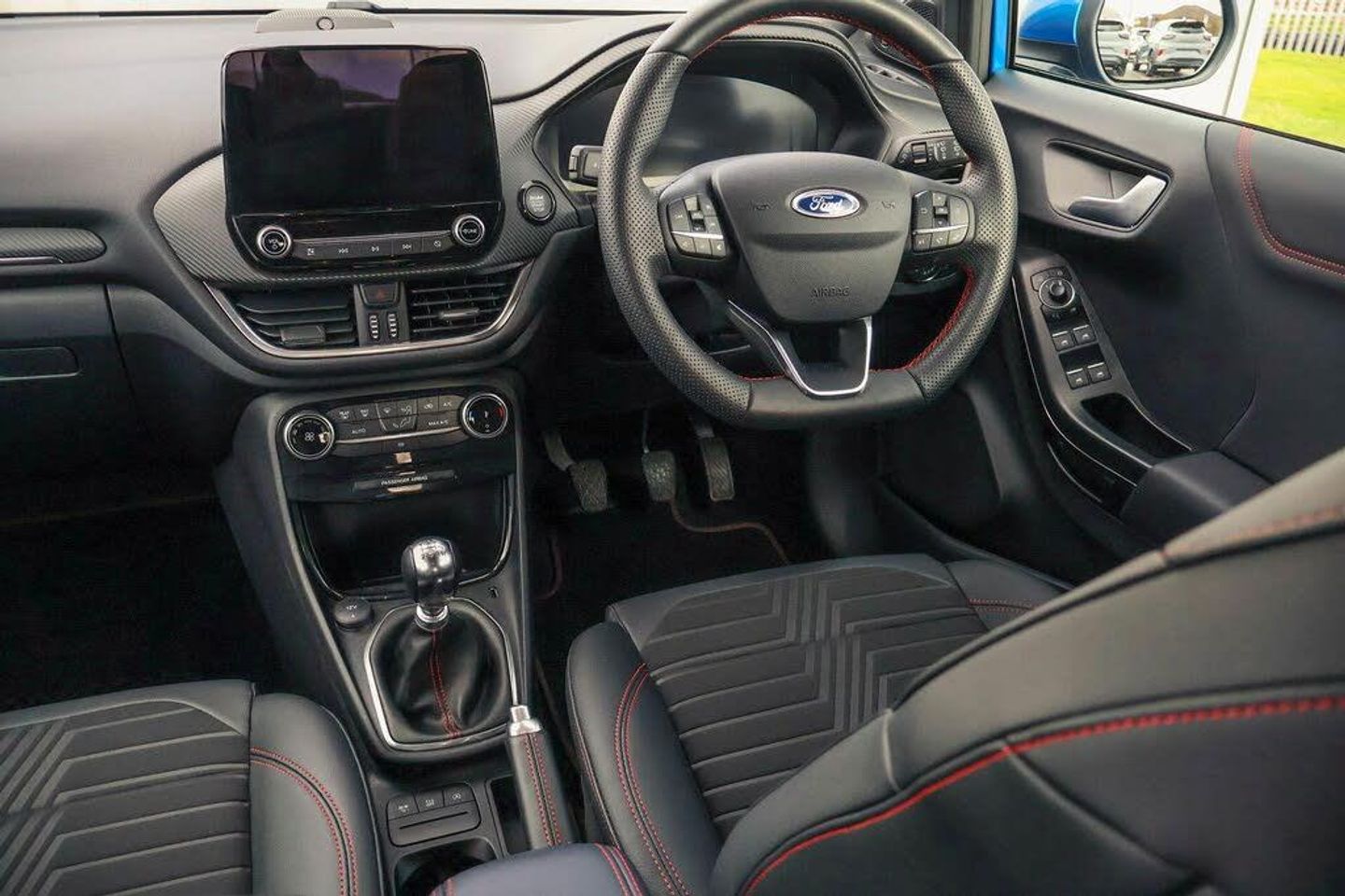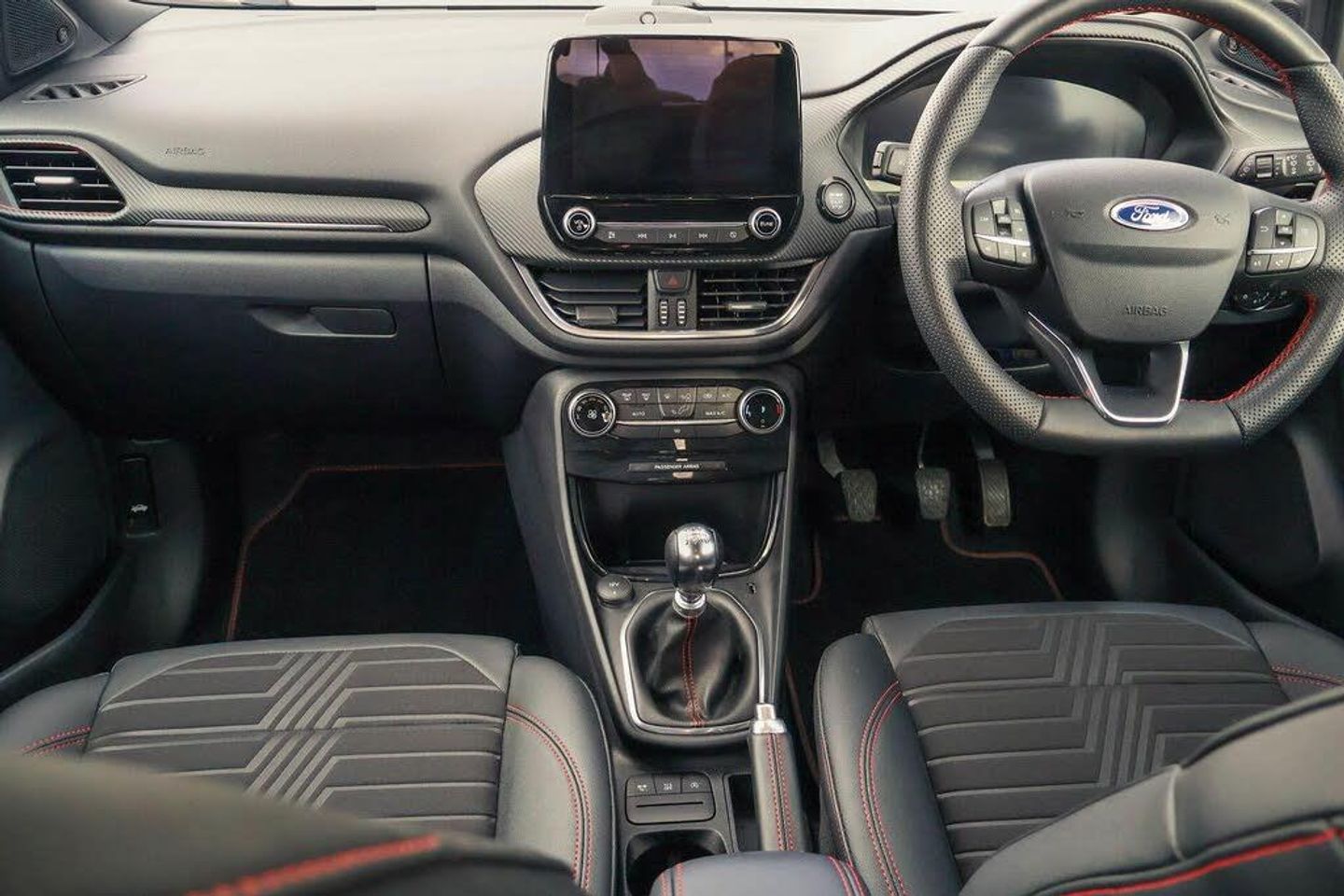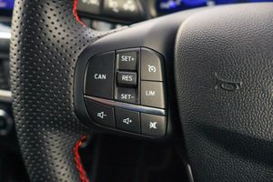 Driver impairment monitor, Emergency call service, Ford easy fuel, Full digital 12.3" instrument cluster, Lane keeping aid with lane departure warning, Power assist steering, Power start button, Rear parking sensor, Selectable drive modes(Normal, sport, Eco, trail, slippery), Speed sign recognition, Automatic headlights with auto high beam, Automatic rain sensing wipers, Front fog lamps, LED daytime running lights, LED rear lamps, Power foldable heated door mirrors with puddle lamps, Privacy glass to side rear windows and tailgate glass, Quickclear heated windscreen, Rear side wing doors, Rear wiper, ST-Line body styling kit with unique grille, Third brake light, 3 seat bench in 2nd row, Centre console with armrest and stowage, Ford megabox extended bootspace, Front and rear head restraints, Front floor mats, Manual 4 way driver seat adjust with lumbar adjustment, Manual 4 way passenger seat with lumbar seat adjustment, Sensico partial premium upholstery, Single front passenger seat, ST-Line flat bottomed sensico leather steering wheel with leather handbrake and aluminium gear knob, Wireless charging pad with electronic air temperature control (EATC), Thatcham alarm, Partial Premium Sensico - Black with Red Stitching