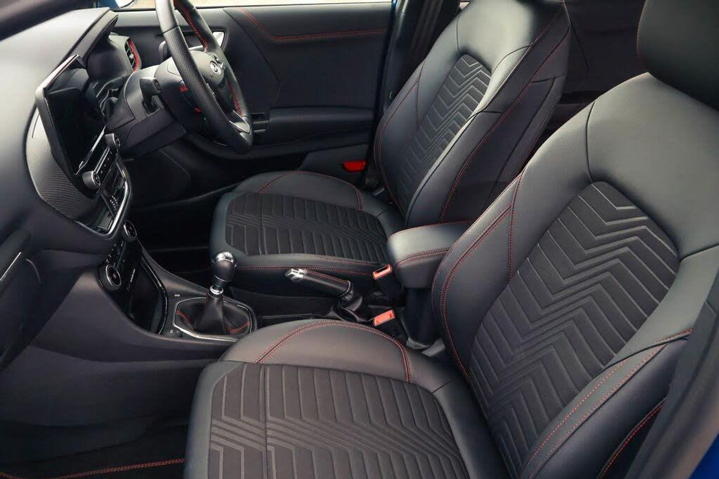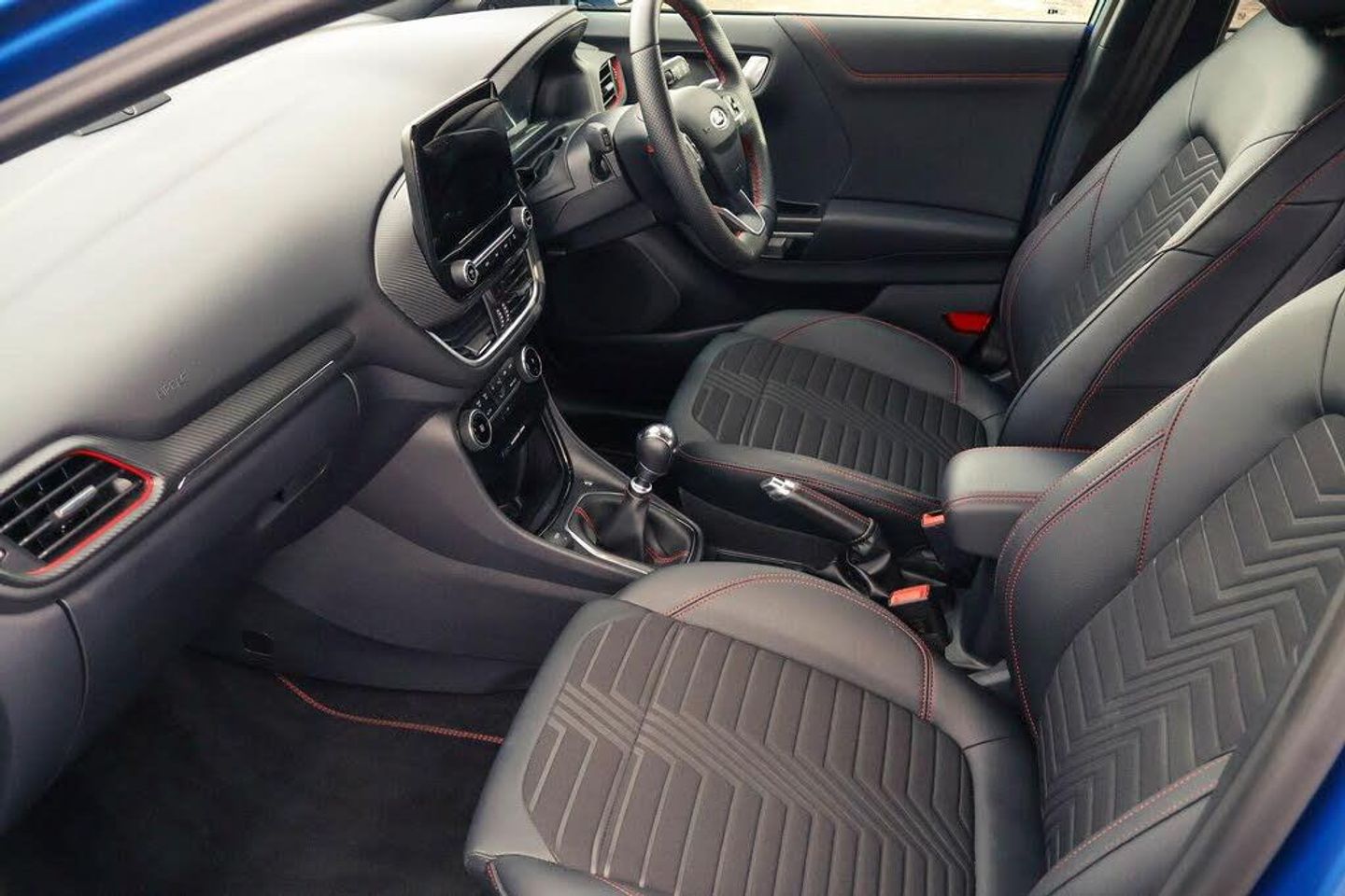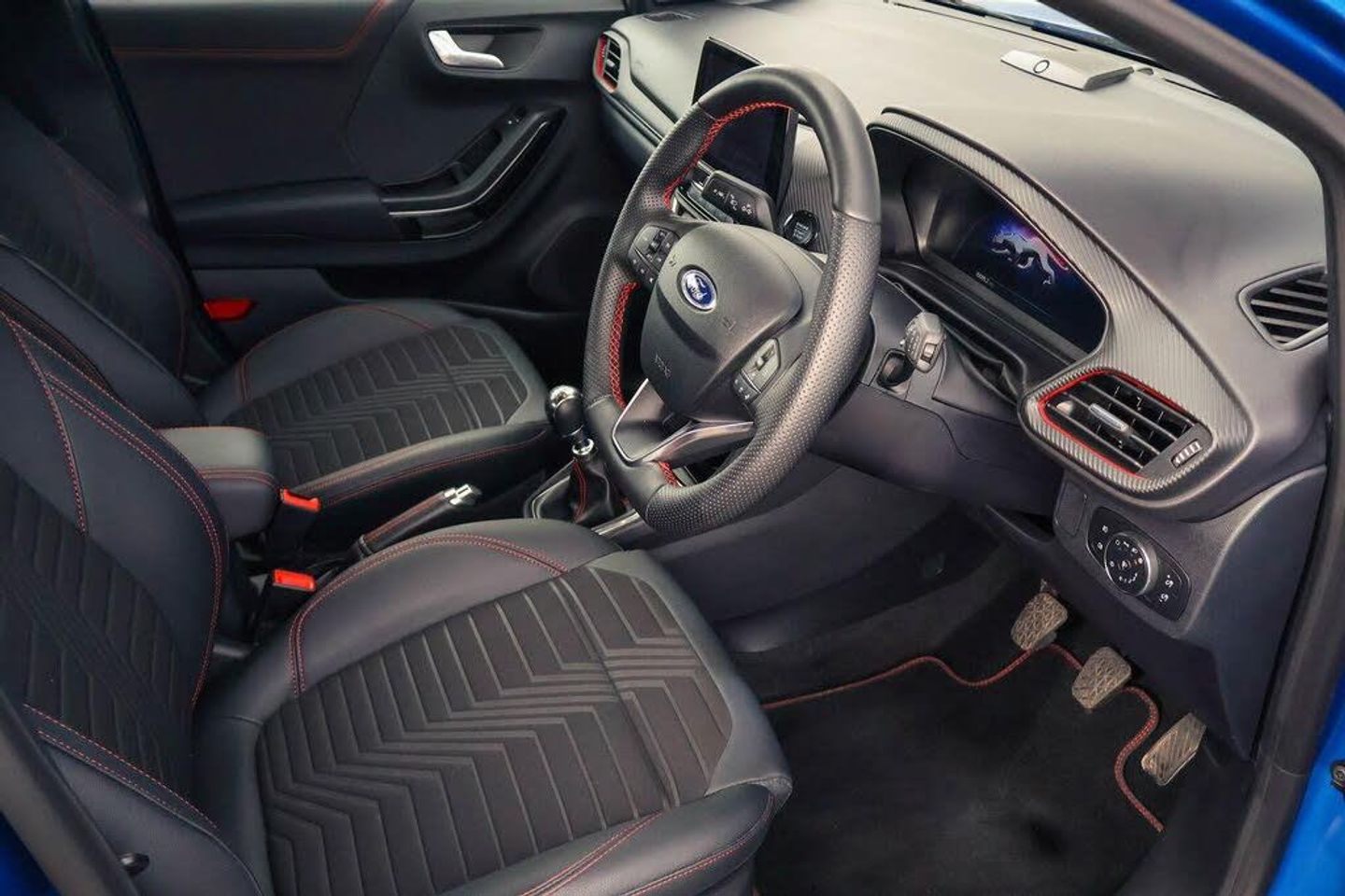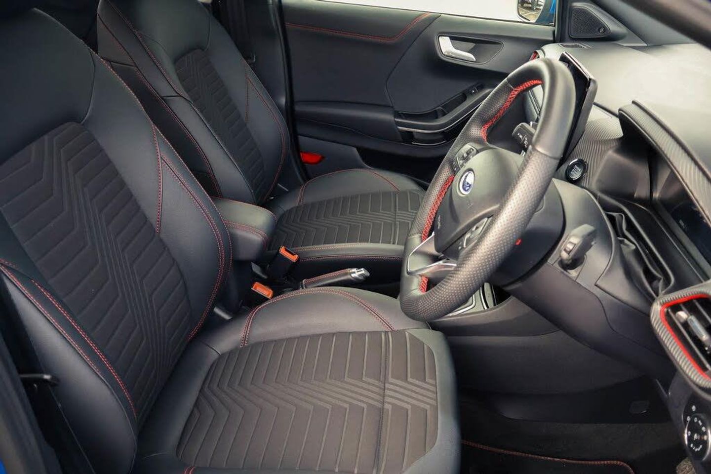 Driver impairment monitor, Emergency call service, Ford easy fuel, Full digital 12.3" instrument cluster, Lane keeping aid with lane departure warning, Power assist steering, Power start button, Rear parking sensor, Selectable drive modes(Normal, sport, Eco, trail, slippery), Speed sign recognition, Automatic headlights with auto high beam, Automatic rain sensing wipers, Front fog lamps, LED daytime running lights, LED rear lamps, Power foldable heated door mirrors with puddle lamps, Privacy glass to side rear windows and tailgate glass, Quickclear heated windscreen, Rear side wing doors, Rear wiper, ST-Line body styling kit with unique grille, Third brake light, 3 seat bench in 2nd row, Centre console with armrest and stowage, Ford megabox extended bootspace, Front and rear head restraints, Front floor mats, Manual 4 way driver seat adjust with lumbar adjustment, Manual 4 way passenger seat with lumbar seat adjustment, Sensico partial premium upholstery, Single front passenger seat, ST-Line flat bottomed sensico leather steering wheel with leather handbrake and aluminium gear knob, Wireless charging pad with electronic air temperature control (EATC), Thatcham alarm, Partial Premium Sensico - Black with Red Stitching
