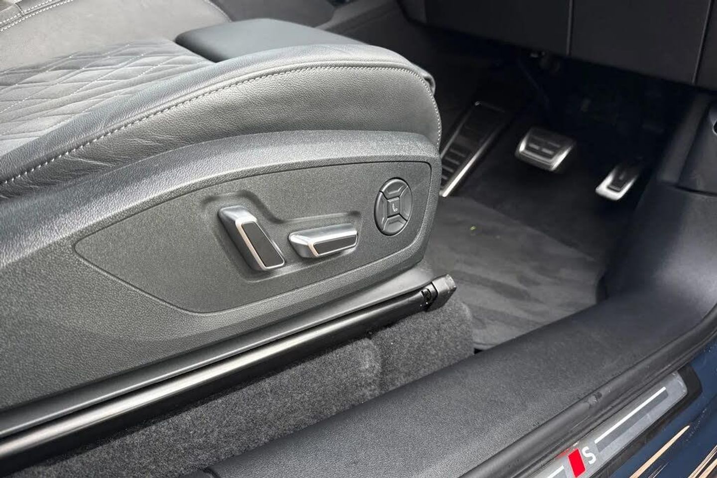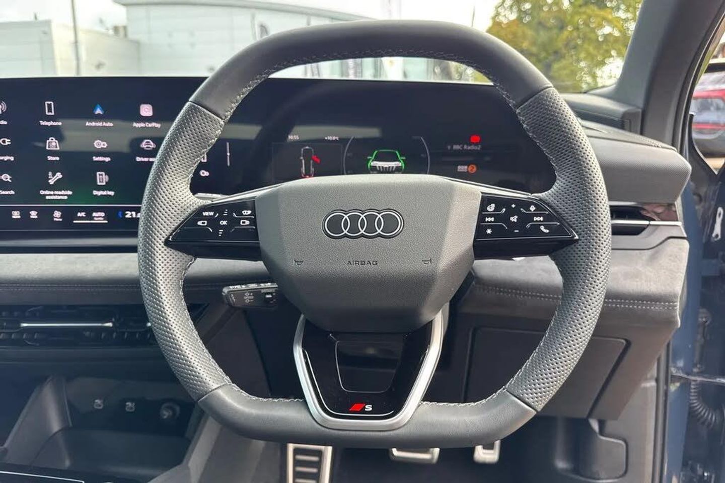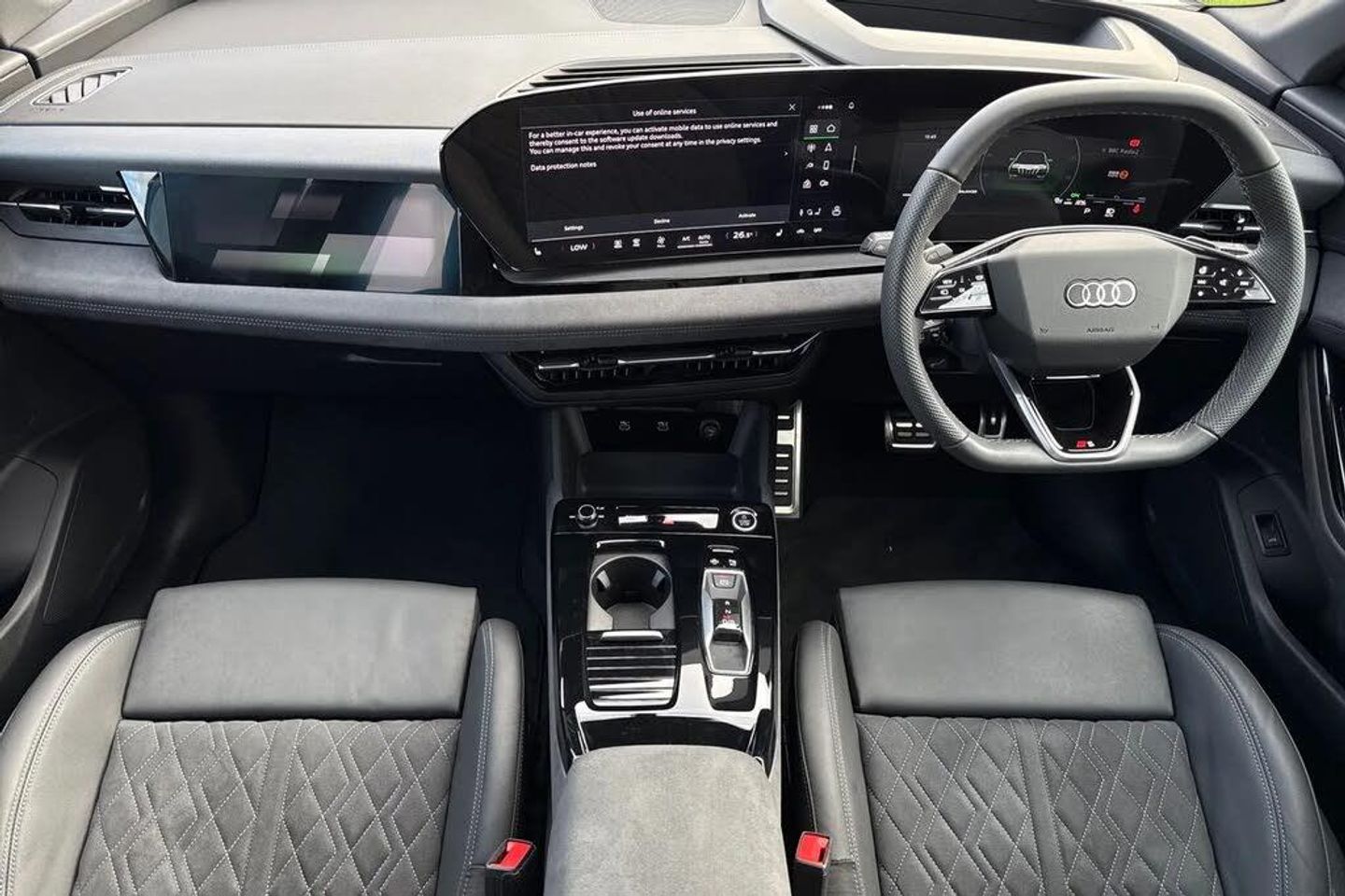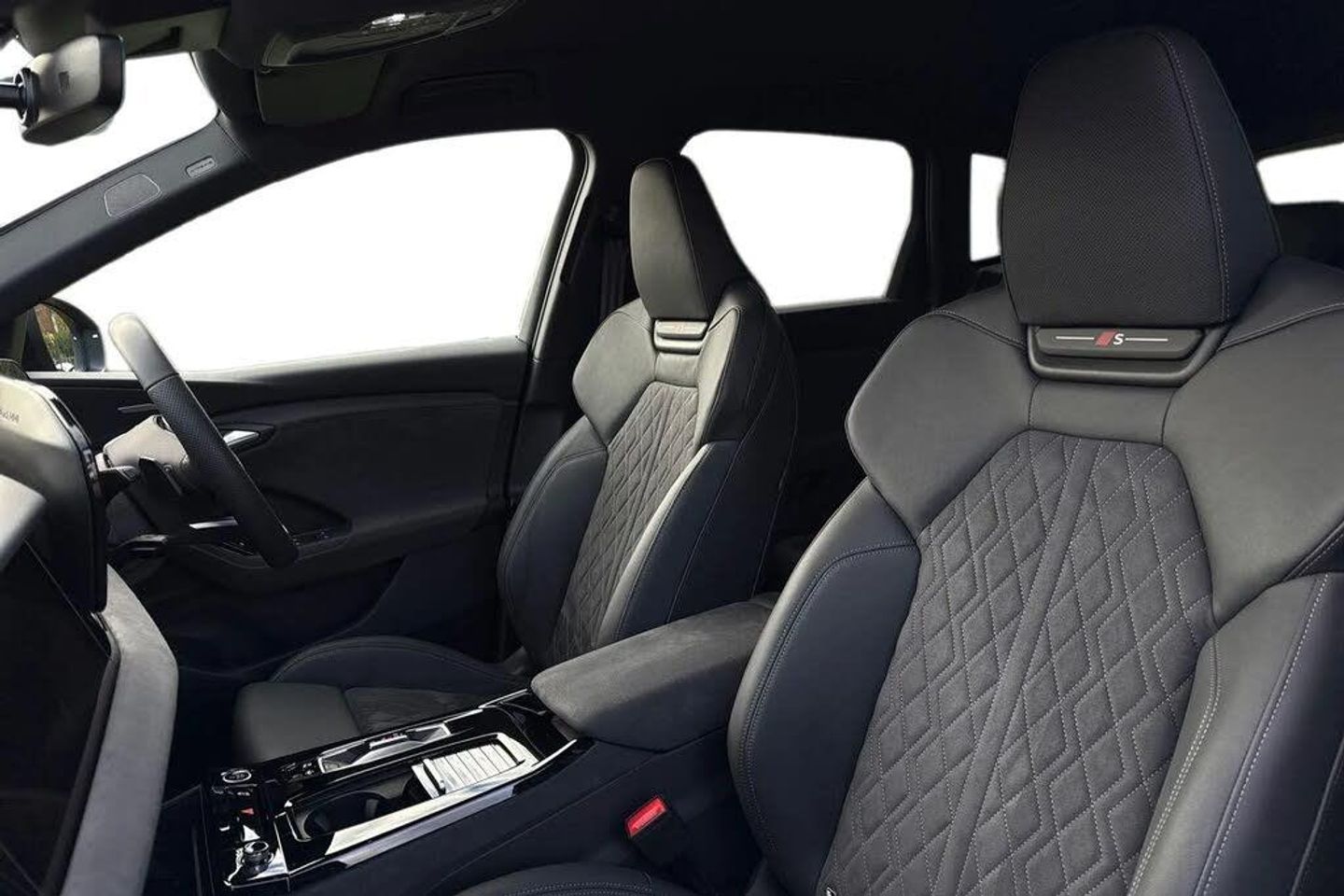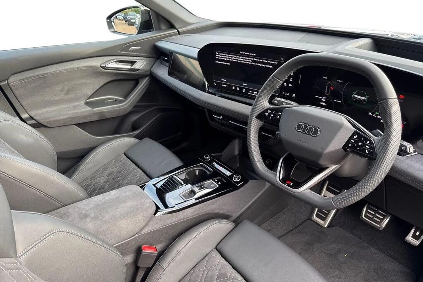 Memory function for the driver seat and the exterior mirrors,Steering wheel heating,21" x 9.0J | 10.0J 5-arm 'aero' metallic black gloss turned finish Audi Sport alloy wheels with 255/45 | 285/40 R21 tyres,Full paint finish,Without customized installation,Comfort auxiliary air conditioning,e-tron sport sound,MMI front passenger display,Intersection assist,Augmented reality head-up display,Digital light signatures,Dinamica microfiber/leather combination with diamond stitching,Exterior package - Black,Brake calipers painted Red,Tech plus,Interior package with front sport seats plus in black Dinamica microfiber* and leather combination with diamond stitching with integrated headrest,Assist package - protective and warning systems plus,Sun protection glass - tinted,Ambient lighting package plus with dynamic interaction light,Sport seats plus - front,Upper and lower interior elements in Dinamica microfiber,Increased charging capacity for USB ports,Stainless steel pedals and footrest,Door sill trims with aluminum inlays - front - illuminated - S logo,Equipment package for Great Britain,Sound and Vision Pack,Internal control code,Floor mats - front and rear,Without special color trim,S sport suspension,Sport leather steering wheel - 3-spoke - flat top and bottom with multifunction and shift paddles,Disk brakes - front - 18-inch - brake calipers in Red,Disk brakes - rear - 18-inch - brake calipers in Red,Bumpers - S line,Front seats - electrically adjustable,Roof rails in Black,Seat heating - front and rear,Without seat ventilation/massage seat,Swerve assist and turn assist,Black styling package plus,Decorative inserts in Anthracite technical fabric,Rear occupant detection,Front head restraints,Side airbags - front and rear with head airbag system and interaction airbag - front,Black exterior mirror housings,Steering wheel trim in chrome look with "S" badging - steering wheel side parts in perforated leather with contrast stitching,Lane departure warning with emergency assist,Headlining in cloth - Black,Upper part of instrument panel - Black with contrasting stitching,Proactive occupant protection - front - side and rear,Lane change assistant and exit warning system - rear cross traffic assist and rear turn assist,Matrix function,LED headlights plus,Lumbar support - pneumatically adjustable with massage function for the front seats,Front emergency brake assist,Bang & Olufsen premium sound system with 3D sound and integrated headrest speakers,LED rear lights pro,Headlight cleaning system,Convenience package 2 (only for Audi/Bentley/commercial vehicles),Climate Control package for winter,MMI experience pro,Interior equipment 13,Equipment options subset for Great Britain