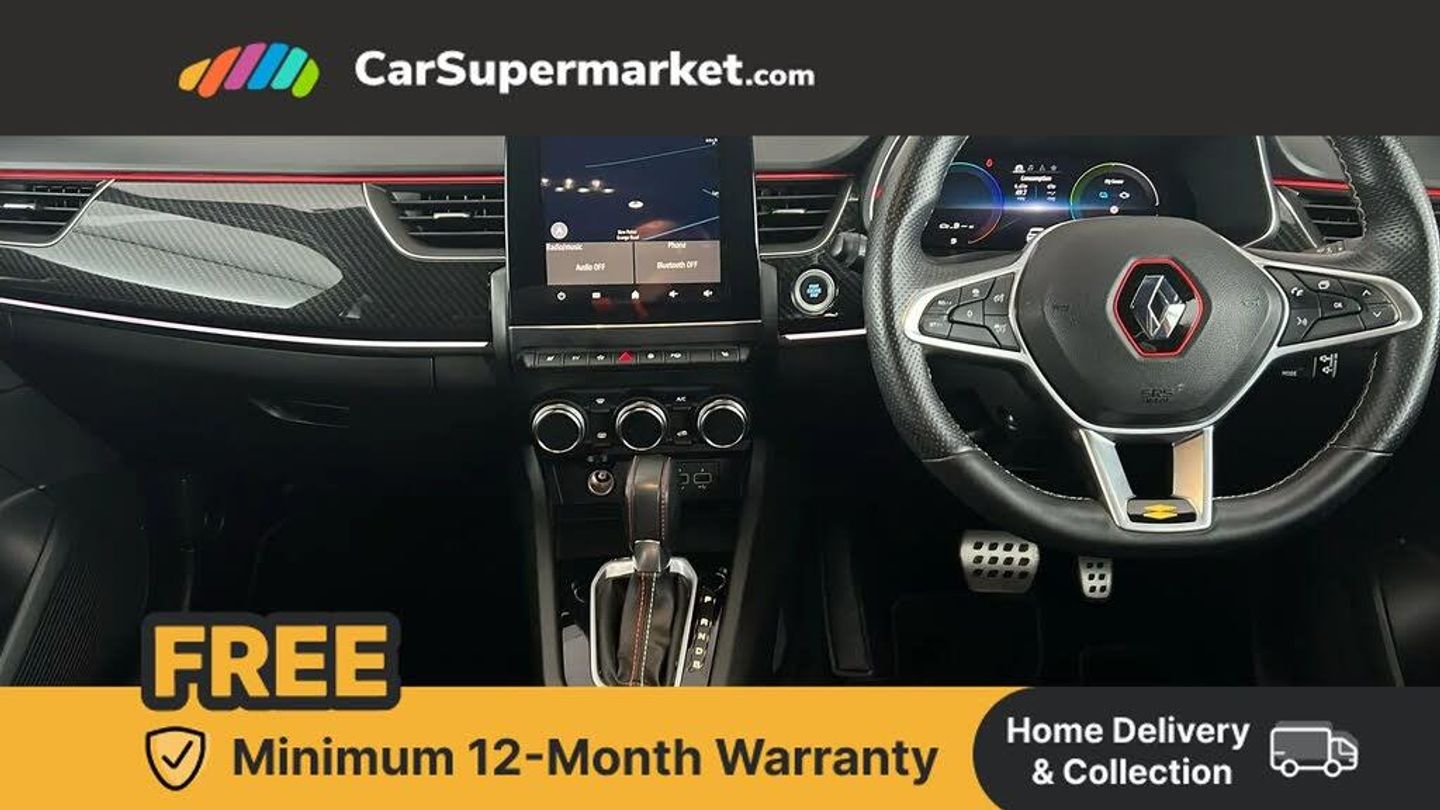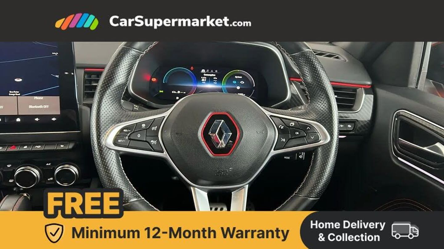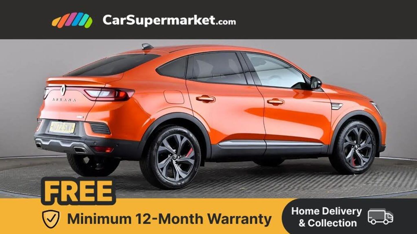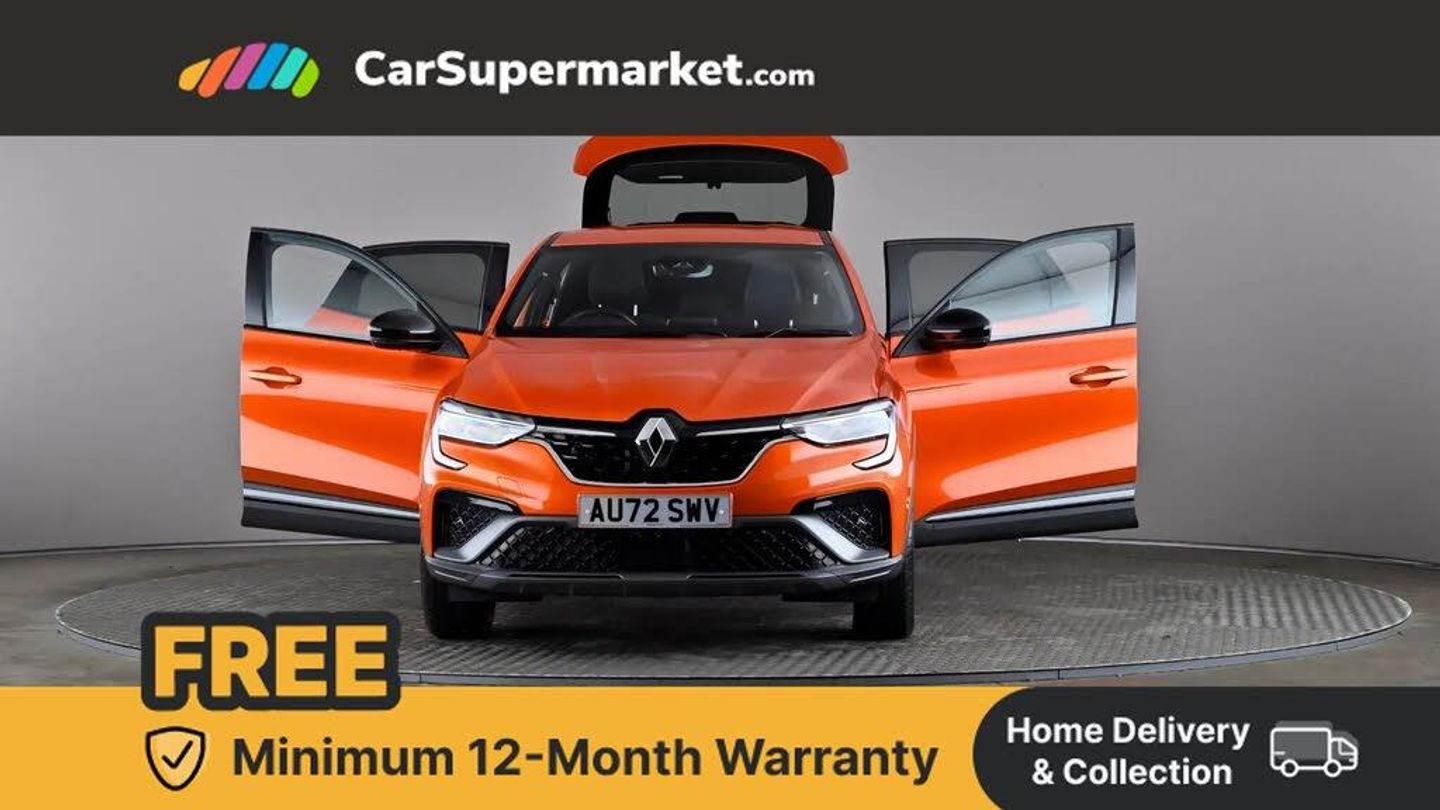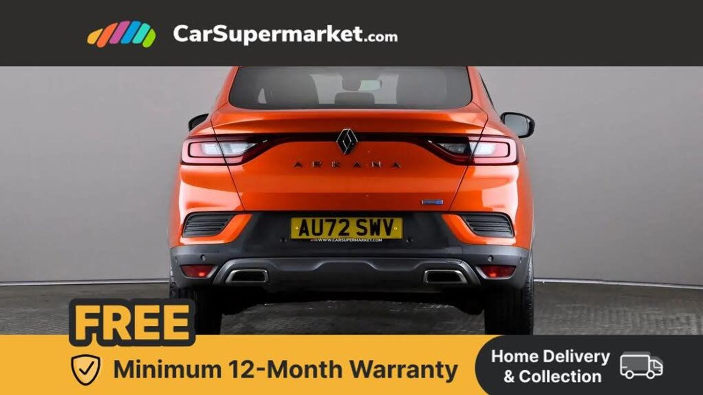 7" TFT Driver information display,Blind spot warning,Bluetooth system,EASY LINK 9.3" portrait touchscreen with navigation, Google search and traffic information,eCall emergency call system,Eco mode,EV button to activate pure mode,Front and rear parking sensors,Gear change indicator,Lane departure warning,Lane keep assist,Multi-sense - 3 driving modes and 8 ambient lighting,Rear cross traffic alert,Rear view camera,Renault automatic emergency assist,Smartphone integration compatible with Apple CarPlay and Android Auto,Traffic sign recognition with over speed prevention,Trip computer,Variable assistance electric power steering,Wireless phone charger,DAB radio,USB port,3rd brake light,Auto dimming rear view mirror,Automatic headlights,Automatic high / low beam,Automatic windscreen wipers with rain sensor,Black side door protection with gun metal insert,Body coloured bumpers,C-shaped LED front signature lighting,Chrome decopart on wing (fender molding) with R.S. Line badge,Double chromed exhaust tailpipes elements,Extra tinted rear windows and tailgate,Frameless rear view mirror,Front and rear electric windows,Front bumper with F1 blade and honeycomb front grille,Front driver window with one touch facility and anti-pinch function,Front grille with chrome on upper part,Full LED headlights,Glossy black door mirror and lower window lining,Gun Metal front and rear skid plates,Heated rear window,R.S. Line badges on front wing and hatch door,Rain sensor,Rear windscreen wiper,Shiny black shark fin antenna,Side mirrors adjustable electrically, electrically foldable, with defrosting and temperature sensor, automatically foldable at vehicle closure,3 seat bench in 2nd row,60:40 split and fixed base rear seats,Aluminium pedals,Automatic climate control with combined filter, humidity sensor and AQS,Black interior roof lining,Carbon style dashboard,Central console with storage,Driver's seat height adjustment,Electrically adjustable front seats,Front and rear head restraints,Height and reach adjustable steering wheel,ISOFIX child seat fixing points on rear outermost seats,LED front and rear roof lights,Passenger seat height adjuster,R.S. line black suede-leather upholstery with red/grey stiching,R.S. Line perforated leather steering wheel with red/black harmony and R.S. Line badge,Rear air vents,Red inserts on air vents,Single front passenger seat,Parking Pack - Hands-free parking & flank protection - Arkana,Winter pack - Arkana,3x3 point rear seat belts,ABS+EBA,Active emergency braking system,B Brake Mode - One pedal driving with increased regenerative braking,Distance warning alert,Driver airbag,Driver and passenger front and side airbag deactivation,Driver and passenger side airbags,Driver height adjustable seat belt,Electronic parking brake with auto hold,ESC (Electronic Stability Control),Front and rear no seatbelt warning sound,Front curtain airbags,Front head airbags,Hill start assist,Passenger airbag,Tyre pressure warning light,Anti drill door locks and locking fuel cap,Central door locking,Deadlocking system,Hands free keycard with Keyless access and start,RAID (Renault Anti-Intruder Device) automatic door locking,Rear side wing door and window child locking function (front driver door control panel),Superlocking,Thatcham alarm,18" Silverstone diamond alloy wheels with red inserts,Valencia Orange,RS Line Suede-Leather - Black with Red-Grey Stitching